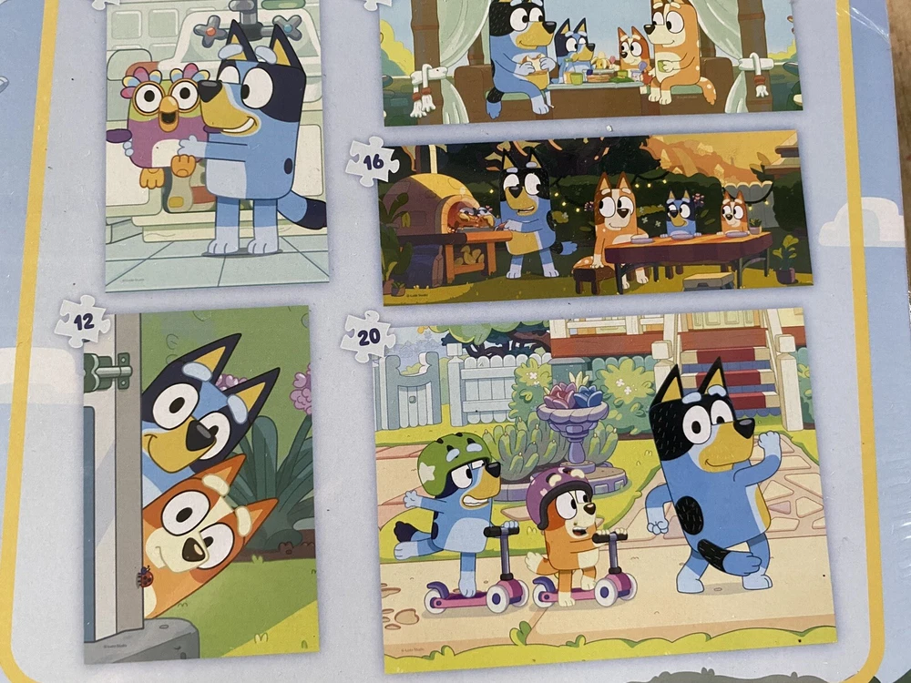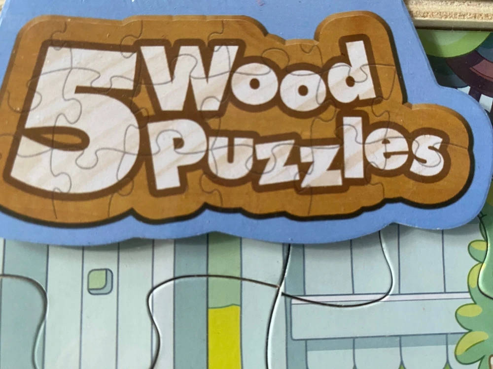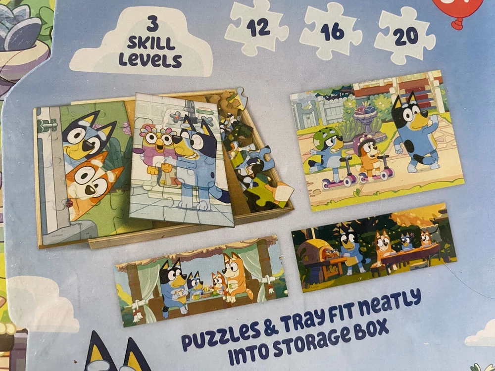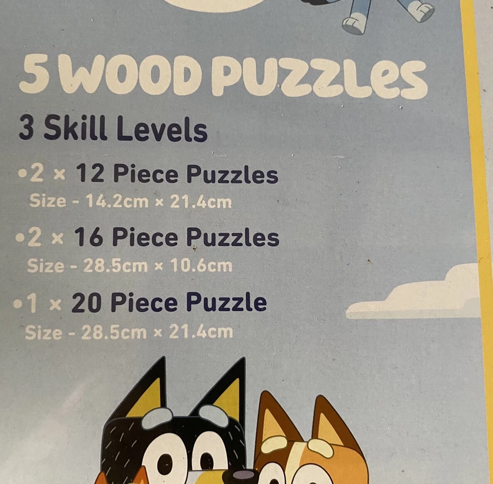 Piece together some family fun with the BLUEY 5 Wood Jigsaw Puzzles, featuring your favourite Heeler family dog in vibrant, multi-colourful scenes. Ideal for kids aged 3 and up, this set includes puzzles with 2x12, 2x16, and 1x20 pieces, catering to different skill levels and providing a rewarding challenge for young minds. Crafted from durable wood, these puzzles promise lasting quality and entertainment. Whether it's a rainy day activity or a fun family competition, these puzzles will engage and entertain any Bluey fan, encouraging problem-solving and fine motor skills. Complete with a sturdy wooden box, they make for a splendid gift or a cherished addition to any puzzle collection. Brand New & Sealed. Please refer to pics for further details. Thank you for shopping at Funkee Munkee New & Rescued Treasures.