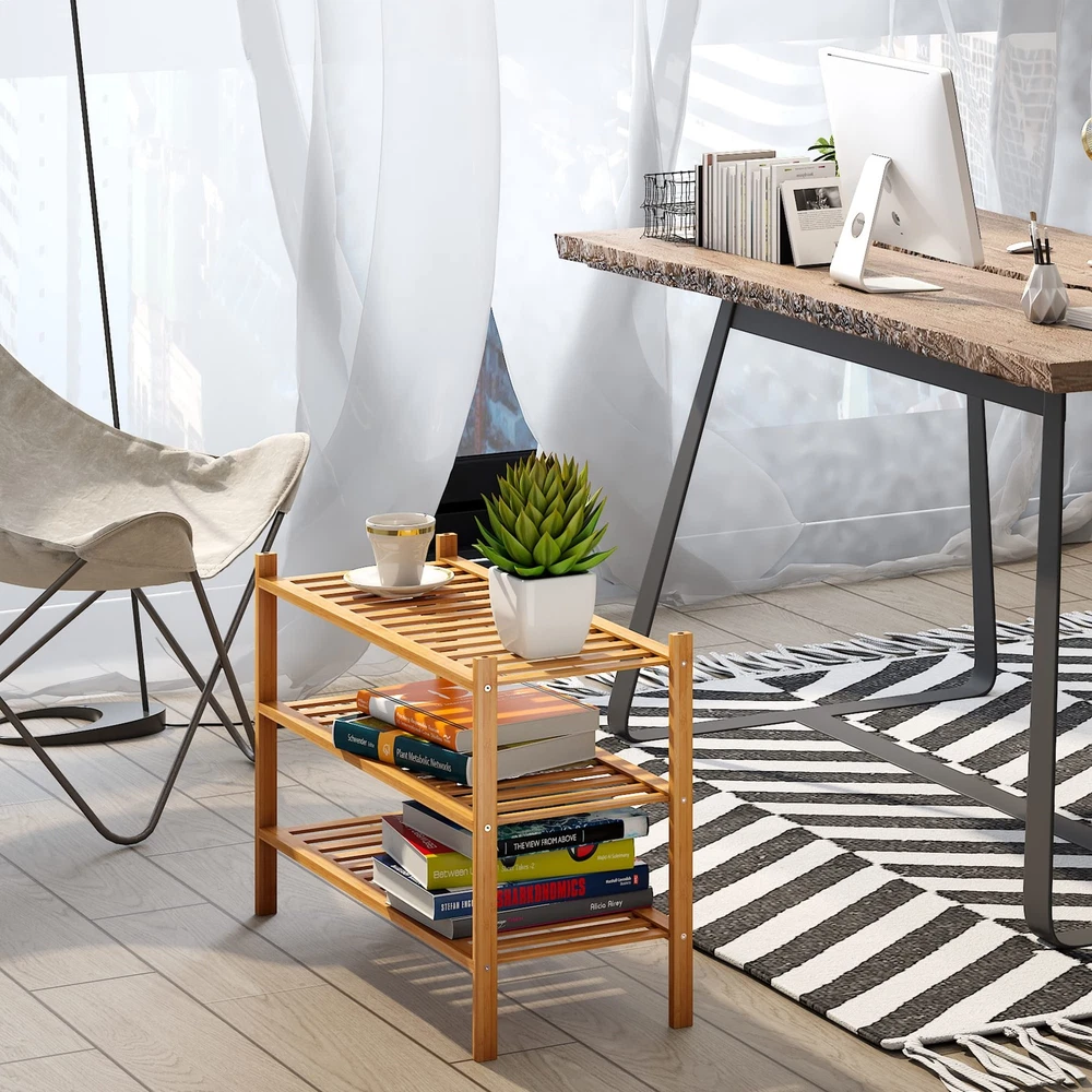 BMOSU stylish decorative shoe rack, convenient and Solid and practical, is a good helper for organizing the room and saving space. The shelf provides enough space for the shoes, which can be used indoors and outdoors. Please avoid strong sun exposure and prevent rain. Brand: BMOSU MATERIAL: BAMBOO COLOR: NATURAL COLOR Stackable design:When you want to get a high-rise shoe rack,You can use the round bar in the accessory to stack two shoe racks. Simple convenient Multiple Sizes: 3 lengths to fit your space needs, Small is 17 in long (2 pairs of shoes per tier), Medium is 27 in long (2-3 pairs of shoes per tier), Large is 33.3 in long (3-4 pairs of shoes per tier) Space saving:This shelf can You can use it in any space, so that you can maximize the use of space saving and keep the family clean and tidy, solid and practical Easy To Install:The shoe rack is equipped with instructions and required tools, and the shelf and the bracket are installed with anti-rust screws. You can install it in only 10 minutes Anti-slip mat:Anti-slip mat makes the product not easy to slide while avoiding scratches on your countertop or floor