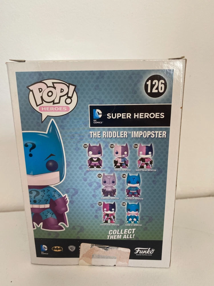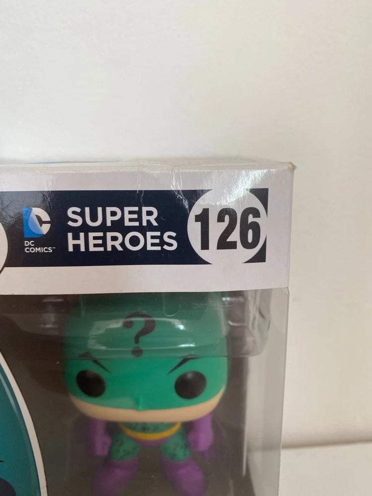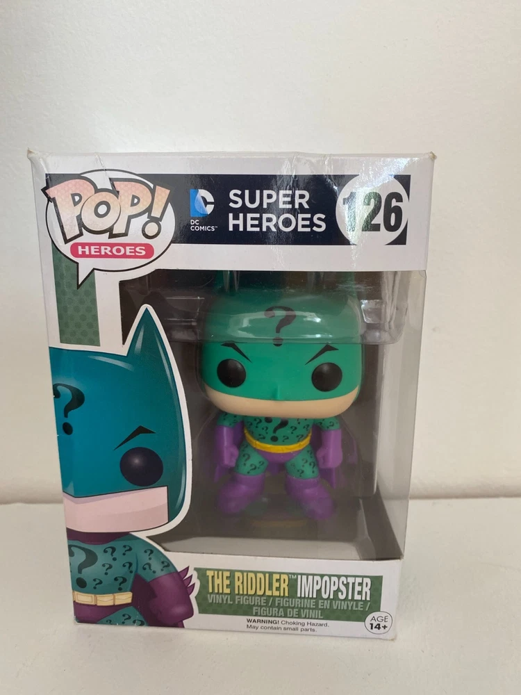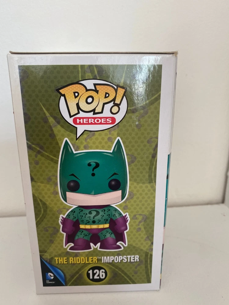 BNIB FUNKO POP VINYL DC COMICS THE RIDDLER IMPOSTER #126 FIGURE SUPER HEROES This product data sheet is originally written in English. YOU ARE BUYING A RIDDLER IMPOSTER ACTION FIGURE MADE BY FUNKO IN 2015 - FROM THE HEROES SERIES EXPERTLY DETAILED AND VERY COLLECTABLE APPROX 3.75" TALL BOX IS IN USED CONDITION WITH SOME WEAR BOX CONDITION IS FADED AT THE BACK AND SIDE . PLEASE STUDY PICTURES FOR MORE INFORMATION ON CONIDTION LOOK AT PICTURES FOR MORE INFORMATION ON CONDITION! DON'T MISS OUT ON THE CHANCE TO BUY A SOUGHT AFTER FIGURE OF A SCARCE FUNKO CHARACTER CHECK OUT ALL THE OTHER ACTION FIGURES I HAVE FOR SALE IN MY SHOP AT GREAT PRICES, WITH MASSIVE POSTAGE DISCOUNTS YOU ARE BUYING A RIDDLER IMPOSTER ACTION FIGURE MADE BY FUNKO IN 2015 - FROM THE HEROES SERIES EXPERTLY DETAILED AND VERY COLLECTABLE APPROX 3.75" TALL BOX IS IN USED CONDITION WITH SOME WEAR BOX CONDITION IS FADED AT THE BACK AND SIDE. PLEASE STUDY PICTURES FOR MORE INFORMATION ON CONIDTION LOOK AT PICTURES FOR MORE INFORMATION ON CONDITION! DON'T MISS OUT ON THE CHANCE TO BUY A SOUGHT AFTER FIGURE OF A SCARCE FUNKO CHARACTER CHECK OUT ALL THE OTHER ACTION FIGURES I HAVE FOR SALE IN MY SHOP AT GREAT PRICES, WITH MASSIVE POSTAGE DISCOUNTS Type Action Figure Genre Superheroes Brand Funko Film Batman Character Pop Material Vinyl Theme Pop! Vinyl Franchise Superman EAN Does not apply