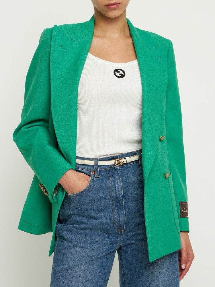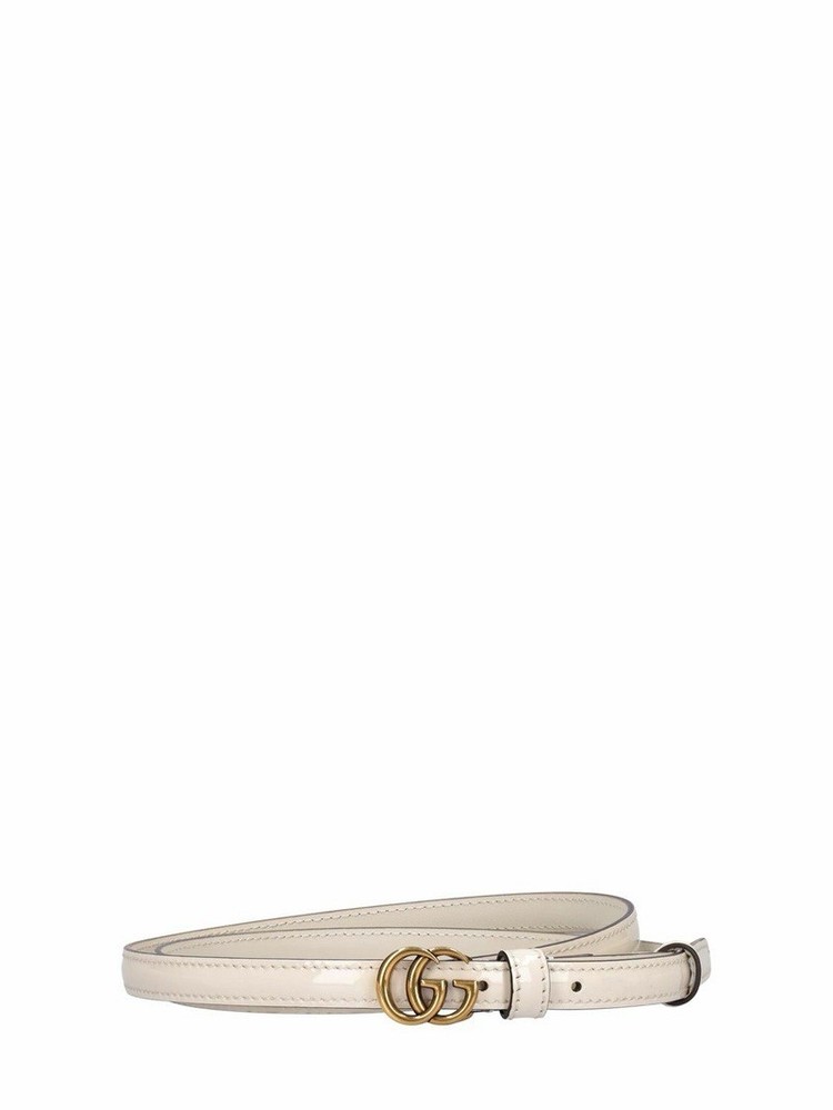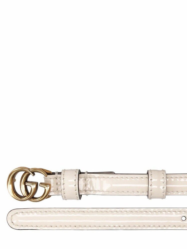The BNWT Gucci Women’s GG Marmont Thin Patent Leather Belt is a stylish accessory designed for women. Made with high-quality patent leather in a sleek white color, this belt features a solid pattern with a Gucci logo accent. The adjustable belt has a buckle closure and is crafted in Italy, making it a fashionable and luxurious addition to any wardrobe. Perfect for adding a touch of designer flair to any outfit, this belt is a versatile piece that can elevate any look with its elegant and sophisticated style. Width: 1.2cm. Adjustable pin closure. Gold-colored metal logo buckle Size 90/36