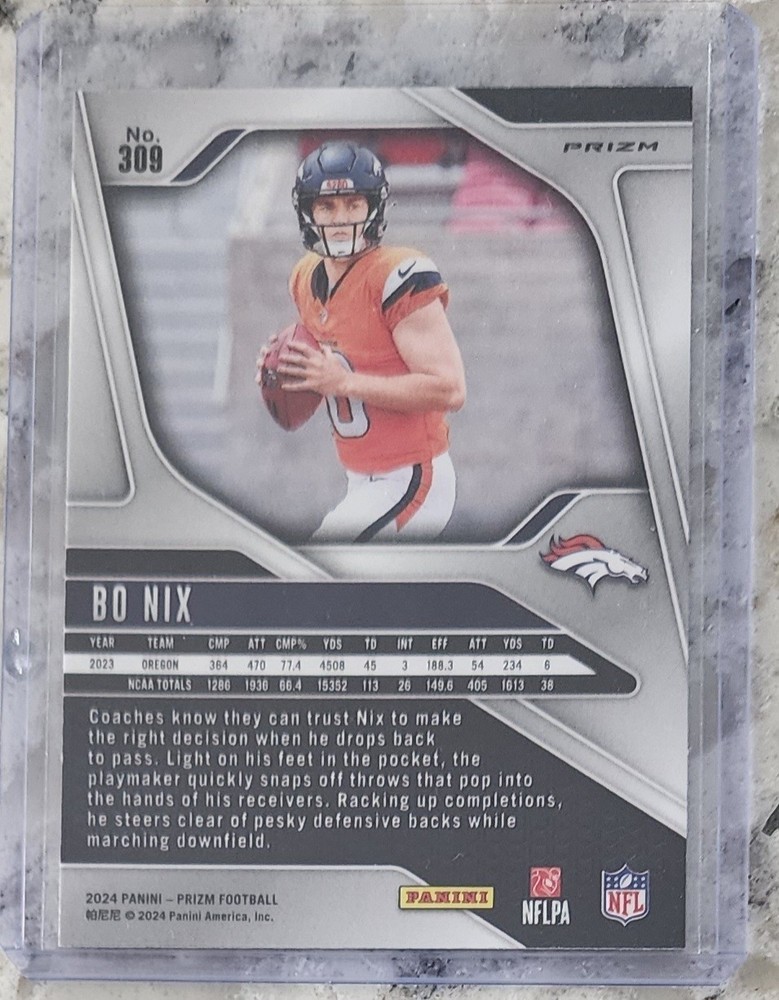 The product is a 2024 Panini Prizm Orange Lazer Prizm Parallel Rookie Card featuring Bo Nix of the Denver Broncos. This sports trading card is part of the National Football League (NFL) set and is produced by Panini. With the unique Lazer Prizm parallel variety, this card stands out among other trading cards and is a sought-after collectible for fans and collectors alike.