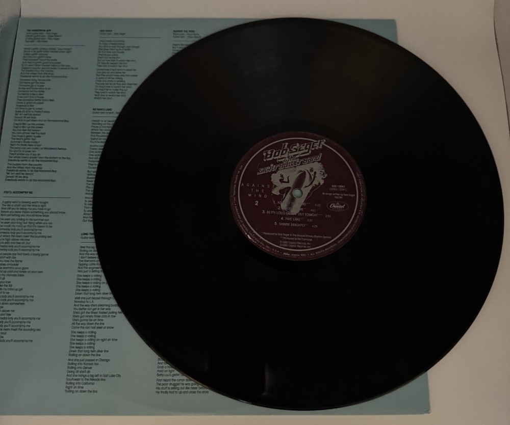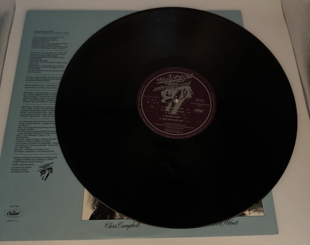 The product is a vintage 1980 vinyl LP record by Bob Seger, titled "Against the Wind." Released by Capitol Records, the record is a classic rock album featuring the iconic artist and his band. With a speed of 33 RPM and a record size of 12", it comes in a cardboard sleeve with the original cover art. This piece of music history from the 1980s is a collector's item for fans of rock and rock 'n' roll music, showcasing Seger's signature style and a must-have for vinyl enthusiasts. See pics. (J-10)