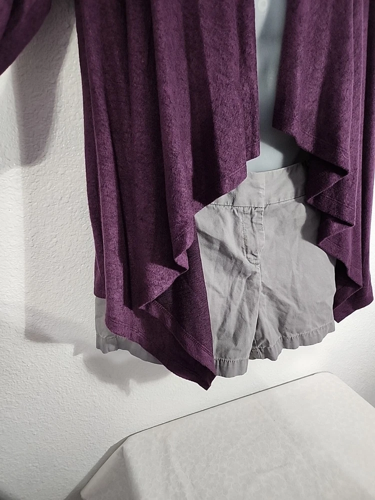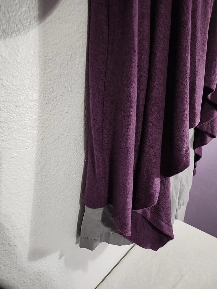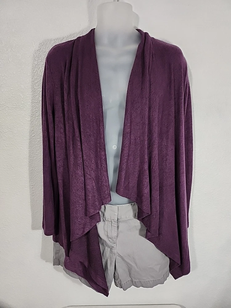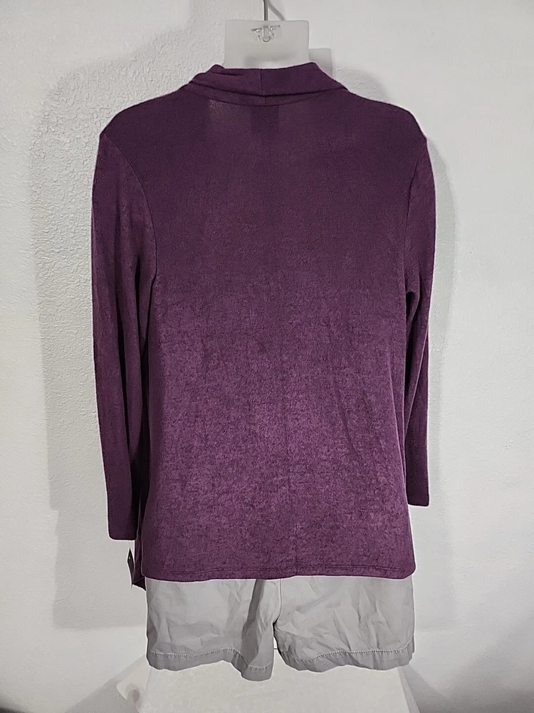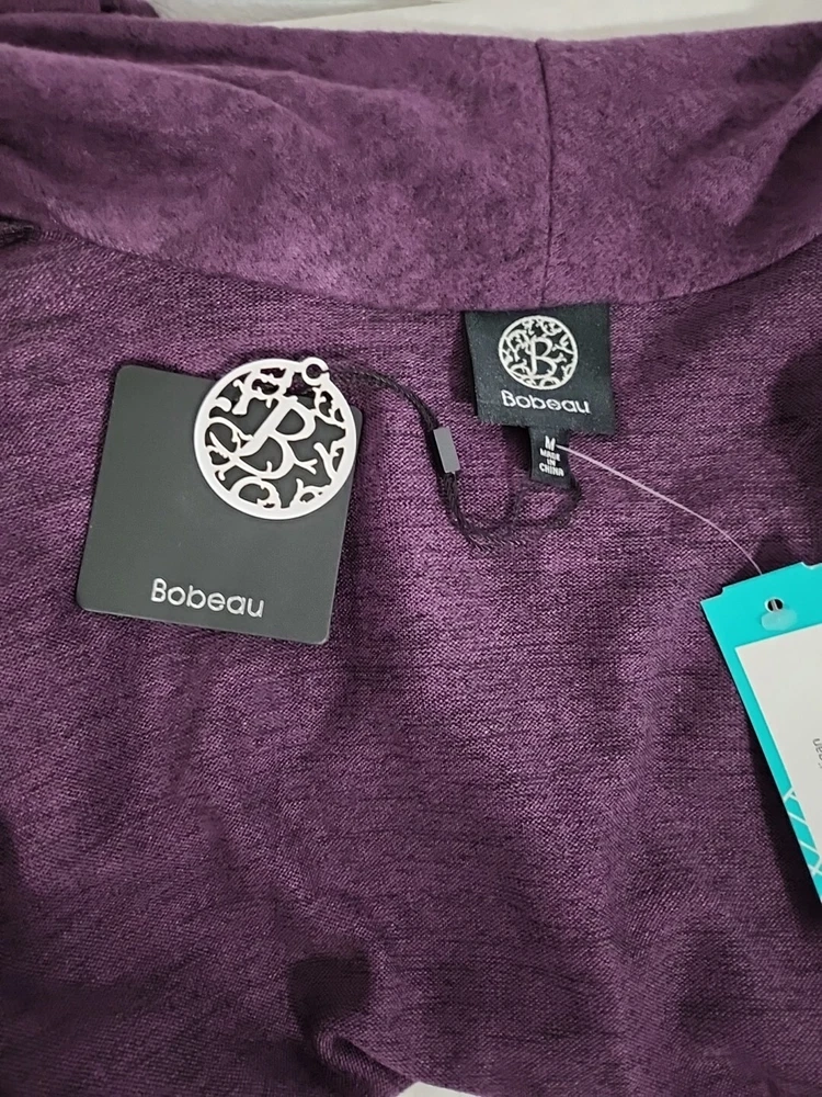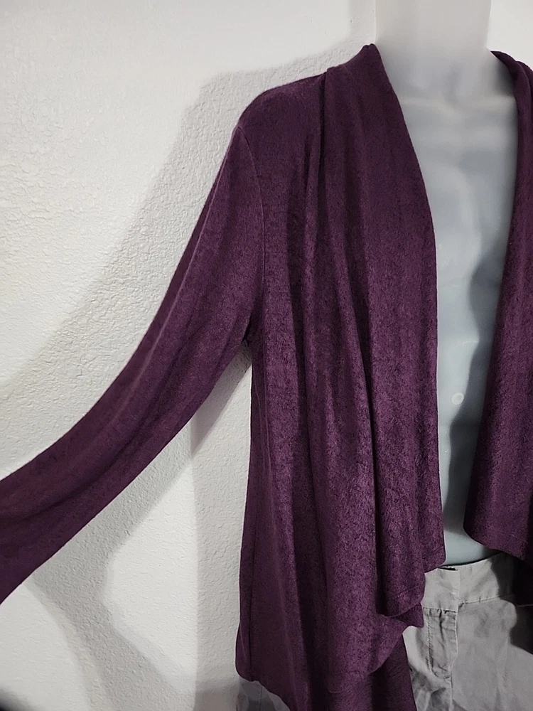 Elevate your wardrobe with this stunning BOBEAU Deep Purple Soft Brushed Open Draped Wallace Cardigan. This versatile piece is perfect for any occasion, whether it's a casual day out or a formal event. The cardigan features an open front neckline and closure, with long sleeves and a relaxed fit for ultimate comfort. The fabric is made of 75% rayon, 21% polyester, and 4% spandex, ensuring a super soft knit that stretches to fit all seasons. The cardigan is designed with a solid pattern and a beautiful purple color that will add a touch of elegance and bohemian vibe to your outfit. This draped cardigan top is perfect for women of size M and is part of the Wallace Brushed Cardigan product line. New with tags