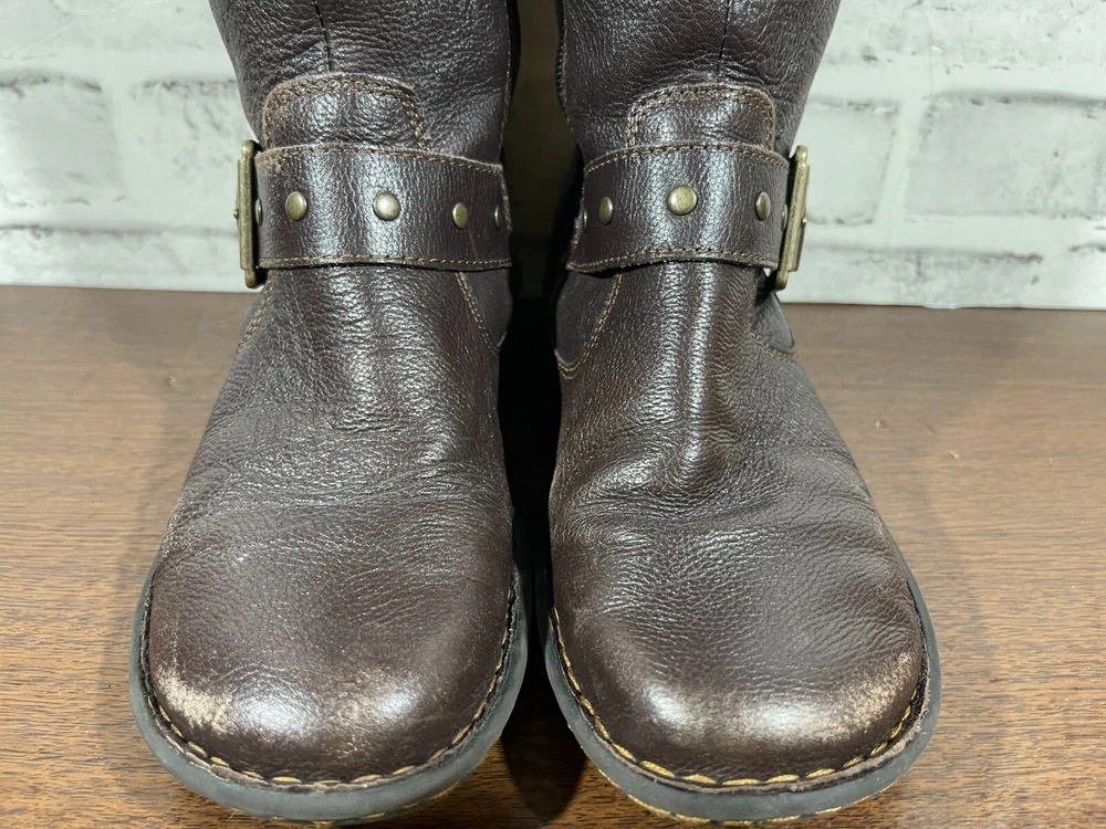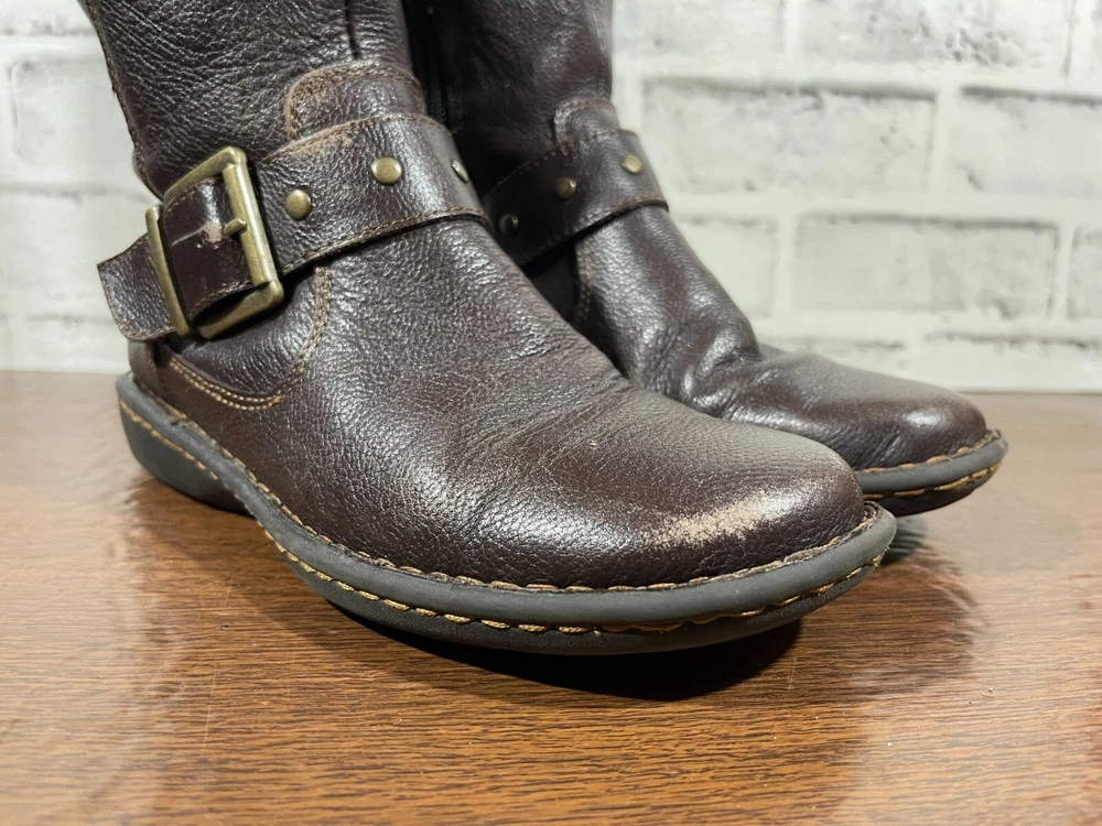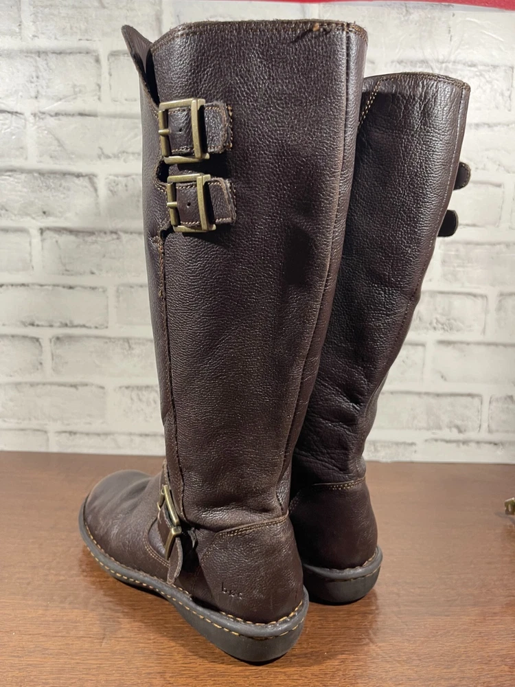 Step out in style with these BOC Born Concept Boots for women. These mid-calf riding boots feature a round toe shape and a zip closure for easy wear. The brown leather upper material is accented with a buckle, zipper, and logo, giving these boots a classic yet modern theme. Comfort is not compromised with a flat heel style and medium calf width. The rubber outsole material ensures durability, making these boots perfect for casual occasions during any season, be it winter, summer, fall, or spring. These boots are available in US shoe size 7, AU shoe size 7, and EU shoe size 38. Add these stylish boots to your wardrobe today! Very good preowned condition with normal preowned wear and a bit of scuffing as pictured. Please see all photos. All clothing has been washed and comes from a smoke free environment. I am available for questions. I accept or negotiate reasonable offers. Have an amazing day. Thank you.