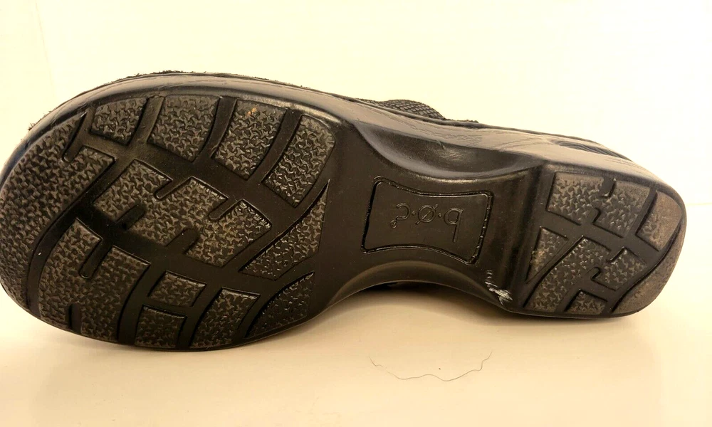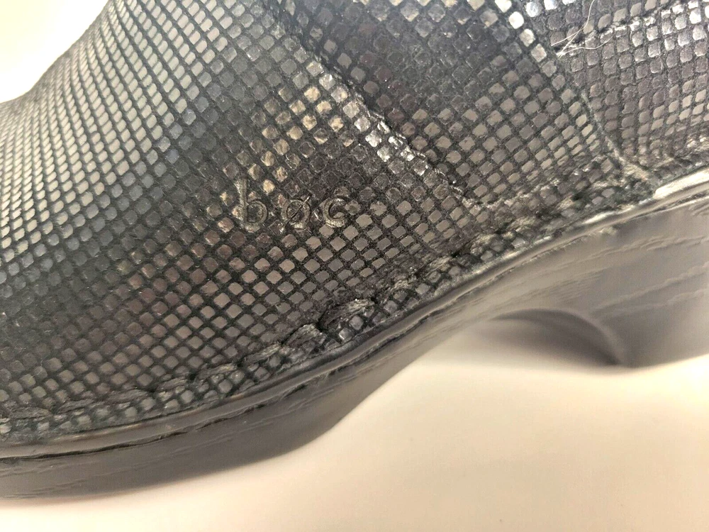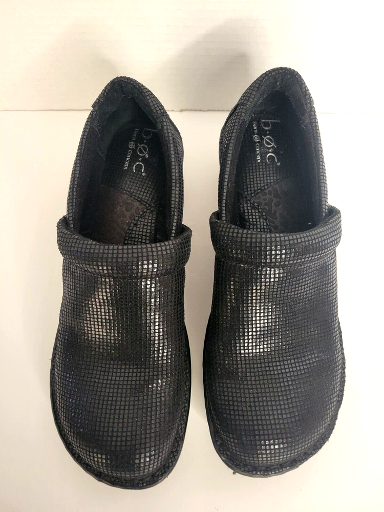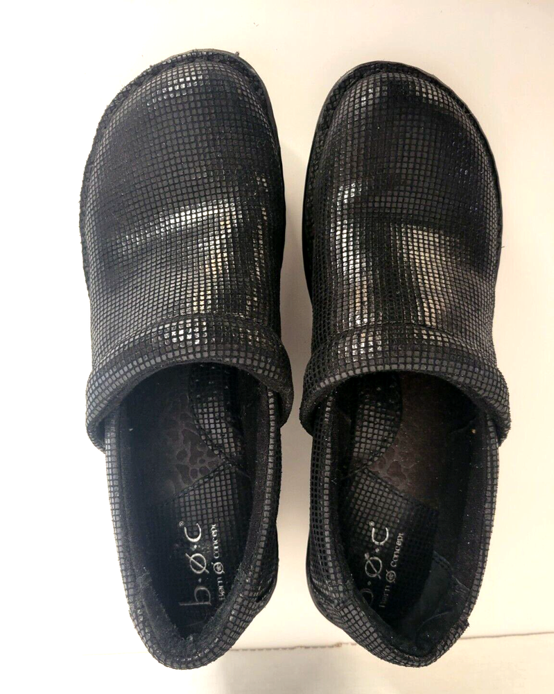 Born Concept BOC Women's Sz 8M Wedge Slip On Black Leather Shoes. Shiny exterior. There is one small scuff mark on the back of the right show (see pictures). Otherwise in great condition.