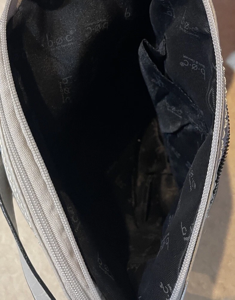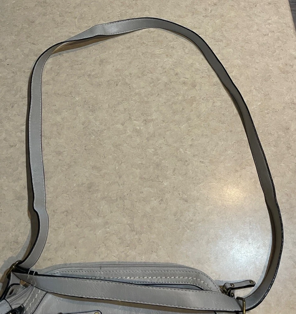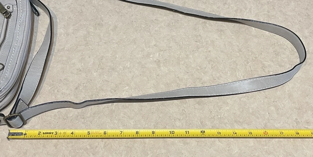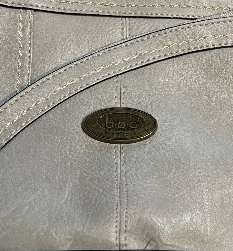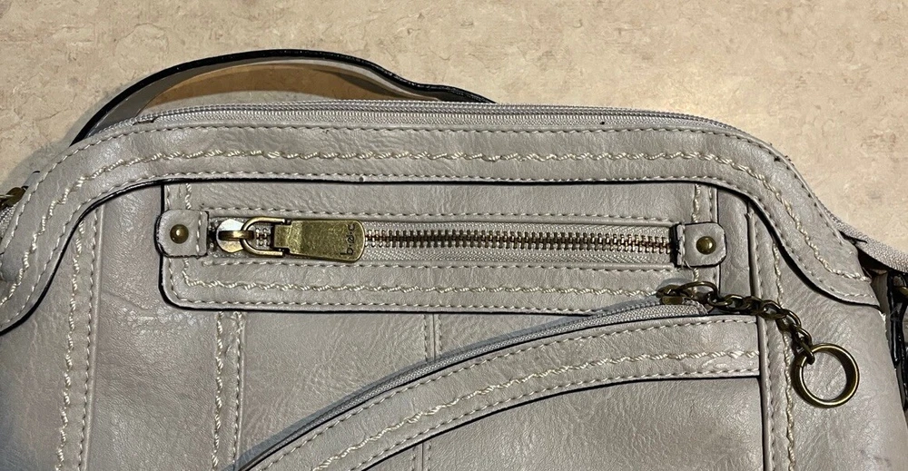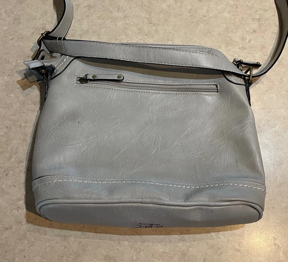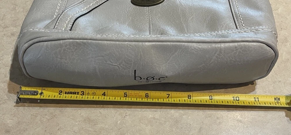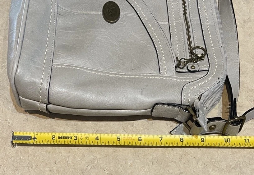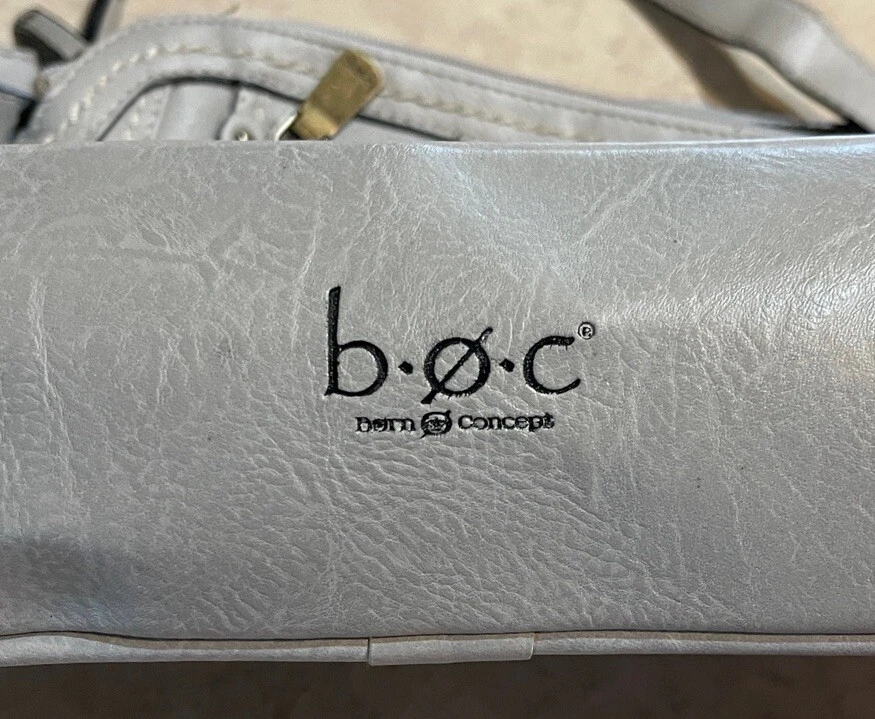 Introducing the BOC Born Concepts Gray Faux Leather Adjustable Strap Crossbody Handbag Purse, perfect for the stylish and modern woman on-the-go. This medium-sized bag features a zip and magnetic closure, with a crossbody strap that can be adjusted up to 32 inches for maximum comfort. The bag is made of high-quality vinyl and lined with polyester, while the interior boasts a variety of pockets and a mobile phone pocket. The BOC Born Concepts Crossbody Handbag is designed with a classic theme and features a solid pattern. It has a gold hardware color and a black lining color. The bag is 11 inches wide, 9.5 inches tall, and 4.5 inches deep. It comes with a unit quantity of 1 and is perfect for women who want a medium-sized bag with a crossbody strap. The bag is born of concepts and is a must-have for anyone looking for a stylish and functional accessory. This purse is in good preowned condition, with only light signs of wear. Please see ALL photos for a better idea on condition, any measurements, or details to the purse.