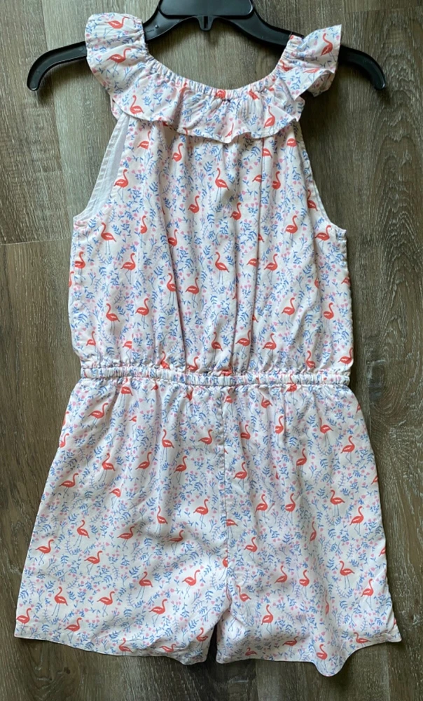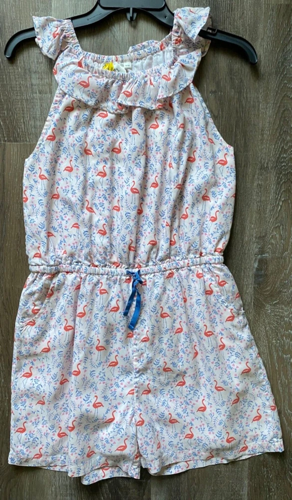 BODEN light pink with floral and flamingo pattern romper~girl's size 15-16Y~ Girl's BODEN romper *Size: 15-16Y *Fabric: 100% cotton *Romper is fully lined in pale pink fabric *Waist is elasticized AND has a drawstring *Romper has side slit pockets on each side *Color: light pink with blue & pink flower and flamingo pattern *Chest: 16 inches from armpit to armpit laying flat *Waist: 14 1/2 inches from side seam to side seam laying flat (unstretched) *Length: 29 inches from top center back to the hem *Inseam: 4 inches *Condition: great, pre-worn condition with no stains, rips or tears *We have a smoke-free home.