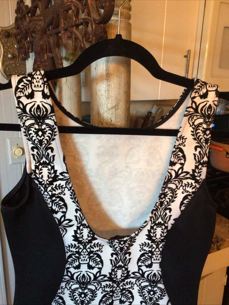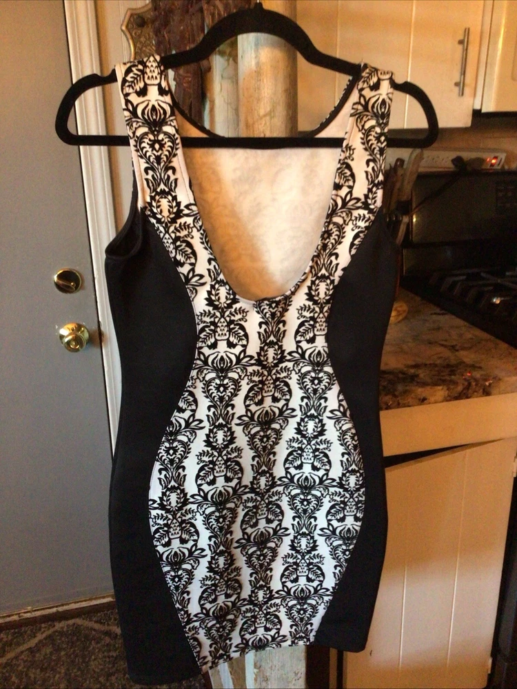 This stunning black and white paisley bodycon dress from Body Central is the perfect addition to any wardrobe. The sleeveless design, round neckline, and pullover closure make it easy to wear for any occasion, whether it's a party or a casual day out. The dress is made from a comfortable and stretchy knit fabric, consisting of polyester and spandex, that fits perfectly in all the right places. The dress features a lined and backless design, collared neckline, and a short length that makes it perfect for showing off your legs. The dress is available in size medium and can be easily hand washed for long-lasting wear. Whether you're looking for a sexy and comfortable dress or simply want to add to your collection, this Body Central dress is a great choice.