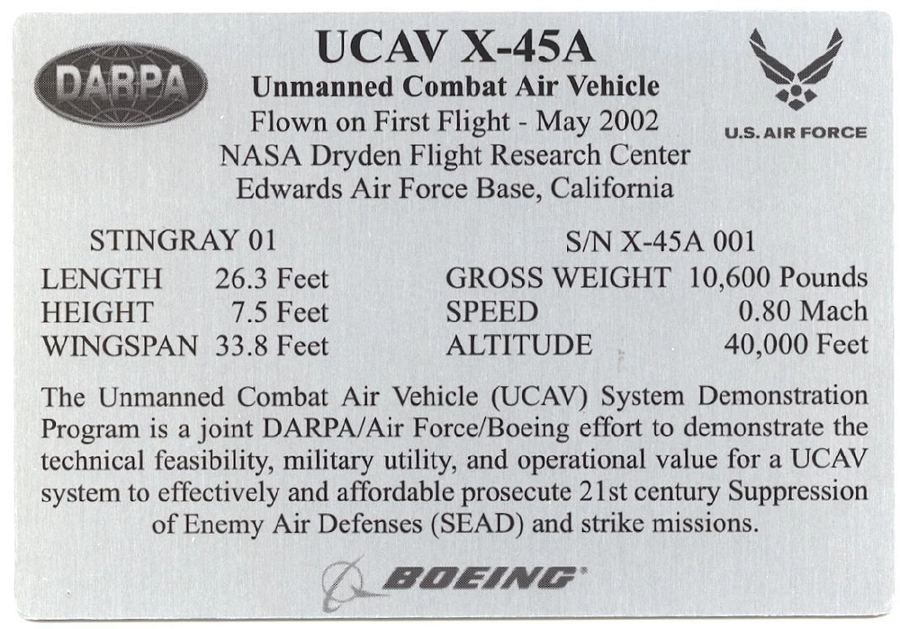 This 2.5 x 3.5 metal data plate was flown on the first flight of the first prototype of the Boeing / DARPA / USAF X-45A Unmanned Combat Air Vehicle on May 22, 2002 at Edwards AFB. The Boeing X-45 UCAV was being developed as an autonomous strike platform for the USAF and Navy. These data plates were made by the program and given only to personnel involved in the first flight. Don’t pass up this opportunity to own an item that was actually flown on an X-Plane. Don’t miss this rare opportunity to own a fabulous piece of aviation memorabilia. Combined Shipping Available. Check out my other auctions for more aerospace collectibles.