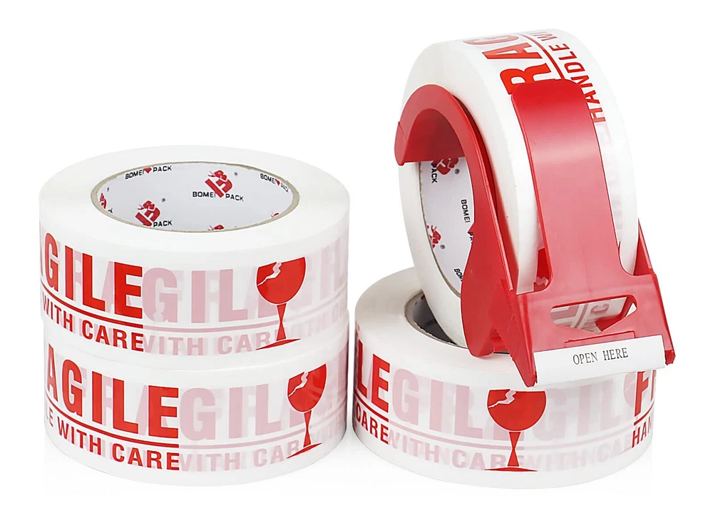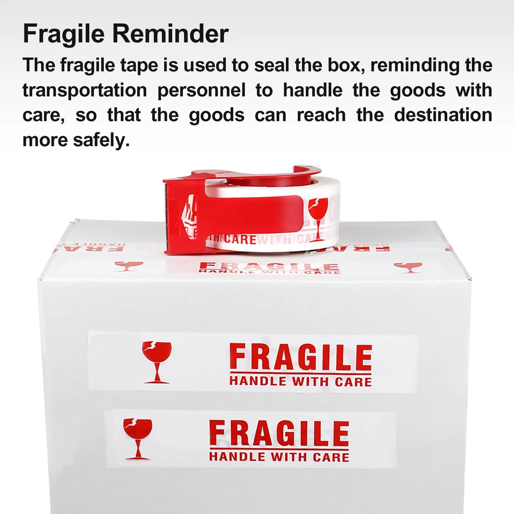 PREMIUM ADHESIVE: 4 Roll of 110 Yards, 2.4 mil thick of high performance fragile packaging tape with a small easy use dispenser for free. High adhesion and holding power resists popping for a tight seal throughout the supply chain. Suitable for home, commercial or industrial use in any climate. This storage and shipping box tape can firmly stick onto any surface EASY TO USE: Our 2.4 mil thick fragile tape is very good in thickness and toughness, will not tear or split easily. Provides excellent holding power for heavy-duty packaging and shipping. These fragile shipping labels are truly great for anyone who ships and handles fragile items especially for glass, collectables, electrical, houses, computers and computer parts, and in manufacturing industries or anything that needs to be handled with a little extra love EXTREMELY DURABLE: Our FRAGILE packing tape offers excellent holding power for packaging and shipping, easy to use shipping tape that will not split or rip during application. High edge tear and split resistance make it ideal for general industrial packaging applications and boxes weighing up to 80 pounds UNIVERSAL STANDARD SIZES: 2 inch wide; 110 yards length; 2.4 mil thickness. The diameter of core is 3 inch and perfectly fit standard 2inch hand-held dispenser. It will help your warehouse manage the sealing process quick and efficient. Adhesive sticks to smooth and textured surfaces especially on cardboard and carton materials MULTIPLE USE: Our Fragile Tape tape that can be used for home removals, shipping and mailing, for storing and organizing household items. Handle With Care Fragile in bright clear and easy to read text on label. Brings needed attention to your package so it is handled with the care that is needed. It's help reduce the risk of fragile items getting damaged during shipment