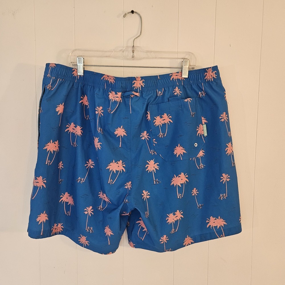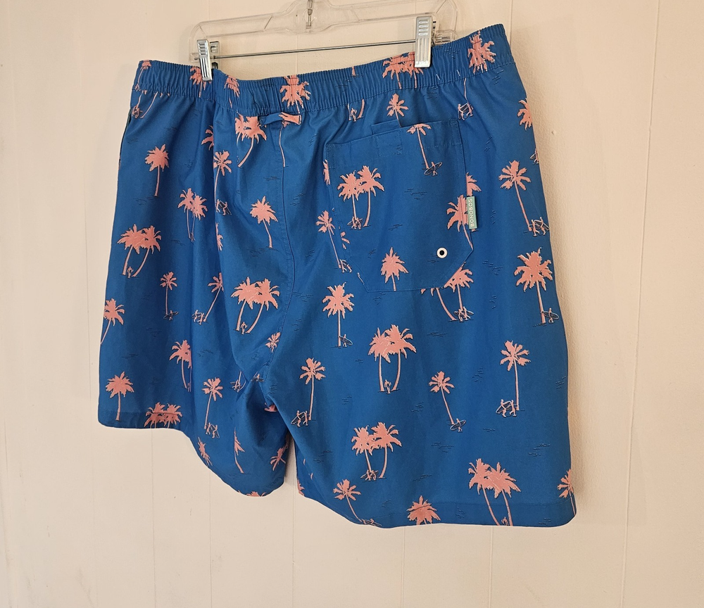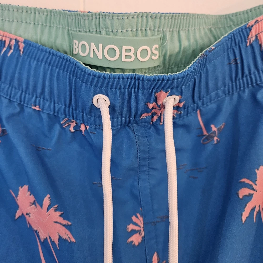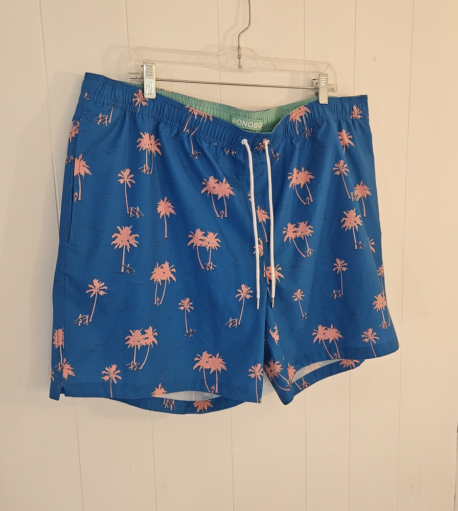 BONOBOS Swim Trunks – Men’s XXL – Blue with Pink Palm Trees Make a statement at the beach or pool with these stylish BONOBOS men’s swim trunks in size XXL. Featuring a vibrant blue background with bold pink palm tree graphics, these shorts deliver a fun tropical look perfect for warm-weather days. Designed for both comfort and performance, they include a soft interior mesh lining and an elastic waistband for a secure, flexible fit. These swim trunks are equipped with convenient pockets, making them practical for everyday wear as well as swimwear. Lightweight and quick-drying, they’re ideal for swimming, vacations, or casual summer outings. Features: Brand: BONOBOS Size: Men’s XXL Color: Blue with pink palm tree print Built-in mesh lining Comfortable elastic waistband Functional side pockets Lightweight, quick-dry material Great for beach, pool, or resort wear Add a pop of tropical style to your summer wardrobe with these eye-catching BONOBOS swim shorts!