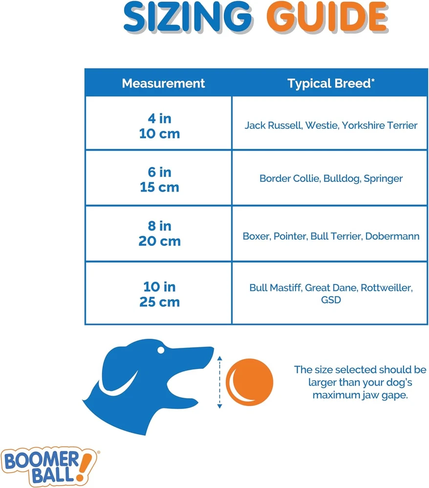 VIRTUALLY INDESTRUCTIBLE - The Boomer Ball is the ultimate tough toy and ideal for those ball-obsessed toy destroyers EXERCISE AND STIMULATION are promoted through the use of the Boomer Ball CHASE AND CONQUER - well-suited for high energy dogs who need a tough toy! CONSIDER SIZE - The toy is designed to not be picked up by the dog, so the ball should be a size bigger than the dog can carry HIGH QUALITY - This incredibly tough ball is made from polyethylene and means that most dogs can't puncture the ball or rip it to shreds! The Boomer Ball is the ultimate tough toy and ideal for those ball-obsessed toy destroyers! This incredibly tough ball is made from polyethylene and means that most dogs can't puncture the ball or rip it to shreds! It is designed not to be picked up by the dog, so the ball should be a size bigger than the dog can carry.
