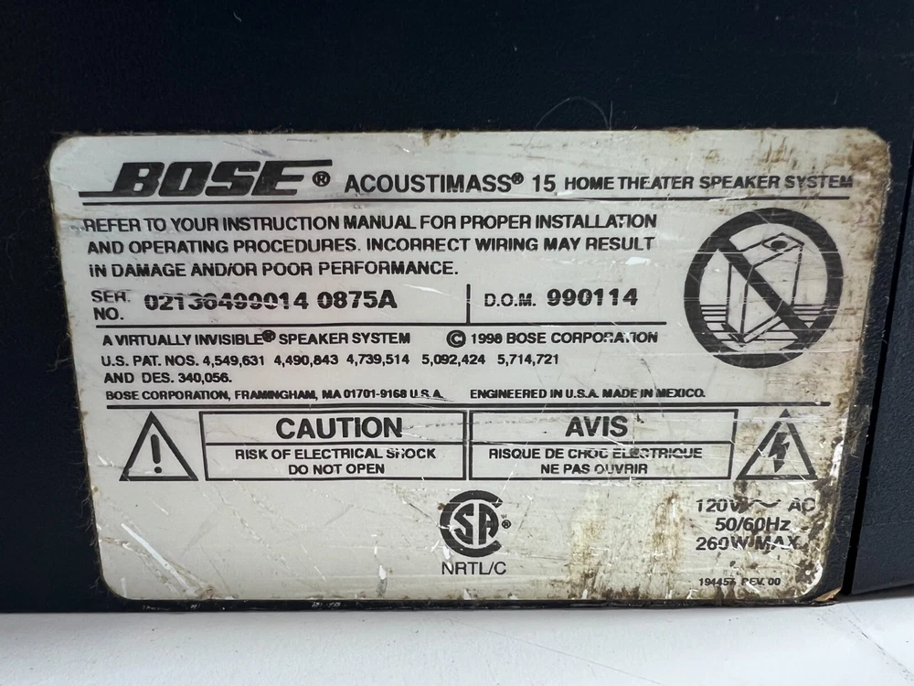 BOSE Acoustimass 15 Home Theater Speaker System, Subwoofer, 2 Cubes READ Tested & Working-Missing Subwoofer to Receiver Cable. Does Have all other speaker Cables!