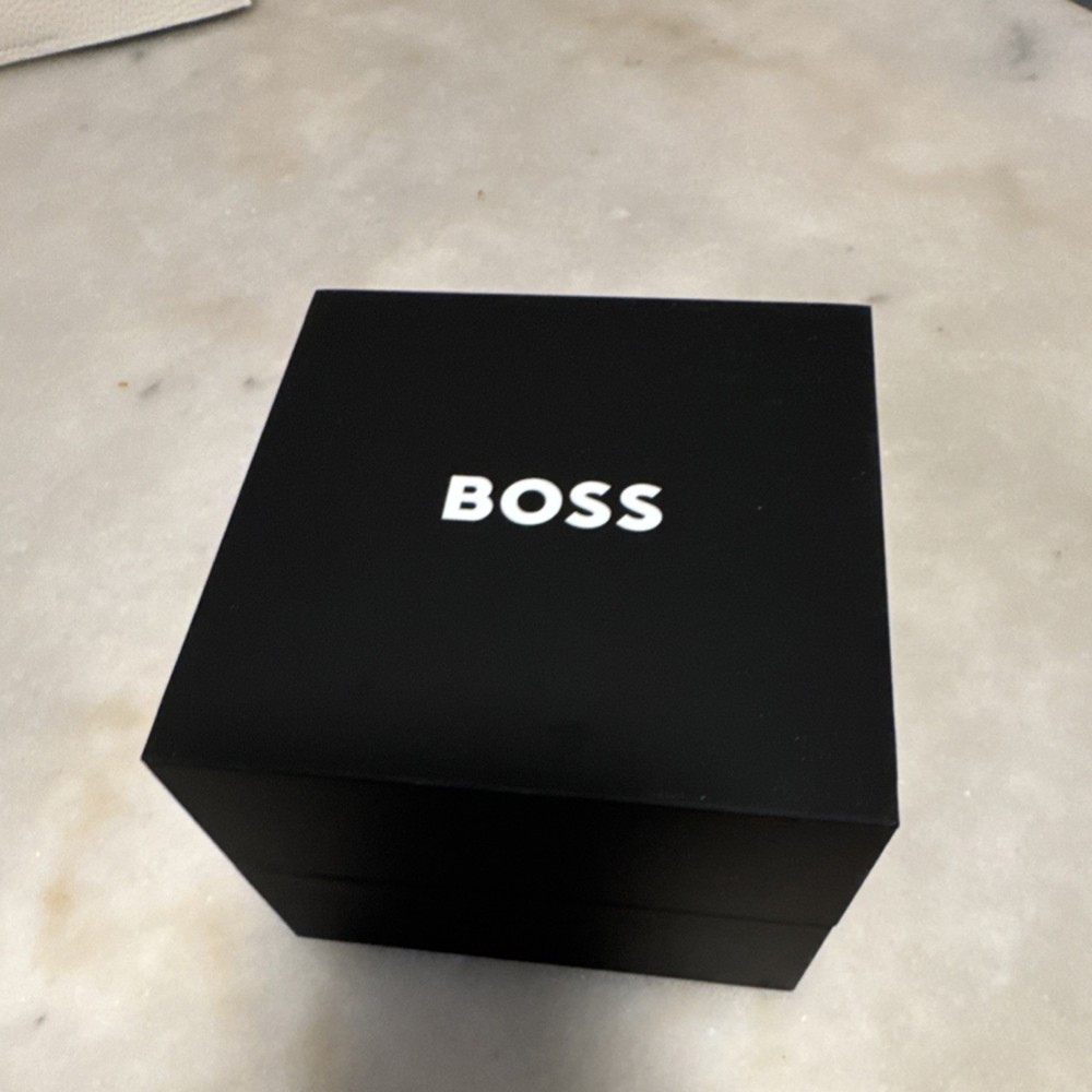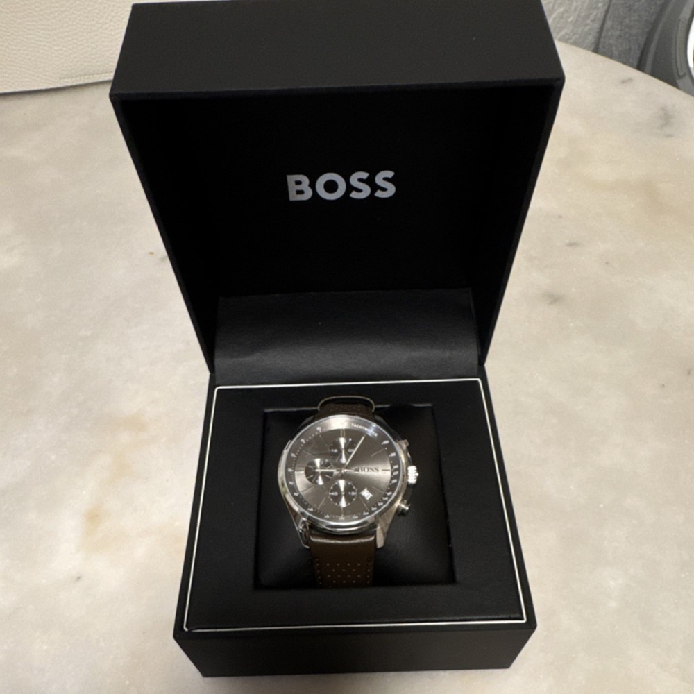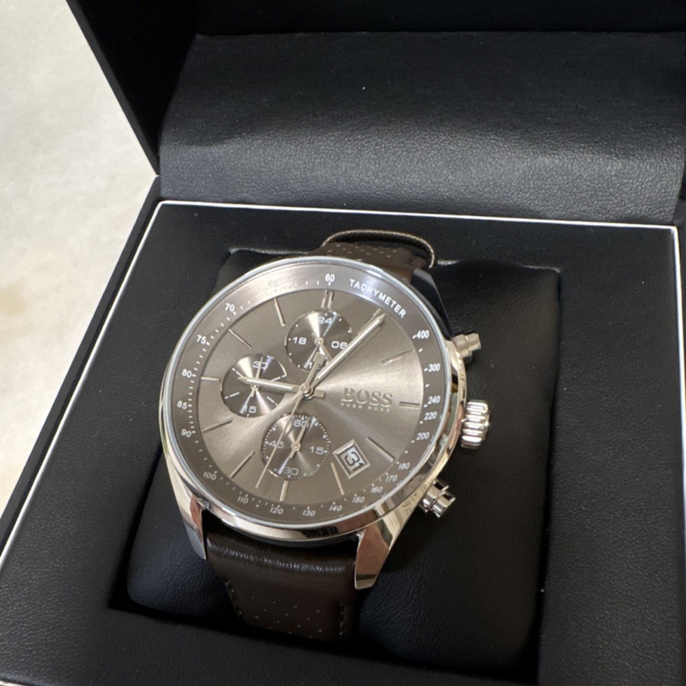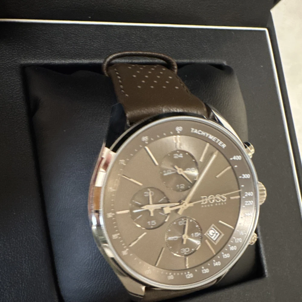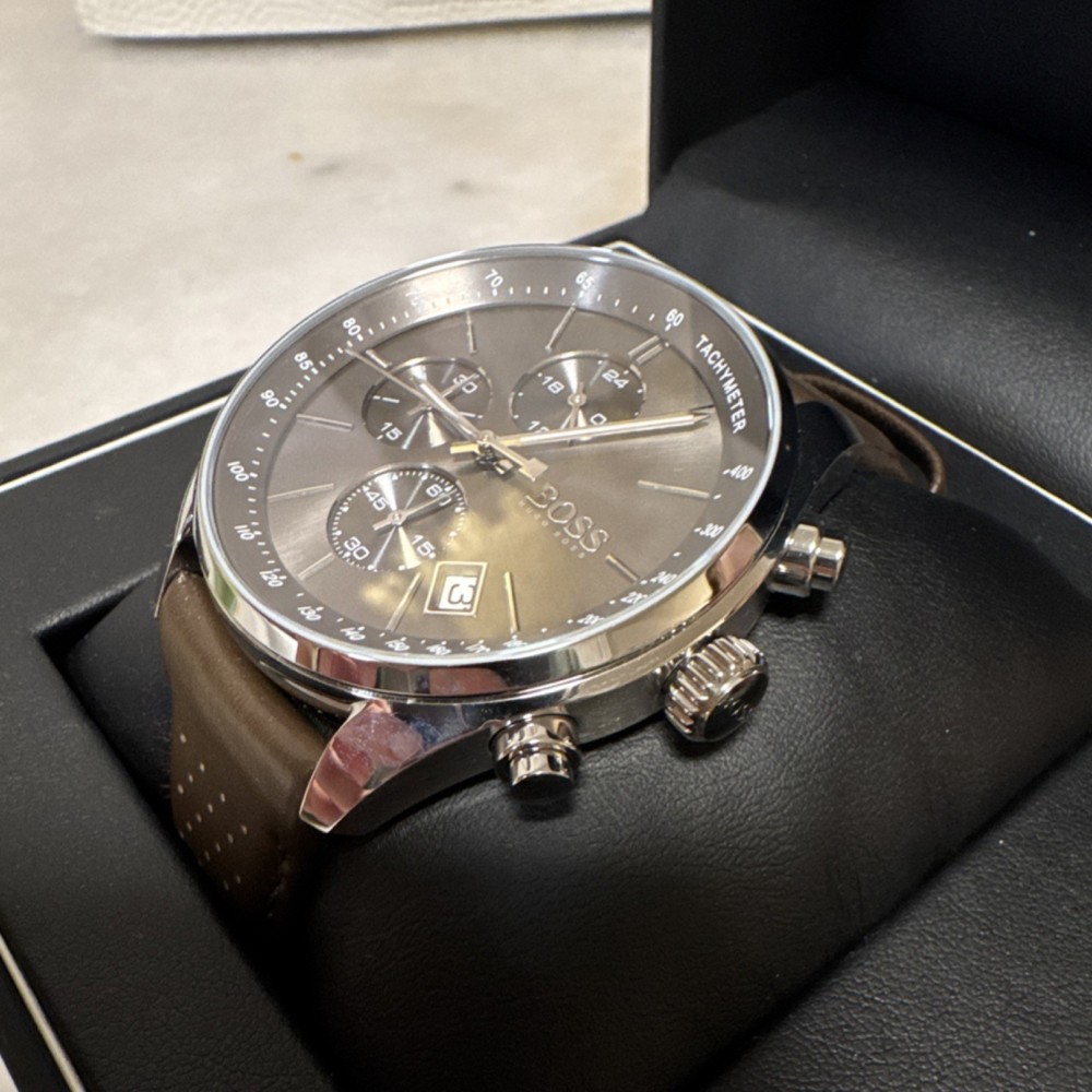BOSS Chronograph Tachymeter Wristwatch Brown Leather Strap Gray Dial Silver Case