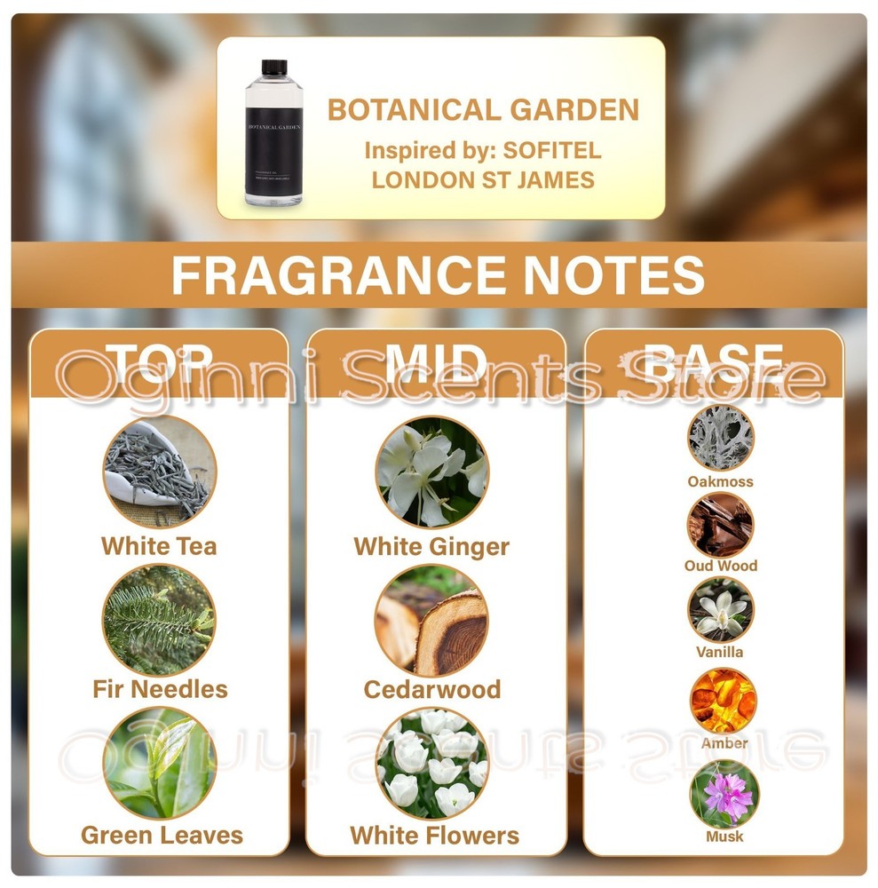 Botanical Garden – Fresh Florals & Woods with the Elegance of Amber | Premium Diffuser Oil Luxury Scent Description: Step into the refined elegance of Botanical Garden , inspired by the exclusive ambiance of Sofitel London St James Hotel. This captivating fragrance begins with a revitalizing blend of white tea , fir needles , and green leaves , evoking the serenity of a lush, well-tended garden. The heart reveals the delicate spice of white ginger , the grounding warmth of cedarwood , and the soft beauty of white flowers . Finally, the scent deepens into an opulent base of oakmoss , oud wood , vanilla , amber , and musk , creating a harmonious fusion of freshness, florals, and woods. Perfect for those who appreciate sophisticated luxury, Botanical Garden transforms any space into an oasis of calm and elegance. Fragrance Theme: Fresh Floral Woody Amber Here's why: Revitalizing top notes ( White Tea , Fir Needles , Green Leaves ) offer a crisp and serene opening. Elegant floral–woody heart ( White Ginger , Cedarwood , White Flowers ) adds warmth and sophistication. Luxurious base ( Oakmoss , Oud Wood , Vanilla , Amber , Musk ) provides depth, sensuality, and lasting richness. This blend combines uplifting freshness, delicate florals, and warm woods for a scent that is both calming and luxurious. It could also be classified as: Fresh Woody Floral: Highlighting the green and floral notes wrapped in wood. Amber Woody: Emphasizing the richness of amber, oud, and musk. Why You’ll Love It: ✔ Premium diffuser oil crafted for long-lasting scent diffusion ✔ Inspired by the sophisticated ambiance of Sofitel London St James Hotel ✔ Works exclusively with waterless cold-air diffusers ✔ Packaged securely to prevent leaks and preserve freshness ✔ A balanced scent combining freshness, warmth, and floral elegance How to Use for Best Results: Use only with a waterless cold-air diffuser for optimal performance. Do not add water to the diffuser oil, as this can affect the fragrance quality and diffuser function. Adjust your diffuser settings to your preferred scent intensity, and store the oil in a cool, dry place away from direct sunlight to preserve its fragrance profile. Note: "Botanical Garden" is a trademark of Aroma360 LLC and Hotel Collections. Oginni Scents Store and its products are not affiliated with, endorsed by, or in any way associated with Aroma360™ and Hotel Collections or their trademarks.