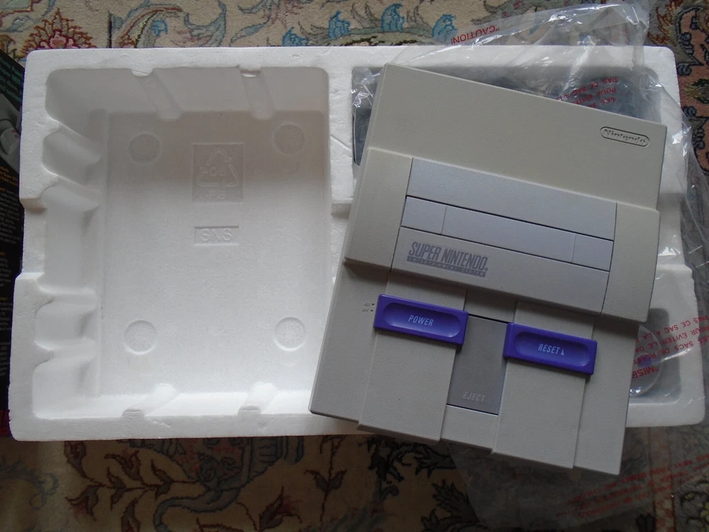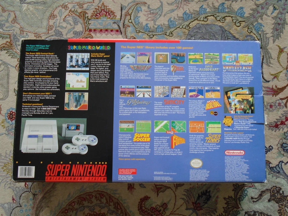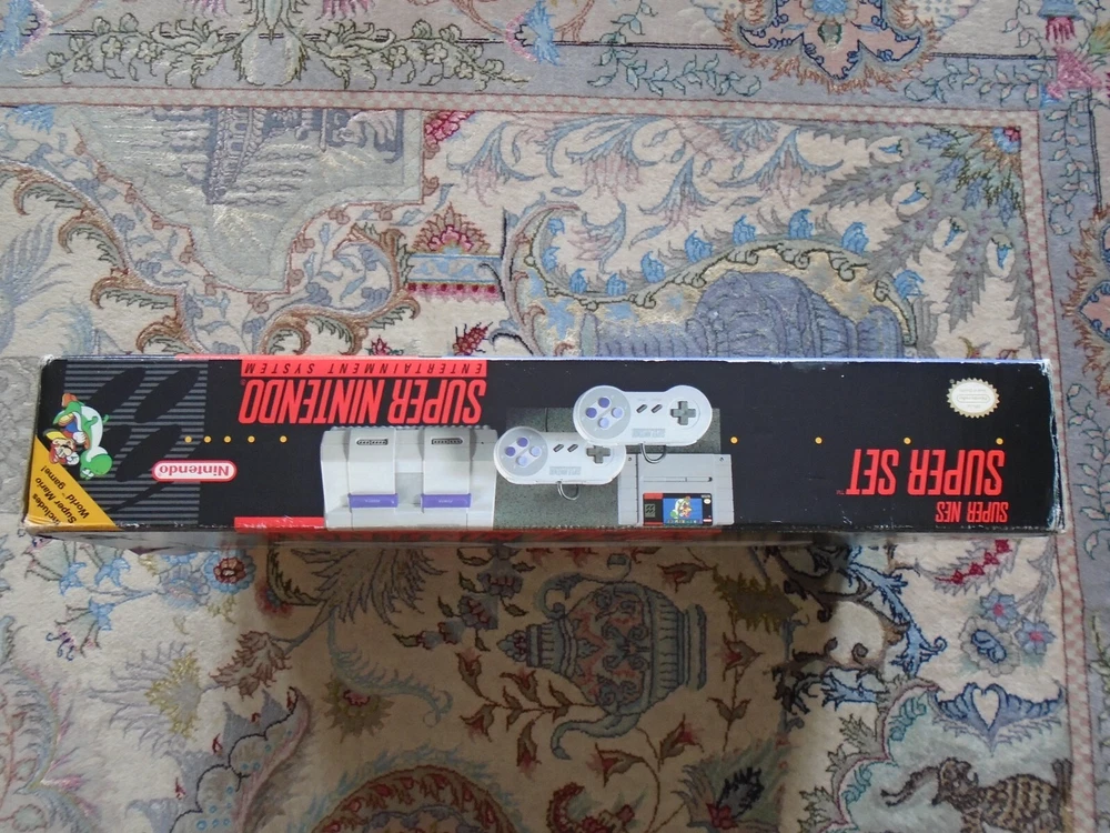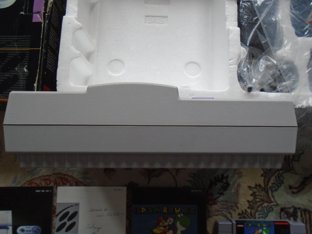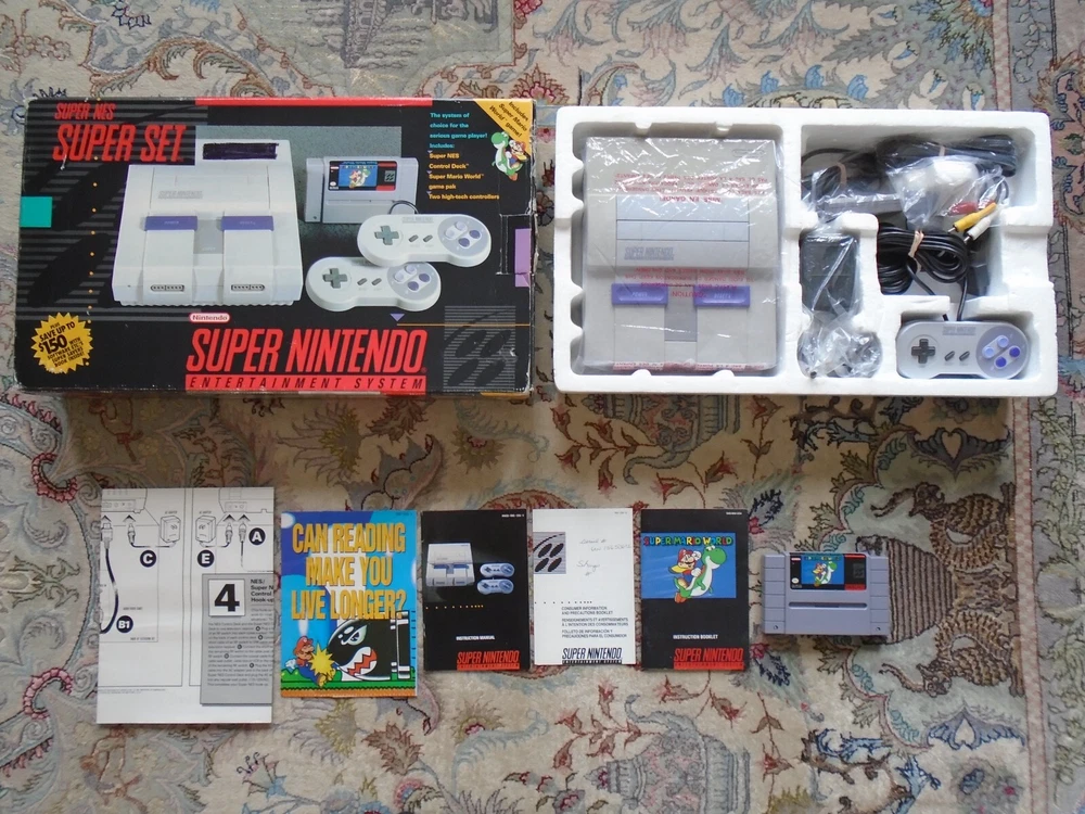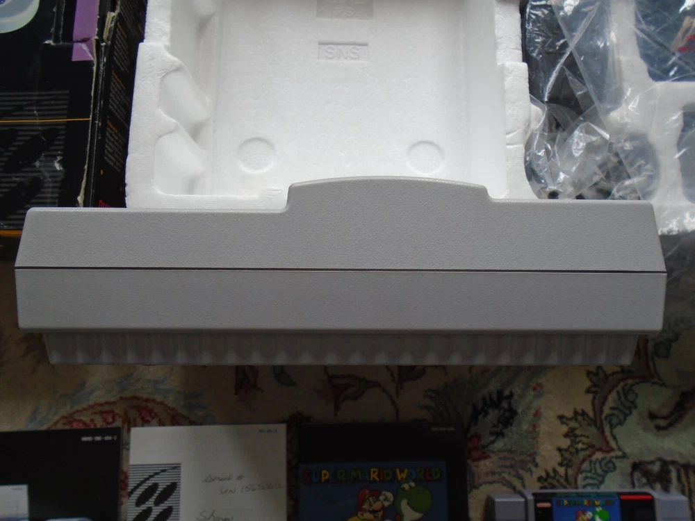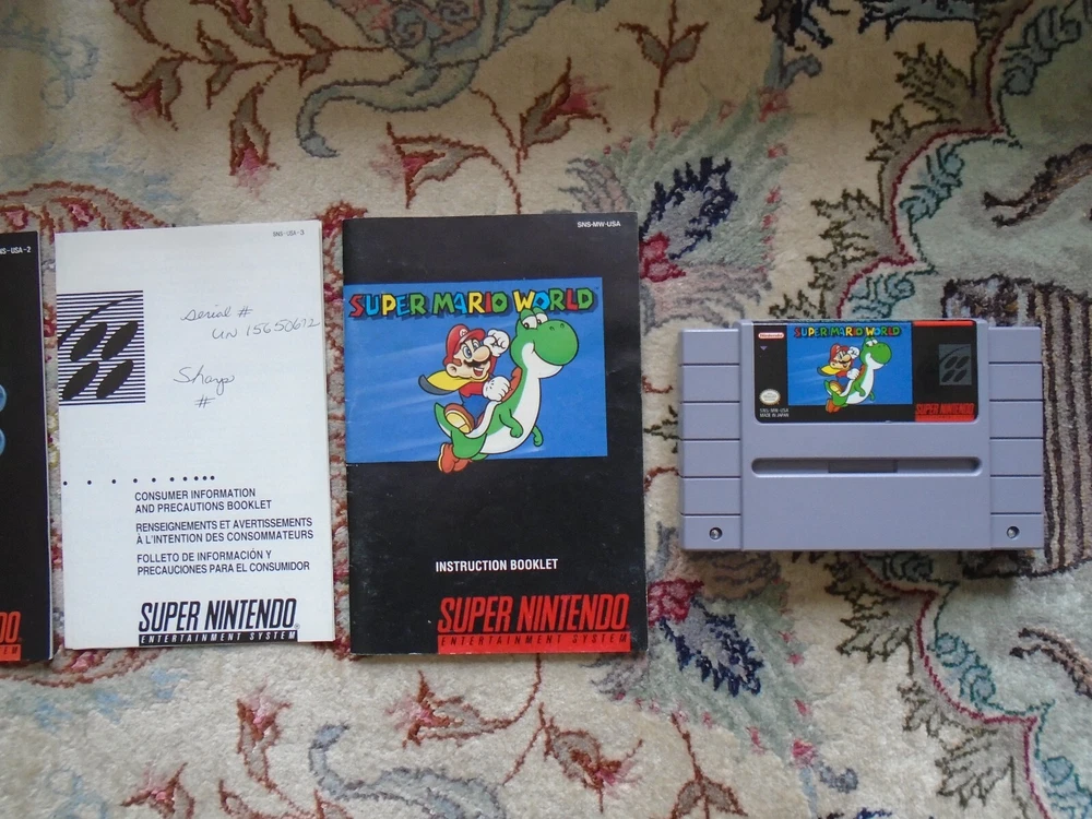 Video game bundle includes: Super Nintendo Console - model SNS-001 - with box, instruction manuals, pamphlets, inner foam piece, and some plastic bags 2 Nintendo brand controllers Necessary cables (Nintendo brand power cable, composite a/v cable, and RF audio/video cable) 1 authentic, original game included: Super Mario World with manual, and with active game saves on it! Functionality and Cosmetic Condition: Everything is fully tested and it all works perfectly! The items are in good to excellent to near mint used condition, with some signs of wear on the box. The console is a little discolored. The items come from a smoke-free, pet-free home. The photos are of the actual items being sold. We only accept returns if the items were not described correctly. Thank you for viewing our auction and good luck bidding!