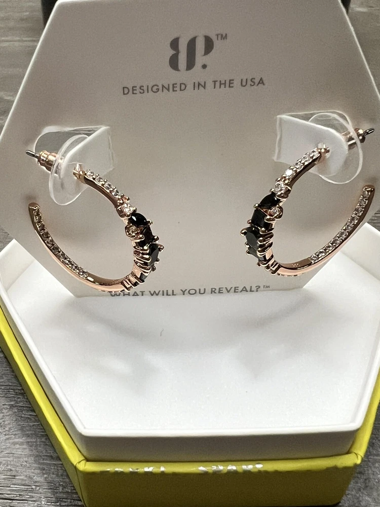 Elevate your style with these stunning hoop earrings from BP. Crafted with a rose gold-plated metal, these earrings feature a black onyx cubic zirconia stone that adds a touch of sophistication to any outfit. The hoops are perfect for a day or night look and can be dressed up or down to suit your mood. These earrings are a must-have for any jewelry collection and are sure to become a staple in your wardrobe.