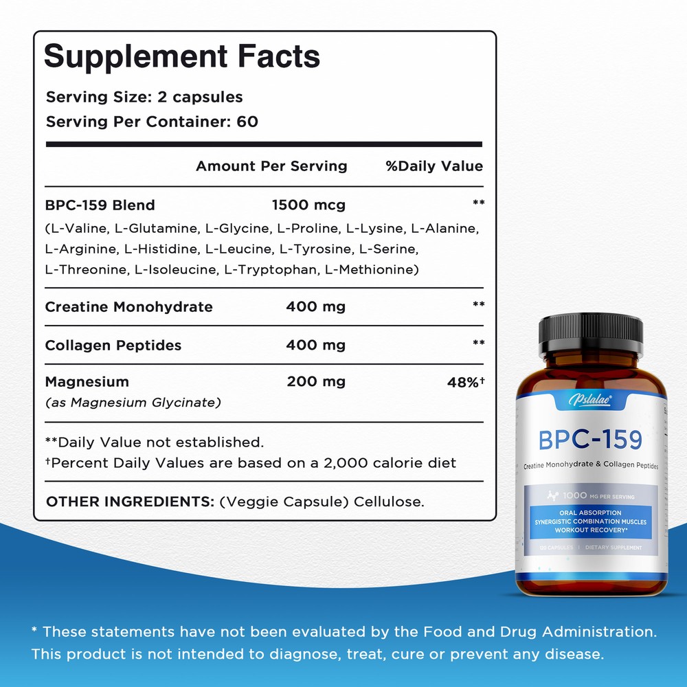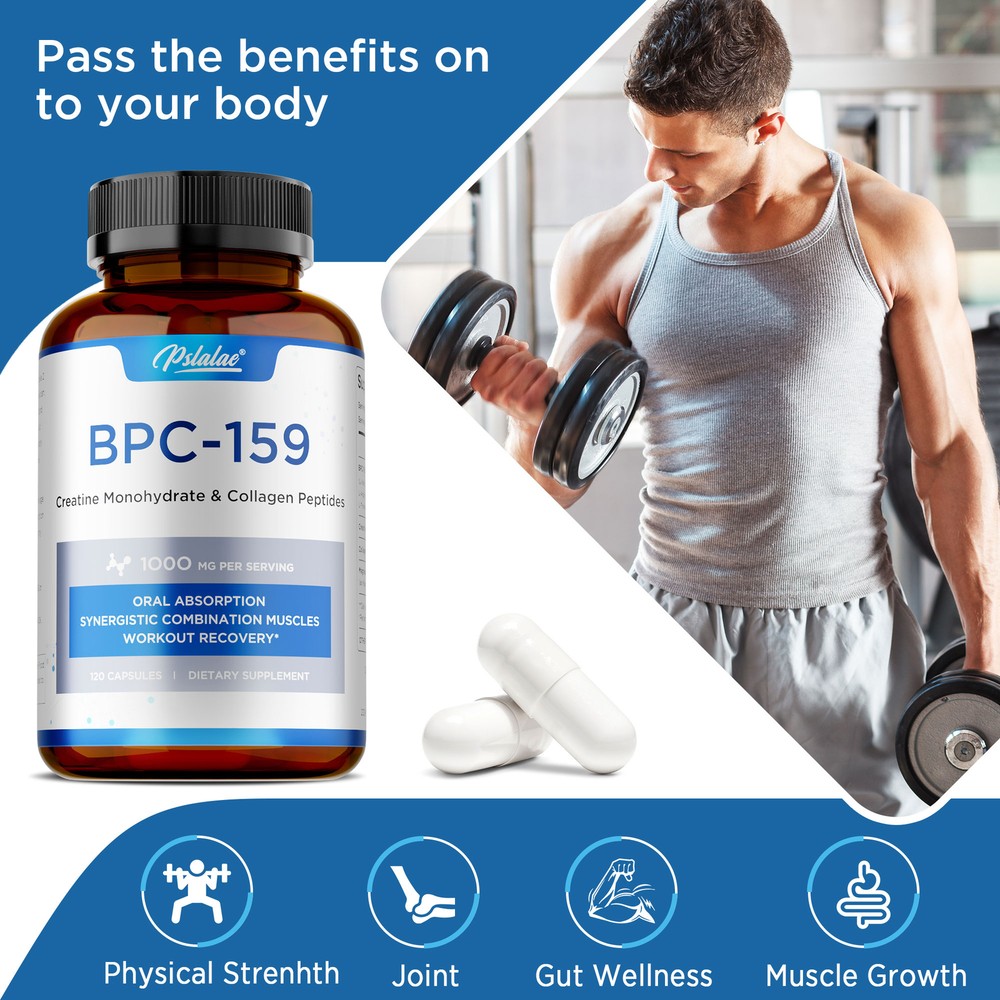 Effects: Bone and Joint Support, Muscle and Gut Health, Antioxidant Ingredients: BPC-159 Blend,Creatine Monohydrate,Collagen Peptides,Magnesium Directions: Take 2 capsules once daily after a meal. Shipping: Ships within 48 hours on working days. Shelf life: 2 years Description: Scientifically Formulated: Each BPC 159 capsule contains 1500 mcg of BPC 159 peptide, 400 mg collagen peptides, 400 mg creatine, and 200 mg magnesium glycinate. Maximum Absorption & Convenience: Just two easy-to-swallow BPC 159 peptide capsules per day provide a complete 30-day supply. Synergistic Ingredients: Our BPC 159 peptide supplement is formulated with a variety of ingredients to maximize the overall effectiveness of the product and can be integrated into your daily life. Natural Ingredients: BPC-159 supplement is made with premium natural ingredients and is free of chemicals, sugar, dairy, and gluten. Document