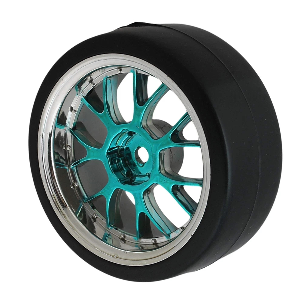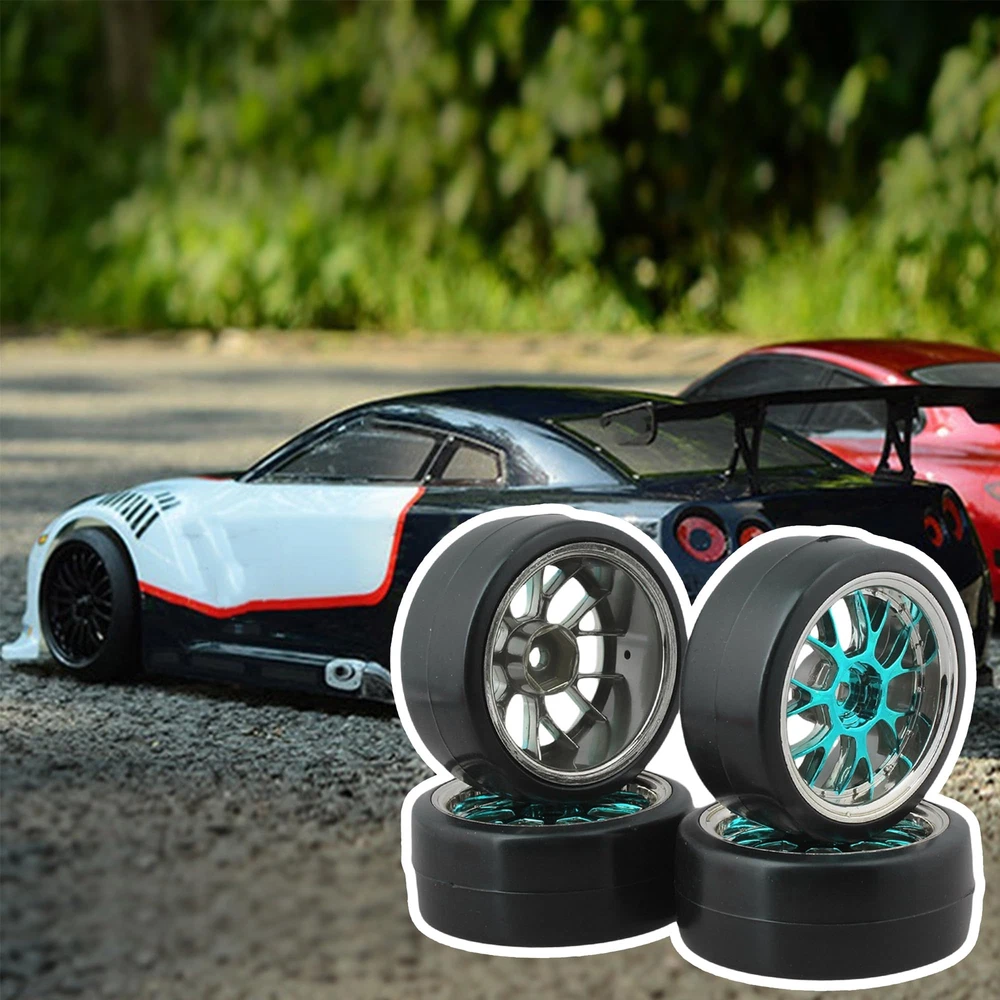 Suitable for RC 1:10 On-road racing car & drift car Material: Plastic tire + plastic wheel Hub (plating) They are plastic, making it more suitable for drifting. The quality of the rims is perfect, The product contains four wheels, the dimensions of the four are the same, and the dimensions are: Diameter 65MM, width 26MM, adapter: 12MM Tires and rims are separate parts that you need to install yourself. This also allows you to choose to replace the parts that need to be replaced
