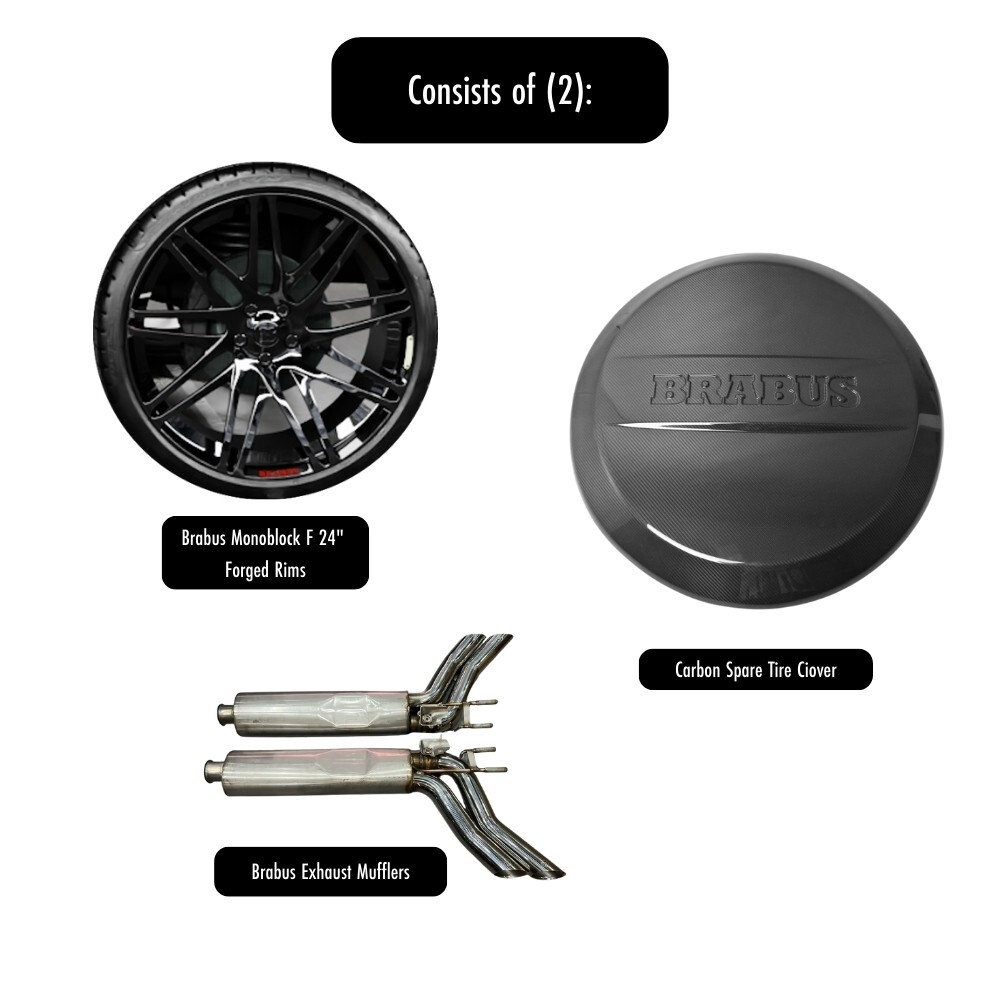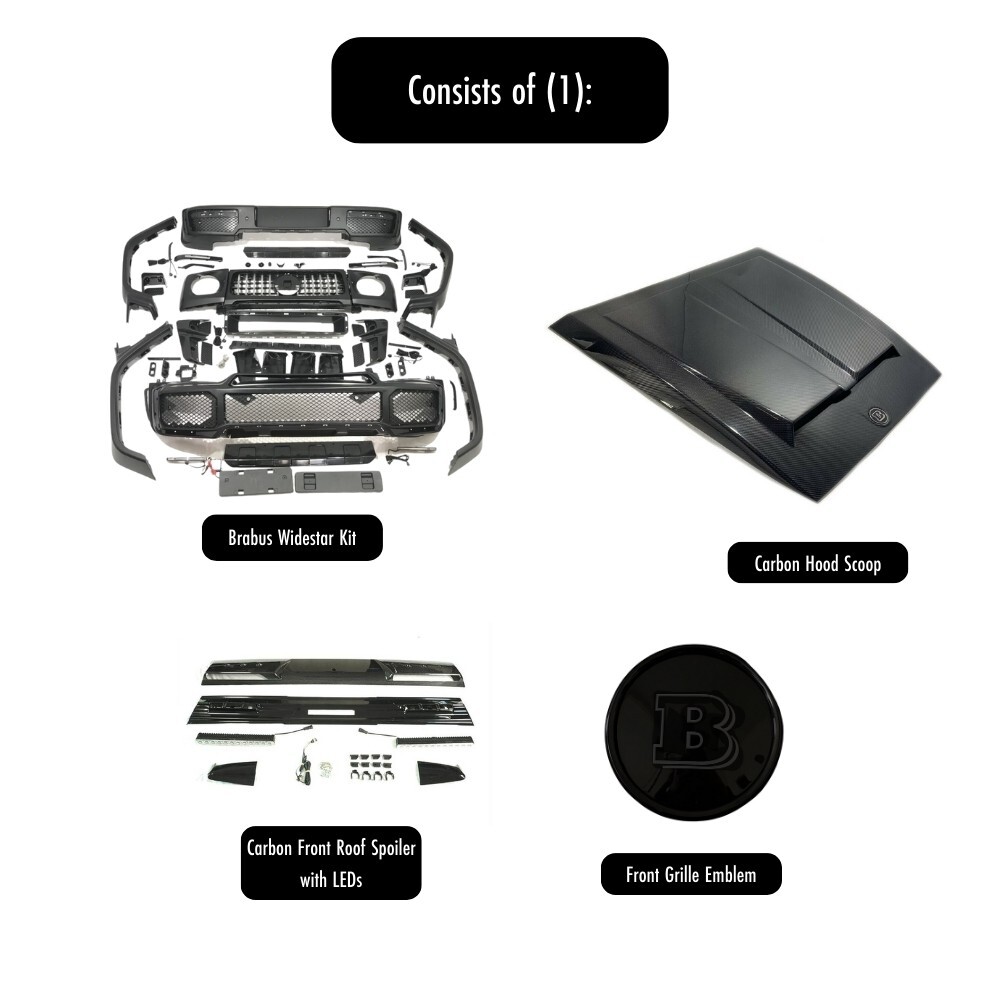 BRABUS 800 BLACK OPS STYLE CONVERSION KIT (W463A/W464 2018-2024) Premium aftermarket upgrade Manufactured using dry carbon technology OEM-level fitment Fast and secure international shipping ⸻ FITMENT Mercedes-Benz G-Class W463A/W464 (G63 / G500 / G550) Model years 2018-2024 Professional installation recommended ⸻ KIT INCLUDES • Black Ops-style widebody (high-grade ABS paint-ready plastic with flared fenders and bumpers) • Carbon hood scoop • Front carbon roof spoiler with LED • Carbon spare tire cover • Black ops style grille with an emblem • Brabus style exhaust mufflers • 24” forged wheels (Monoblock F style) ⸻ PRODUCTION & SHIPPING Lead time: 8–14 days Carefully packaged for international delivery Tracking provided ⸻ OPTIONS Additional configurations available upon request Contact us for full build details ⸻ Message us for full details, custom configurations, or installation guidance.