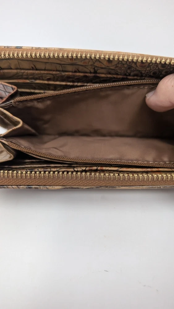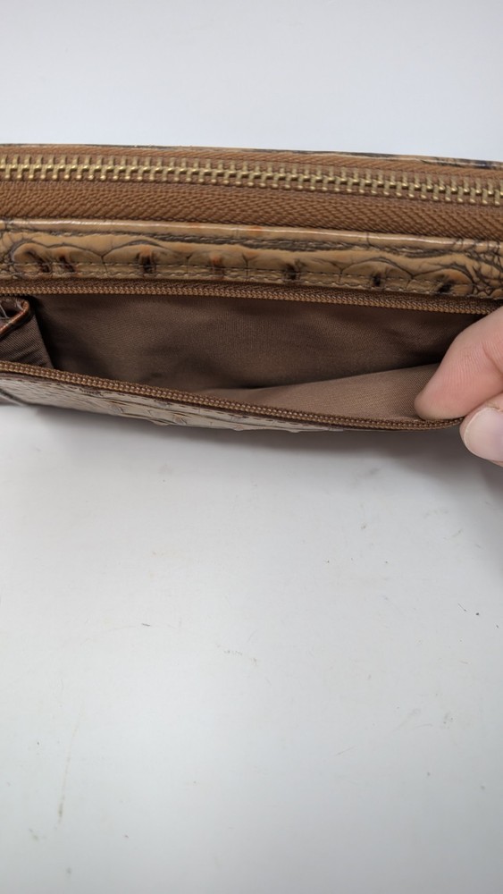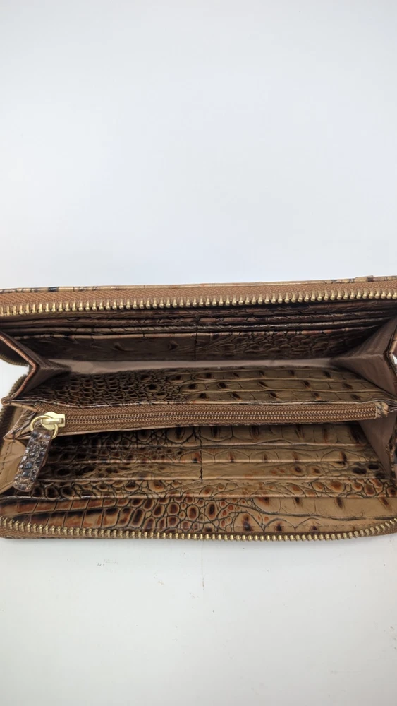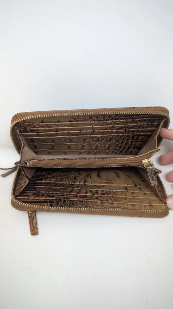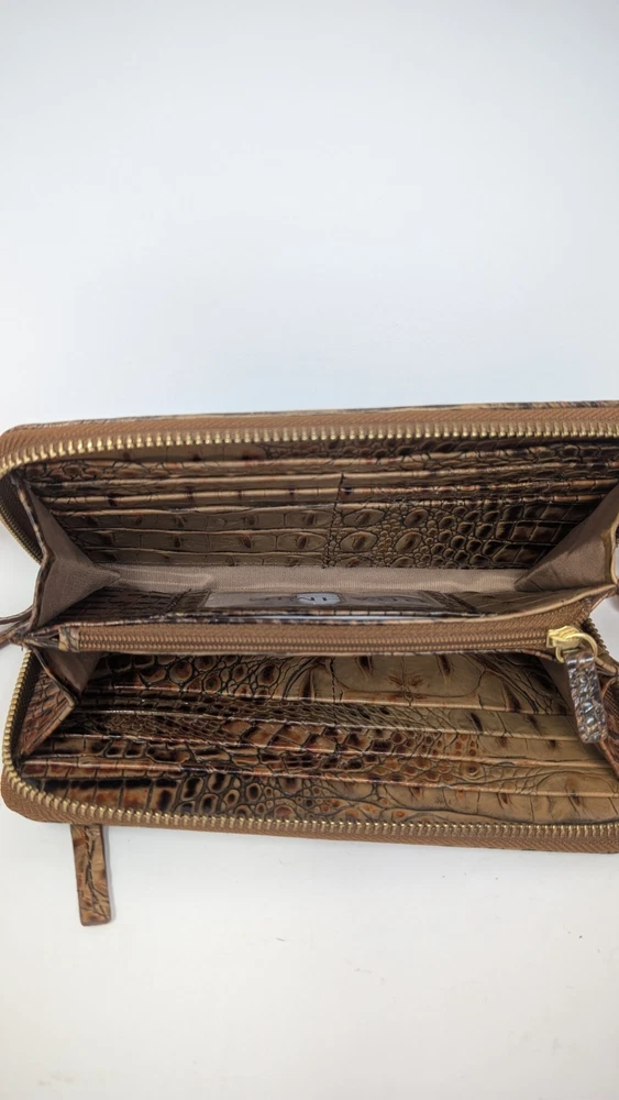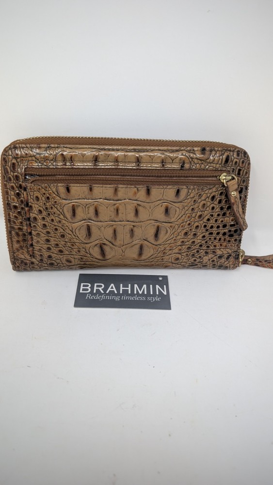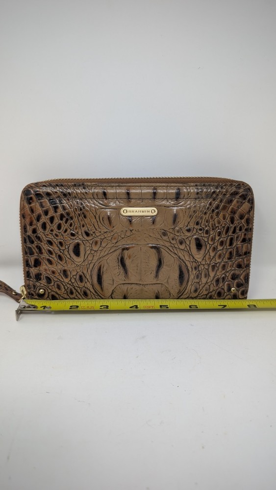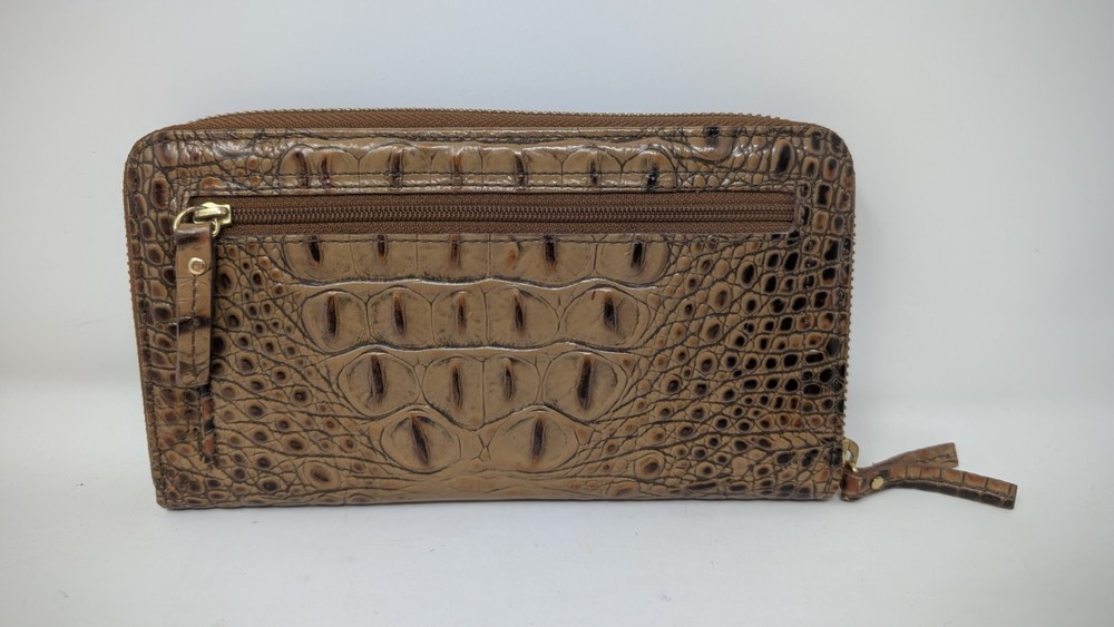 Please note that the colors are slightly faded compared to what can be seen in the photos. I tried to document it as best as I could, but did not do the greatest job with my camera unfortunately. This is pre owned with very little signs of use at all as can be seen in the photos. This wallet was $135 brand new so this is a great deal. It is 7.75 inches long and 4.5 inches tall with plenty of spaces to carry, cards, cash or whatever related items you may need. If you have any questions, please ask. Thank you for looking. The Brahmin Suri Zip-Around Wallet in Toasted Almond Melbourne Genuine Leather is a stylish and luxurious accessory for women. Made from high-quality leather with a crocodile pattern, this wallet features a zip-around closure and multiple credit card slots for organization. The rich pecan color and logo accents add a touch of sophistication, making it a perfect statement piece for any outfit. With its one-size design and folding capabilities, this wallet is both practical and chic for everyday use.