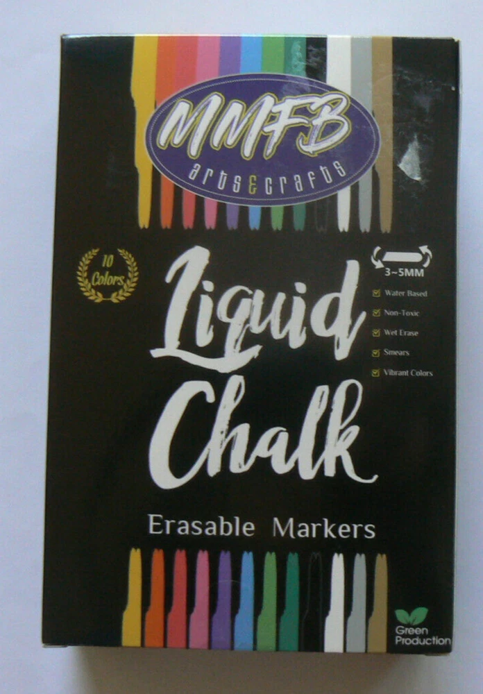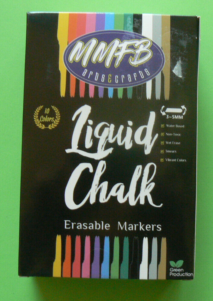 10 Liquid Chalk Erasable Markers From MMFB Arts & Crafts BRAND NEW IN BOX, still-sealed Reversible tips 3mm-5mm Colors are shown in photo of the side of the box (second photo) You won't be disappointed! I have recently obtained LOTS of acrylic markers and liquid chalk markers. Check them out! I have many books and lots of other items. Please take a look; I'm happy to combine shipping . ~~~~~~~~~~~~~~ Please take a look at my other listings; I'm listing many school books (and others) and am happy to combine shipping. All items coming from a smoke-free, pet-free home! Thanks so much for your time! Before leaving your feedback, if for any reason you feel I did not deserve or earn 5 stars in each category, please let me have the opportunity to make it right. I want every transaction to be 5-star worthy! Thanks so much! :)