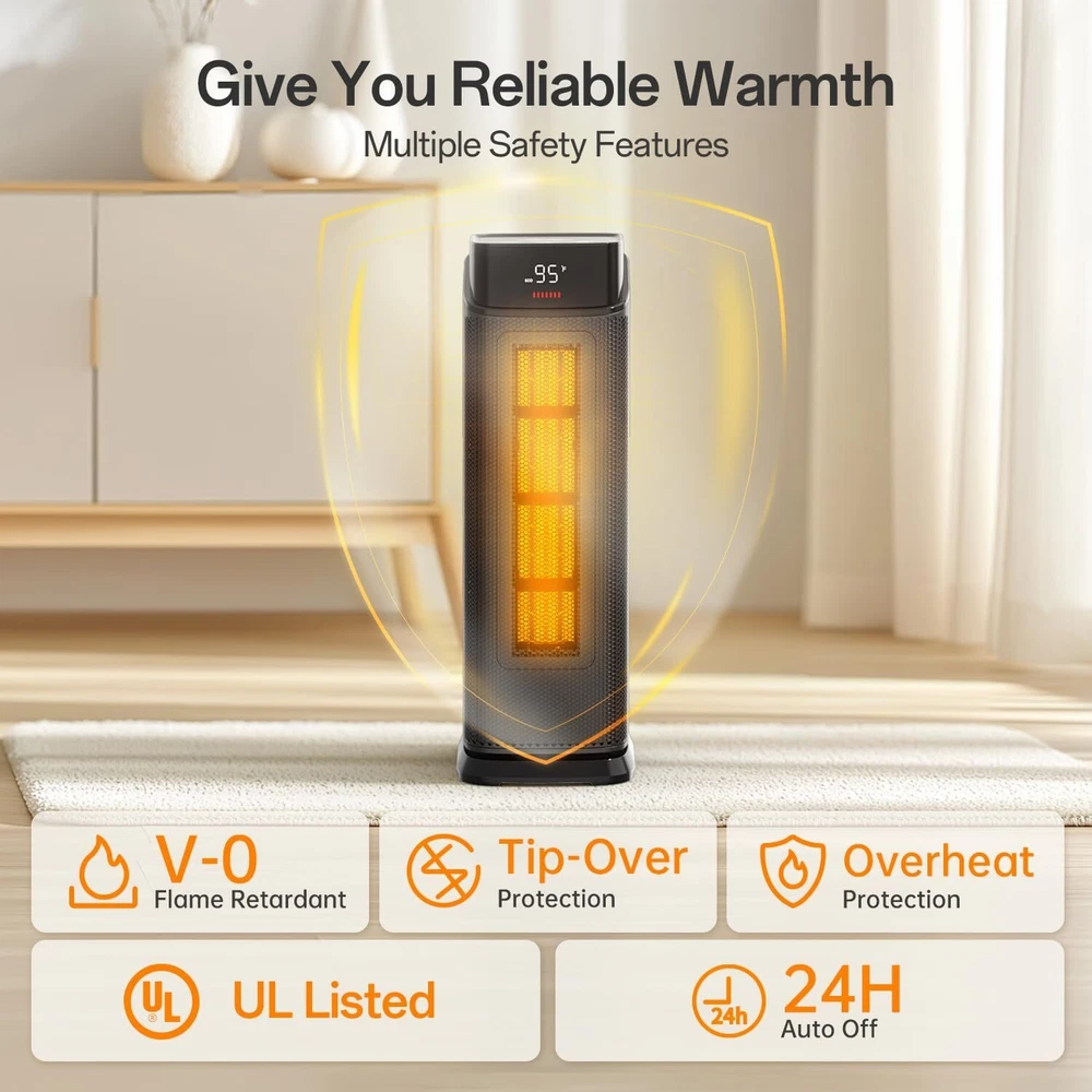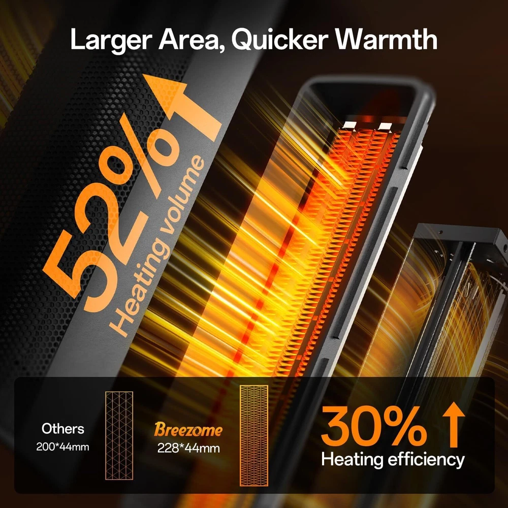 Special Feature Remote Control, Fast Heating, Adjustable Thermostat 59-95°F, 90° Wide Oscillation, Tip-Over & Overheat Protection Remote Control, Fast Heating, Adjustable Thermostat 59-95°F, 90° Wide Oscillation, Tip-Over & Overheat Protection Color Black B Form Factor Tower Indoor/Outdoor Usage Indoor About this item RAPID & POWERFUL HEATING: The Breezome space heater features an upgraded PTC element and advanced turbocharger technology, delivering heat in seconds and distributing warm air further. With 90°wide-angle oscillation and an extended wind wheel, it effectively doubles the heating range, making it ideal for rooms up to 250 sq.ft. RELIABLE SAFETY: Constructed from V0 flame-retardant material, the Breezome ceramic heater includes a 24-hour automatic shutdown feature, overheat protection, and built-in tip-over protection, all ETL certified. These safety measures offer comprehensive protection and peace of mind for you and your family. SMART & ADJUSTABLE: Featuring a built-in precise temperature sensor, the Breezome indoor heater includes an energy-efficient ECO mode. Set the temperature between 59-95℉, and let ECO mode maintain your ideal indoor climate cost-effectively. It also offers multiple power heat modes (H1/H2/H3) and a fan mode, allowing you to customize heating and air circulation based on your needs. QUIET & COZY WARMTH: The Breezome space heater employs a new airflow design and next-gen motor, reducing noise to just 37.5 dB. The screen brightness can be adjusted to 50%, and the included remote lets you control the heater without getting up, making the heater ideal for use at night, allowing you to enjoy a restful and undisturbed sleep. PORTABLE & CONVENIENT: The Breezome room space heater comes with a portable handle, making it easy to move between spaces such as the bedroom, living room, basement, garage, office, etc.It also includes a 24-hour timer, allowing you to set personalized running times via the control panel or remote. On Dec 20, 2024 at 18:01:11 PST, seller added the following information: