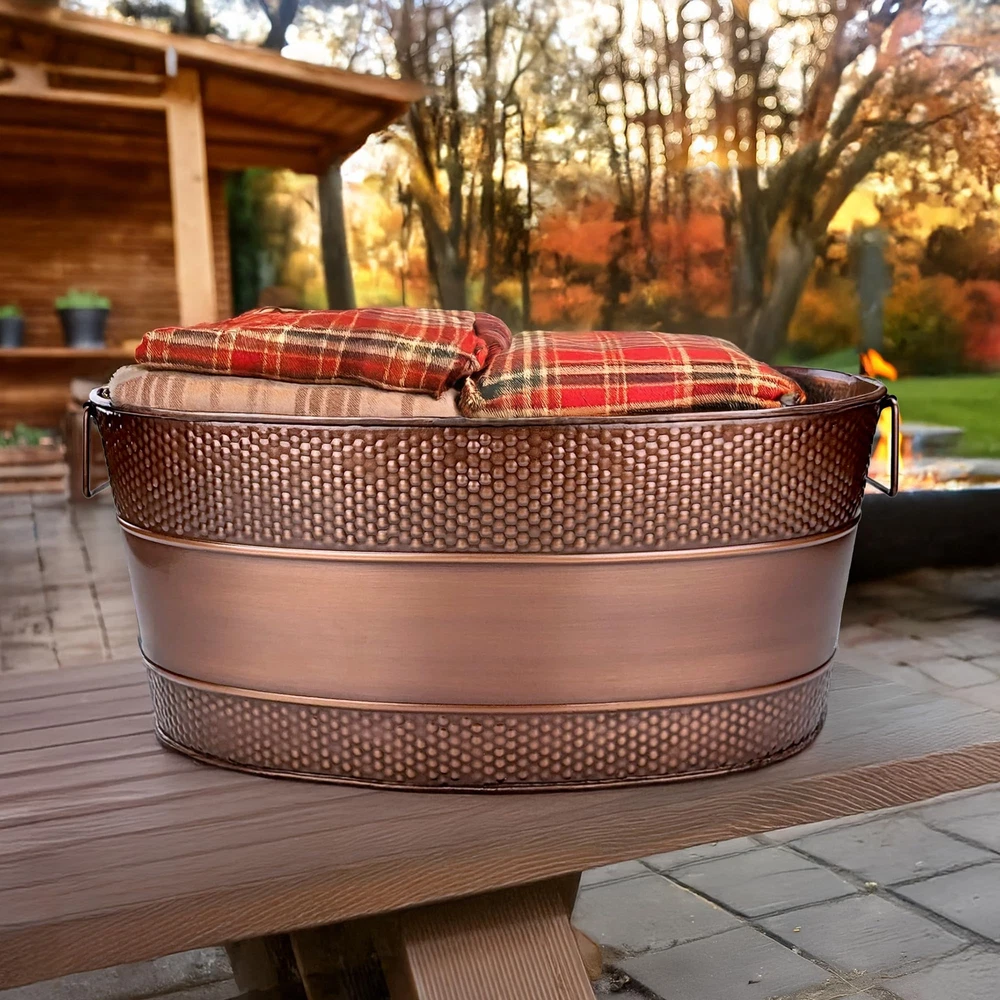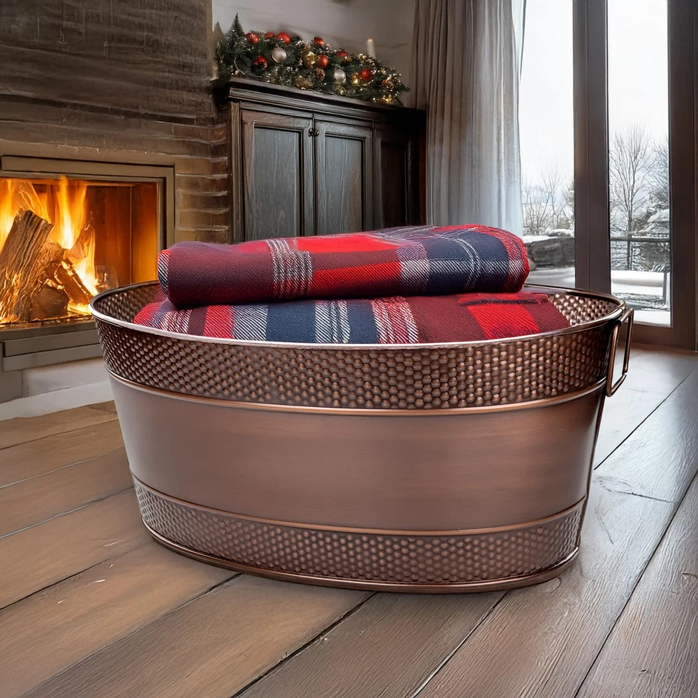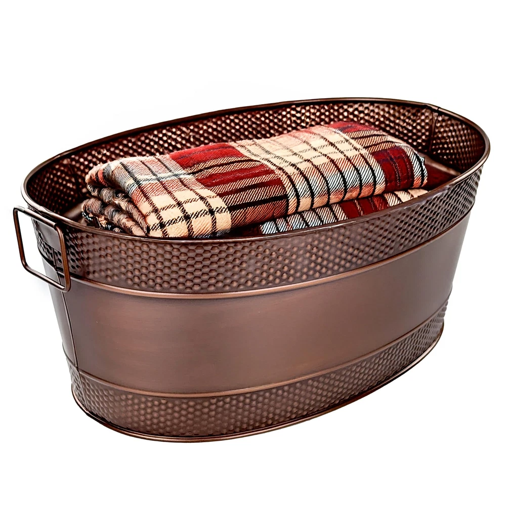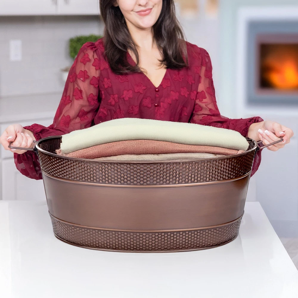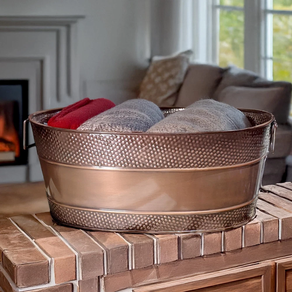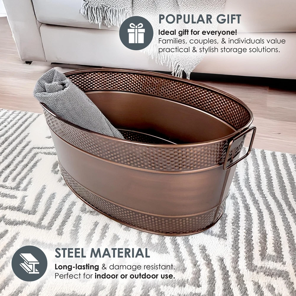 FARMHOUSE CHARM: Blanket basket for organization and storage with a beautiful copper finish & rustic appeal, perfect for adding warmth and style to your living room decor. HOME STORAGE BUILT TO LAST: Metal container built with an increased thickness for long-lasting durability. Blanket storage for living room or perfect for use as storage outdoors on chilly nights. HOME ORGANIZATION FOR EVERY ROOM: Stylish room organization for living room or bedroom storage; OR use as toy organizers and storage. Baskets for organizing, designed for versatile storage! MULTI-PURPOSE: Use as metal totes for storage OR an ideal durable basket for gifts for the happy couple celebrating their wedding, anniversary, or housewarming. SPECIFICATIONS: Material: Heavy-duty 0.45mm galvanized steel. Color: Antique Copper. Size: 21”L x 14"W x 9”H. Capacity: 25qt / 6 gallon. An ideal size for any room, indoors & outdoors.