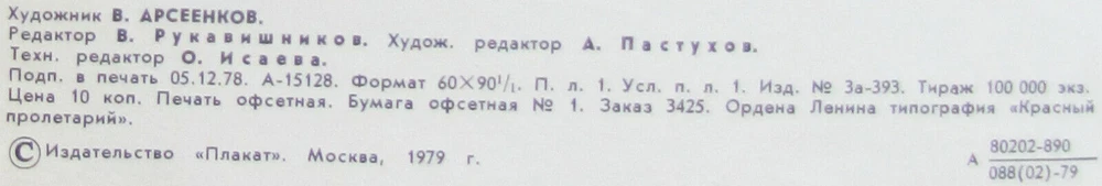Original slogan on the poster: 1979 ГОД - ПЕРВЫЙ ГОД ПРАКТИЧЕСКОГО ОСУЩЕСТВЛЕНИЯ РЕШЕНИЙ ИЮЛЬСКОГО ПЛЕНУМА ЦЕНТРАЛЬНОГО КОМИТЕТА ПАРТИИ. У РАБОТНИКОВ СЕЛЬСКОГО ХОЗЯЙСТВА ВПЕРЕДИ ГОД УПОРНОГО ТРУДА. Л.И. БРЕЖНЕВ. Literally English translation: 1979 - FIRST YEAR OF PRACTICAL IMPLEMENTATION OF THE DECISIONS OF THE JULY PLENUM OF THE CENTRAL COMMITTEE OF THE PARTY. THE WORKERS OF AGRICULTURE THERE IS COMING THE YEAR OF HARD WORK. L.I. BREZHNEV POSTER ARTIST: ARSEENKOV VIKTOR FEDOROVICH PRINT YEAR: 1979 SUBJECT: AGRICULTURE & CPSU TASKS LANGUAGE: RUSSIAN PRINT RUN: 100.000 PUBLISHED BY: "PLAKAT", MOSCOW SIZE: IN: 22 ½ x 33 = CM: 57 x 84 CONDITION: FLAT (SHIPPING ROLLED), VERY GOOD The poster calls all Soviet agriculture workers work hard at coming 1979 year in order to implement the agricultural plans approved by Communist Party of Soviet Union. The poster is in a very good shape. Before your bid please consider the poster condition from attached pictures and text description, if you still need more information please feel free to require additional pictures or video, it would be my pleasure to assist you with any questions regarding this auction. Shipping rolled in a hard plastic tube. www.facebook.com/sovietartposters Listing and template services provided by inkFrog