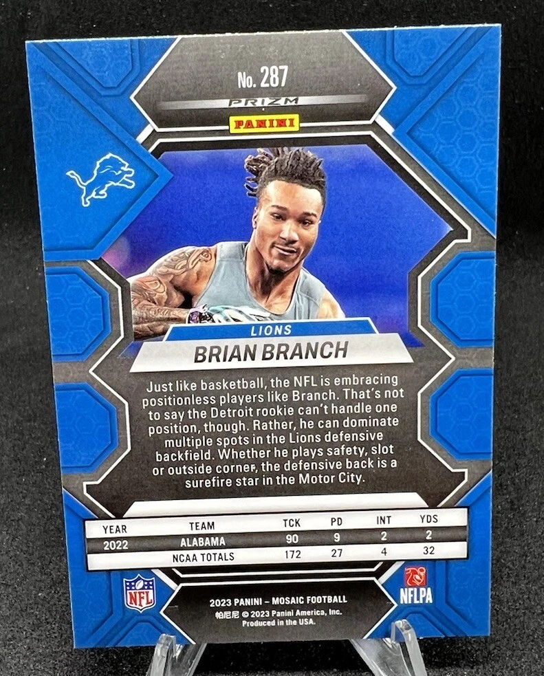 Autographed: No Sport: Football Set: MOSAIC FOOTBALL GREEN PRIZM ROOKIE LIONS Vintage: No Original/Licensed Reprint: Original Card Size: 3½" x 2½" Type: Sports Trading Card Character: BRIAN BRANCH Team: 8.27 Card Name: BRIAN BRANCH 2023 MOSAIC FOOTBALL GREEN PRIZM ROOKIE LIONS RC Q26 Season: 2023 Game: Unspecified Features: Rookie Player/Athlete: BRIAN BRANCH Card Number: Unspecified Franchise: Football Year Manufactured: 2023