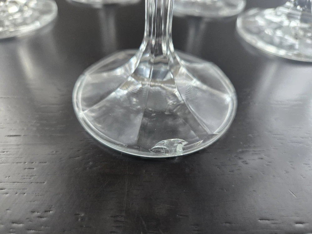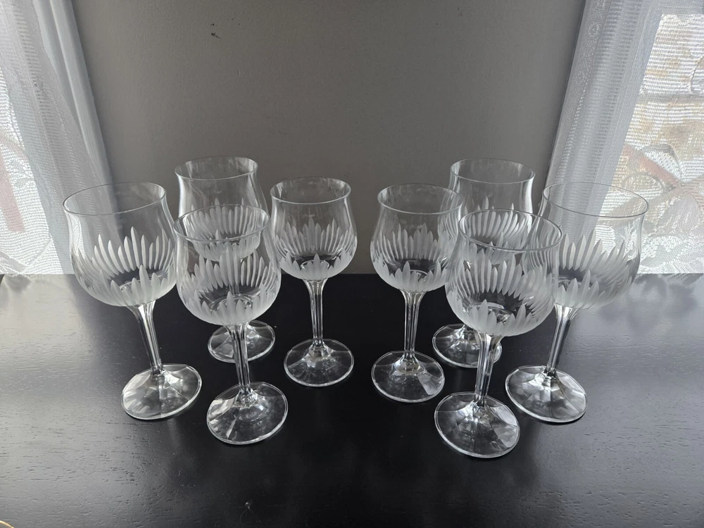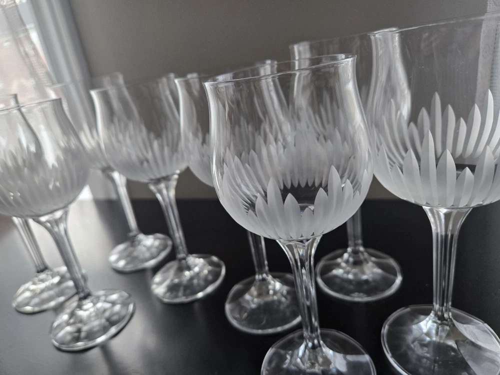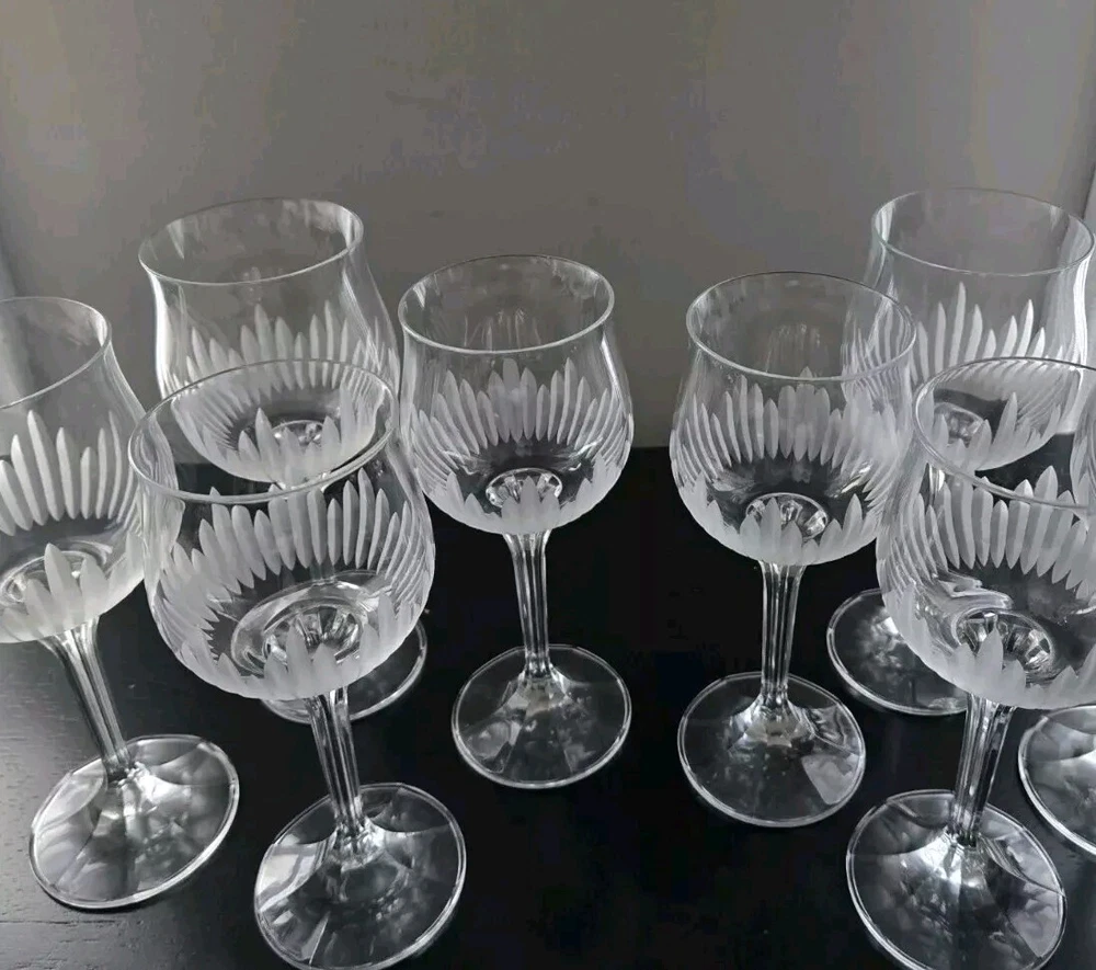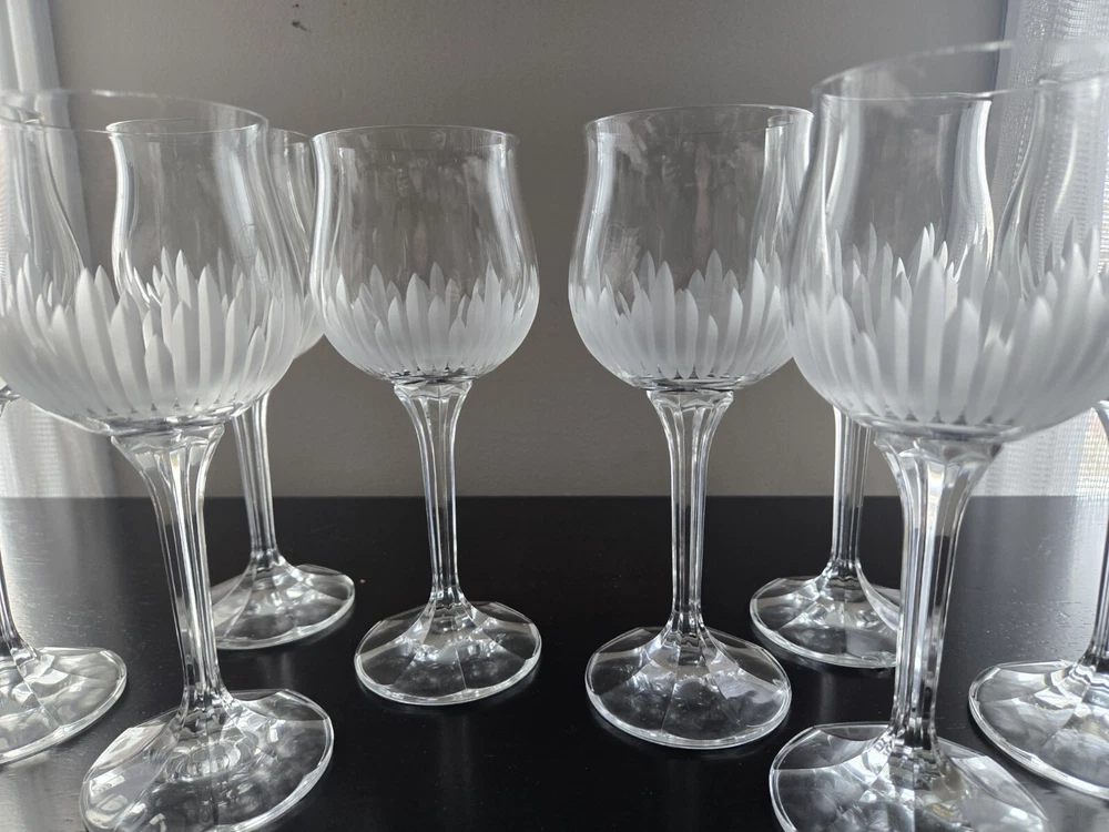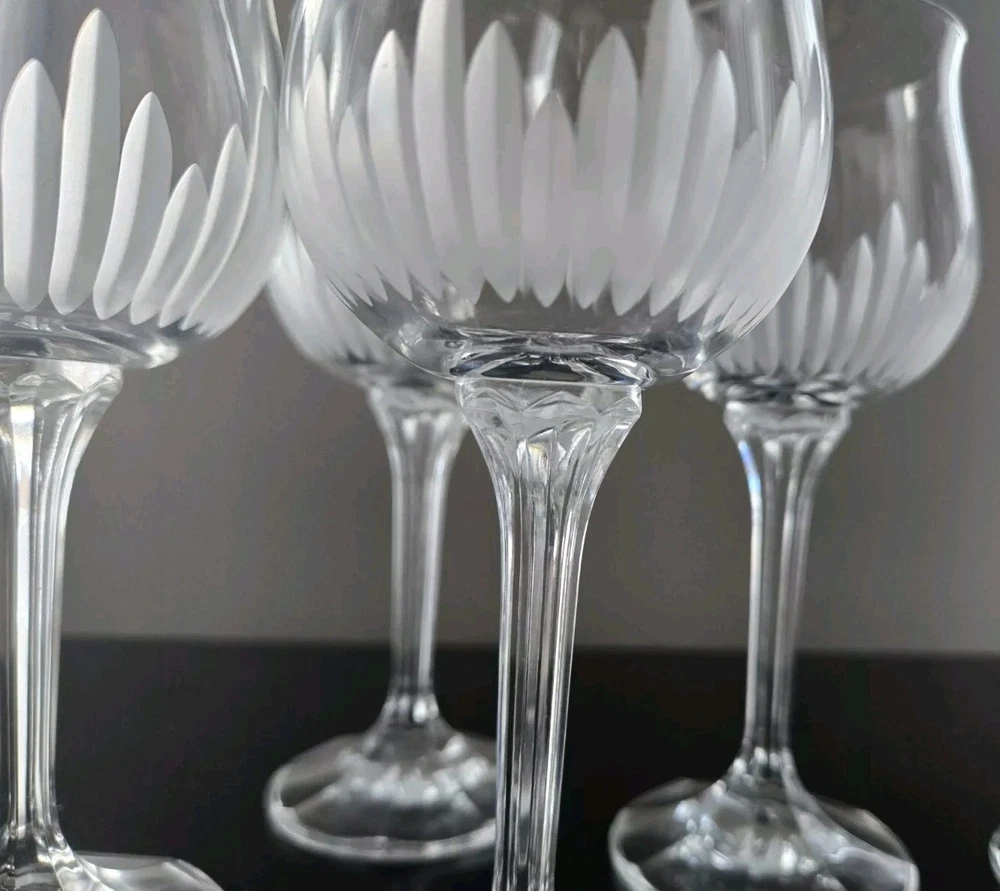 BRIGHTON Bohemia Crystal Glasses feature a stunning grey cut frosted design, perfect for various occasions like love & romance, Christmas, or birthday celebrations. This set of 8 wine glasses is hand-blown in Czechia with intricate etched patterns and a capacity of mL. The mid-century modern style and European floral theme add a touch of elegance to any table setting, making it an ideal choice for those who appreciate fine craftsmanship and exquisite design. BRIGHTON Bohemia Crystal Glasses SET OF 8 Grey Cut Frosted Includes: (4) 7" Water Glasses (4) 7" Wine Glasses *PLEASE NOTE* One of the water glasses has a defect on the base of the glass. I have provided a photo for referencing Very gorgeous set. Has flares in the top of the glass and a lovely etched pattern