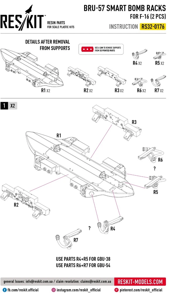 BRU-57 Smart Bomb Racks for F-16 (2 pcs) (3D Printed) Scale 1:32 ResKit RS32-0176 - for Plastic Model Kit Scale: 1/32 Manufacturer: RESKIT (Accessories for Scale Plastic Kits) Country/Region of Manufacture : Ukraine Features: Kit Condition : New in Box Type of equipment : Aircraft Type of product: PYLONS / BOMB RACKS Recommended kit: Any Category: RESIN & 3D ACCESSORIES For Scale Aircraft Model Kit ---------------------------- If you have a desire to procure a GREATER NUMBER OF ITEMS THAN WHAT IS CURRENTLY DISPLAYED, kindly let us know, and we will happily modify our offerings to suit YOUR EXACT QUANTITY NEEDS. ---------------------------- >>> Visit our eBay store! <<< You will find everything you need at great prices. Reskit: The Ultimate Upgrade for Your Scale Models Reskit is the leading provider of upgrade sets for scale models, offering a wide range of products to enhance the realism and detail of your models. Our sets include everything from engines and interiors to exterior accessories and weapons. Whether you're a beginner or a seasoned modeler, Reskit has the upgrade sets you need to take your models to the next level. Here are just a few of the benefits of using Reskit upgrade sets: Increased realism and detail: Our sets are made with high-quality materials and components that will add a touch of authenticity to your models. Improved performance: Our sets can help improve the performance of your models, making them more realistic and engaging. Reskit upgrade sets are the perfect way to add realism, detail, and performance to your scale models. With our wide range of products, you can find the perfect upgrade set to transform your models into showpieces.
