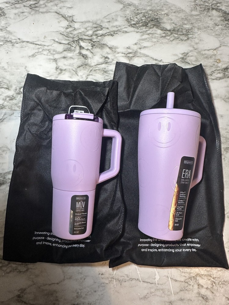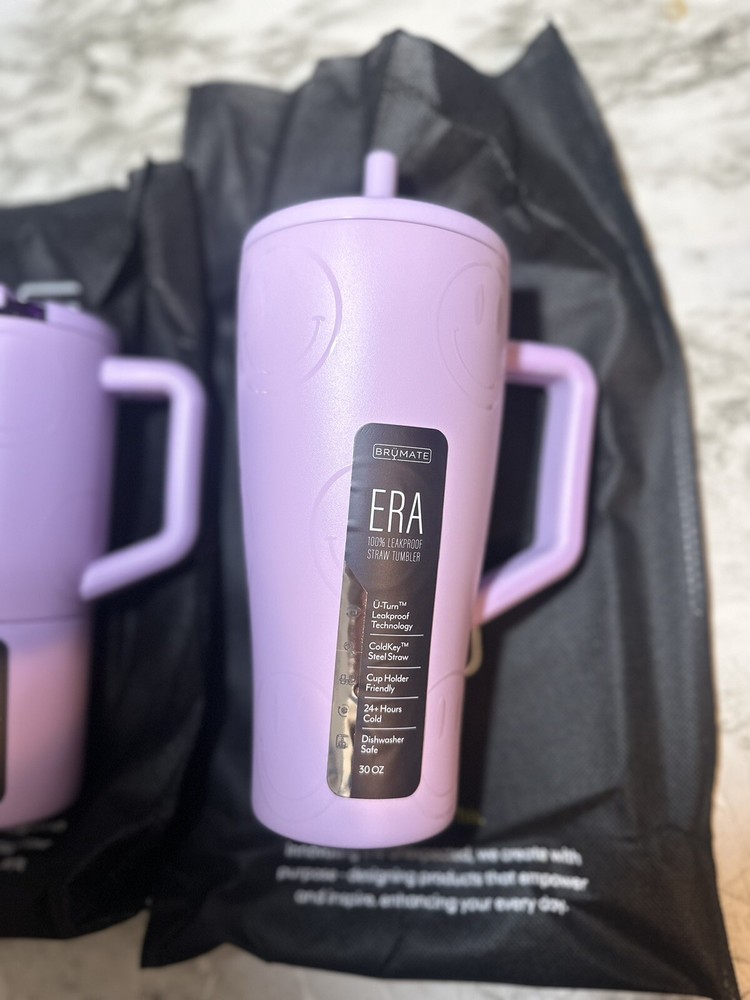 Was taking out of packaging for pictures Enhance your beverage experience with the limited edition BRUMATE Era 30oz and Muv 25oz Happy Hour Collection Tumbler. This three-piece set comes in a stunning Dusk purple color with a drink-through lid, making it easy to enjoy your favorite hot or cold drinks on the go. The tumbler is made of high-quality stainless steel, ensuring durability and longevity. The tumbler can keep your drinks cold for up to 12 hours, making it perfect for any occasion. Its insulated feature ensures that your drink maintains its temperature, while the happy hour collection design adds a touch of style to your beverage. This travel tumbler is perfect for teens, adults, and girls who want to enjoy their favorite drinks on the go.