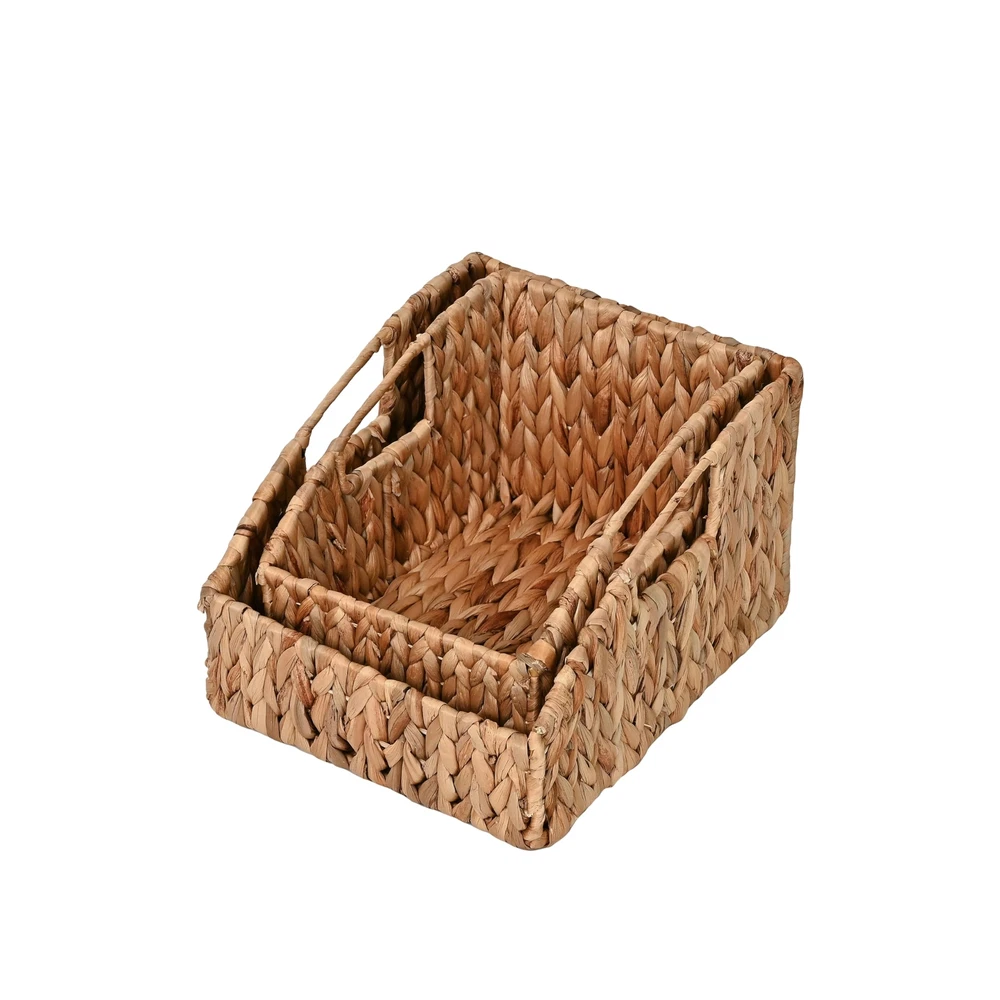 Organize your kitchen or pantry with these handwoven, easy-to-slanted baskets that stack within another. Made of an iron frame and hyacinth weaving, this storage bin adds a touch of bohemian and coastal decor to any home. When not in use, nest the baskets on each other to save space. These baskets have a beautiful natural tone from their hyacinth weaves, adding coastal style to any space; crafted by artisans, the color can be slightly different than shown baskets of various sizes with wire frames and hyacinth weaving, and built-in handles per basket The hyacinth weave on our basket pair complements any coastal or bohemian decor in your home Product Measurement: 9 "W x 11 "D x 7 "H, 7.5 "W x 9.5 "D x 6.5 "H, Do not stand or sit on unit. Wipe clean with a soft cloth dampened in water and mild soapy solution. Wipe dry with a clean, dry cloth. Keeping this unit clean and storing it properly makes it last year after year.