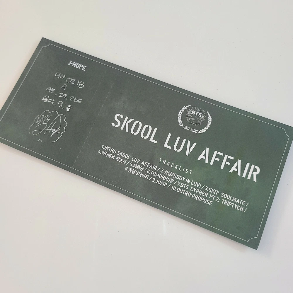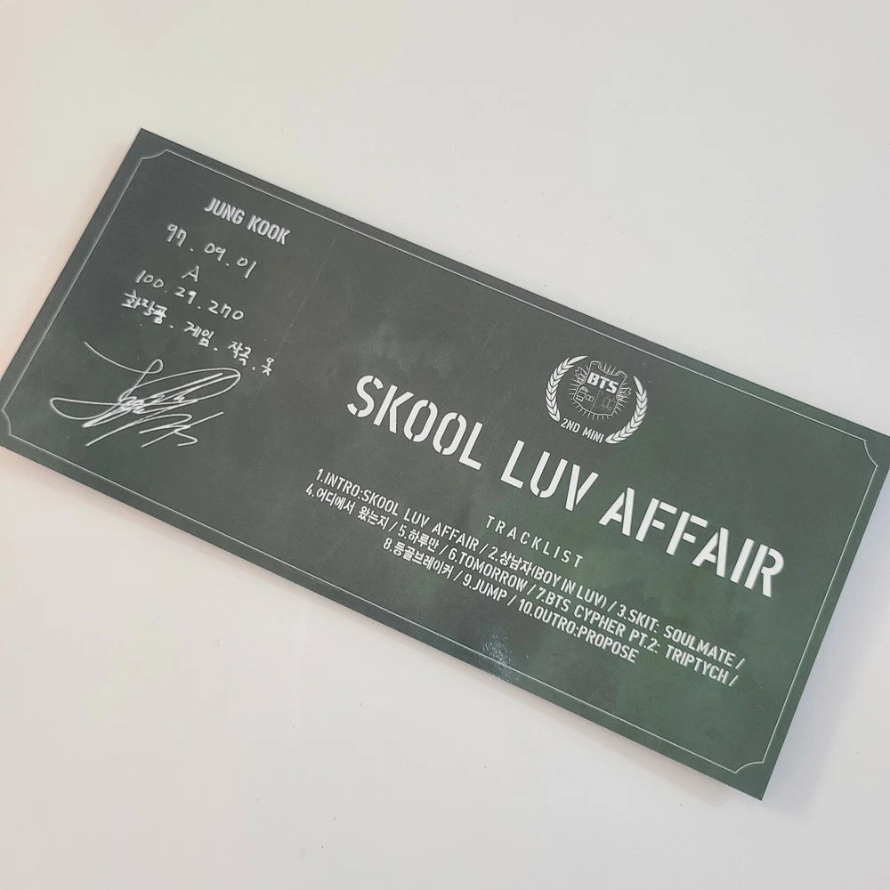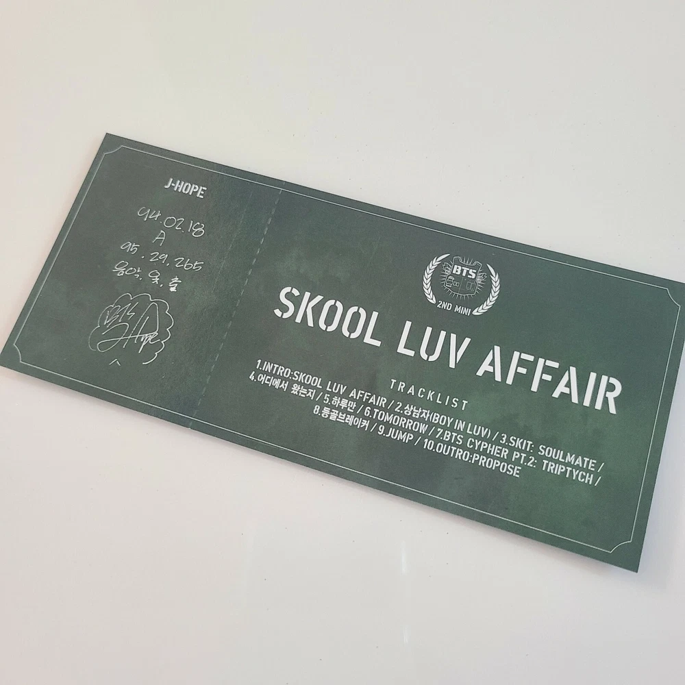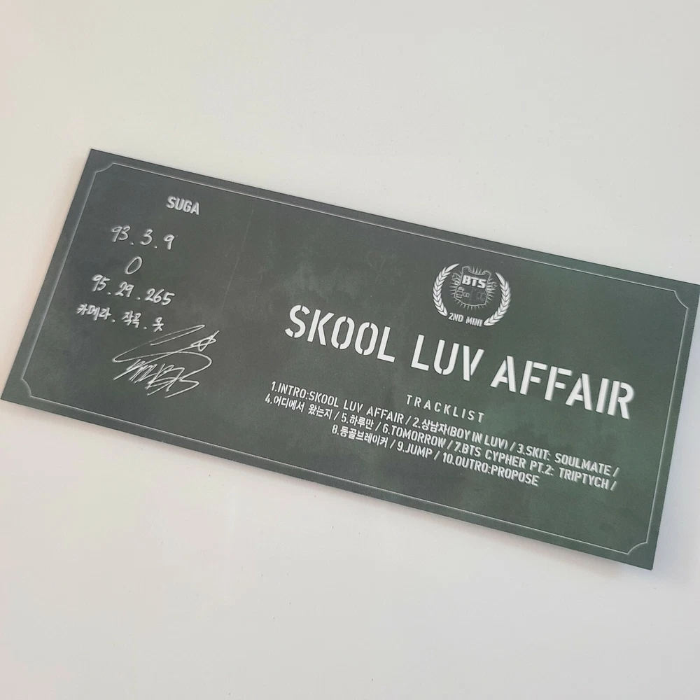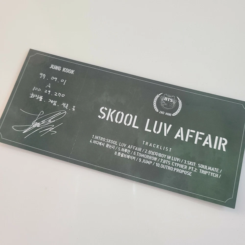 BTS SKOOL LUV AFFAIR Official Photocard (2nd Mini Album) This is 100% authentic, official photo card Only Photocard Condition : NEW Standard shipping : Tracking number provide [Shipping & Handling ] We ship to worldwide. We ship your order within 1~2 business days after your payments. All items are shipped from South Korea We will more carefully packed your purchase item Standard shipping : Tracking number provide Delivery may be delayed further due to the current situation [ RETURN POLICY ] We do quality check before sending out items. Only if you received defective products, please return within 30 days from the date you received the item and we will replace them for you. Buyers are responsible for shipping and handling fees on return items under any circumstances. Please notify us before sending back items. [ OTHER POLICIES ] We are not responsible for any custom duty or import tax. We'll answer your inquiries within 24 hrs.