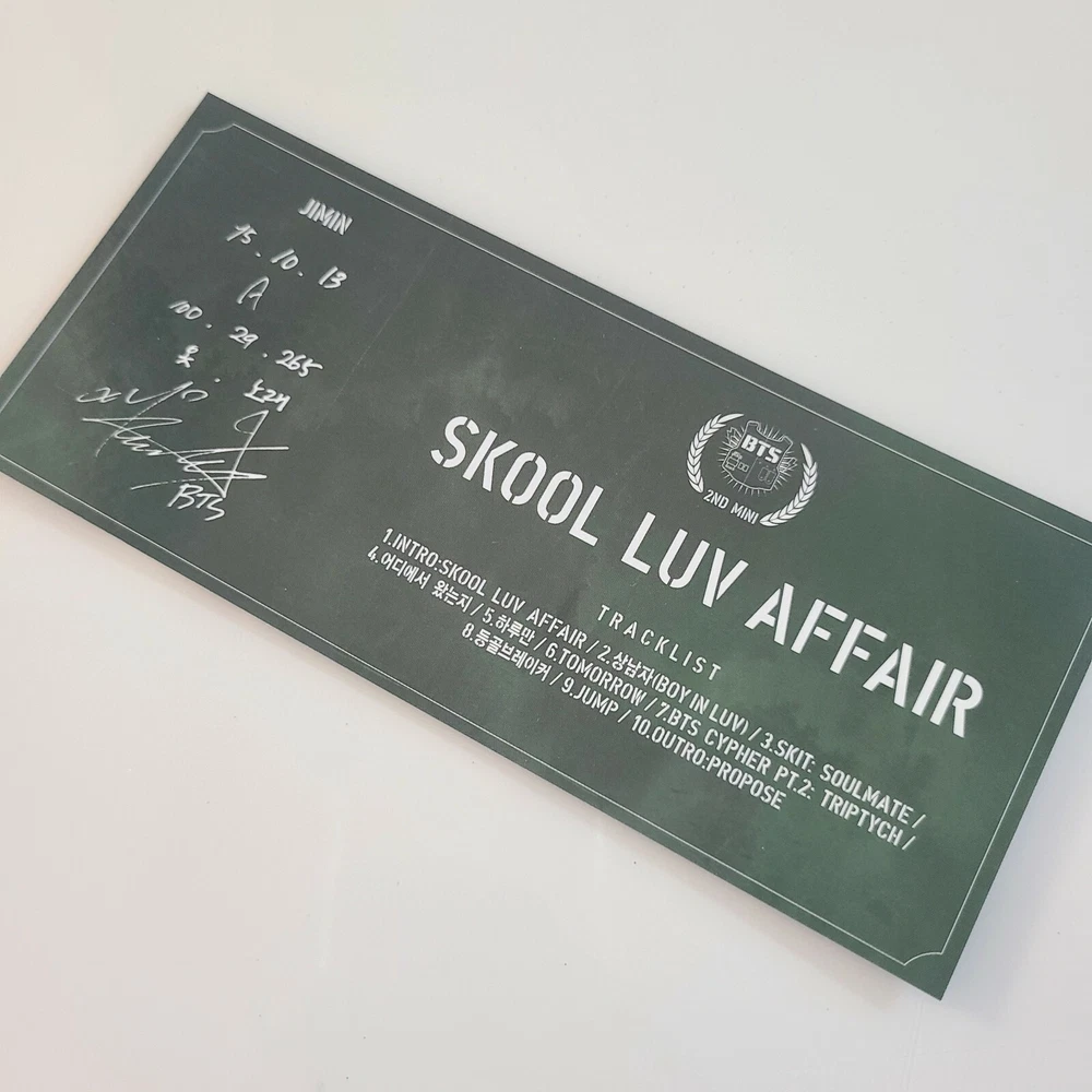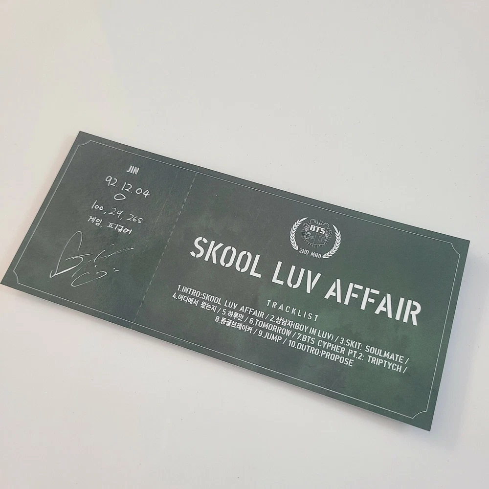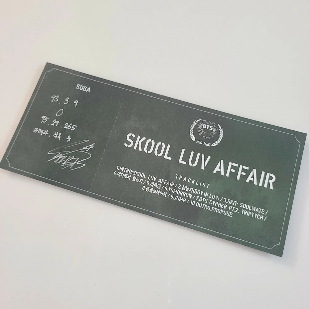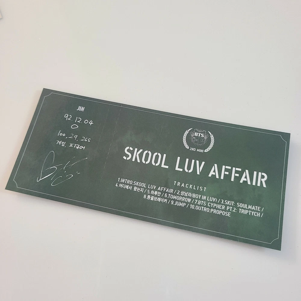 BTS SKOOL LUV AFFAIR Official Photocard (2nd Mini Album) This is 100% authentic, official photo card Only Photocard Condition : NEW Standard shipping : Tracking number provide [Shipping & Handling ] We ship to worldwide. We ship your order within 1~2 business days after your payments. All items are shipped from South Korea We will more carefully packed your purchase item Standard shipping : Tracking number provide Delivery may be delayed further due to the current situation [ RETURN POLICY ] We do quality check before sending out items. Only if you received defective products, please return within 30 days from the date you received the item and we will replace them for you. Buyers are responsible for shipping and handling fees on return items under any circumstances. Please notify us before sending back items. [ OTHER POLICIES ] We are not responsible for any custom duty or import tax. We'll answer your inquiries within 24 hrs.
