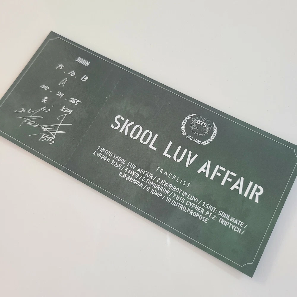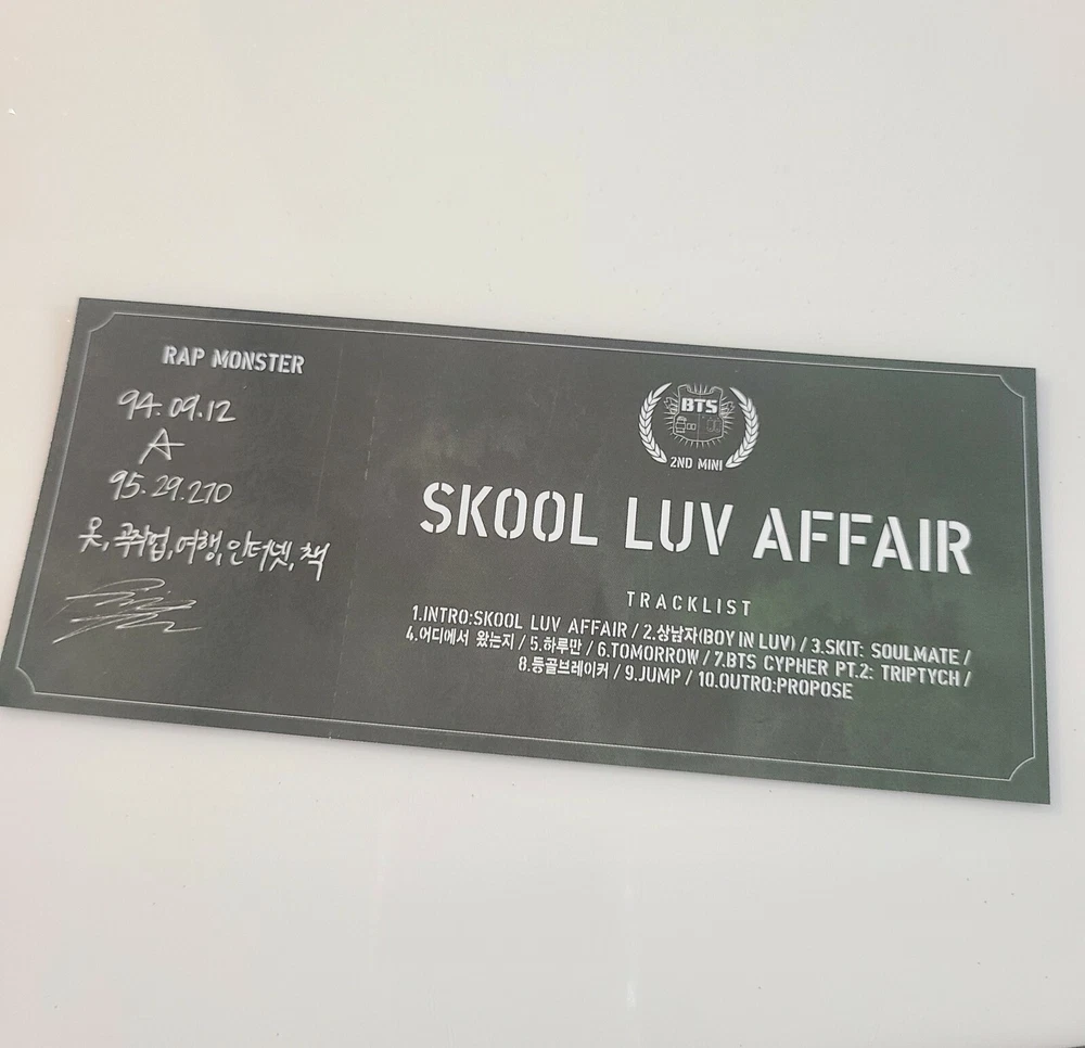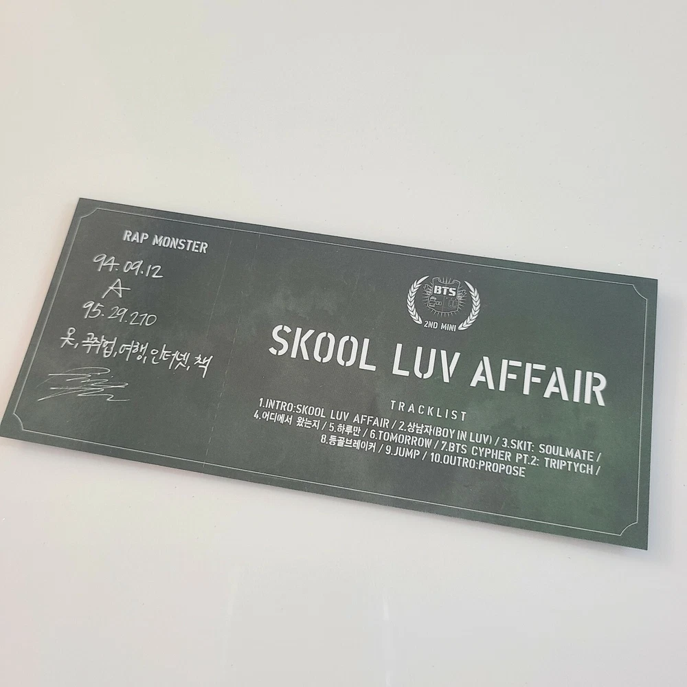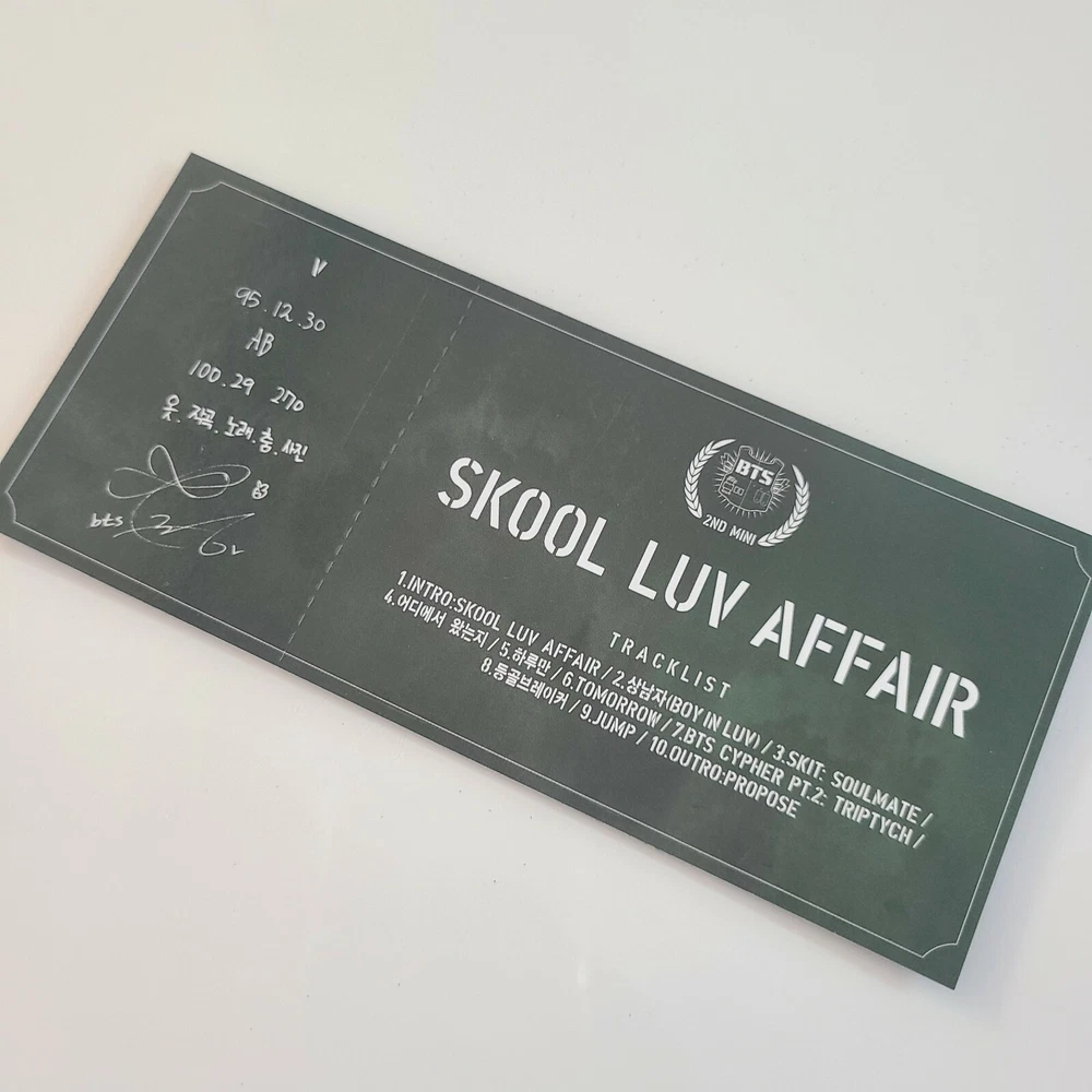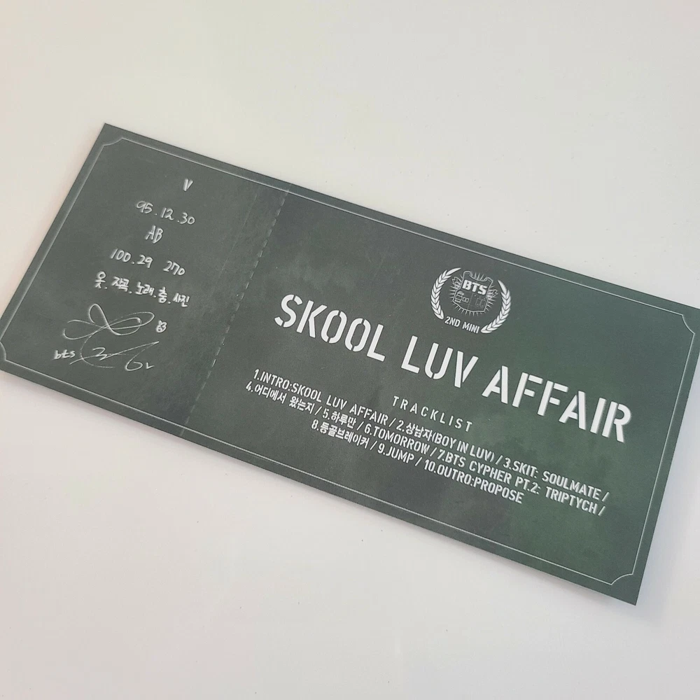 BTS SKOOL LUV AFFAIR Official Photocard (2nd Mini Album) This is 100% authentic, official photo card Only Photocard Condition : NEW Standard shipping : Tracking number provide [Shipping & Handling ] We ship to worldwide. We ship your order within 1~2 business days after your payments. All items are shipped from South Korea We will more carefully packed your purchase item Standard shipping : Tracking number provide Delivery may be delayed further due to the current situation [ RETURN POLICY ] We do quality check before sending out items. Only if you received defective products, please return within 30 days from the date you received the item and we will replace them for you. Buyers are responsible for shipping and handling fees on return items under any circumstances. Please notify us before sending back items. [ OTHER POLICIES ] We are not responsible for any custom duty or import tax. We'll answer your inquiries within 24 hrs.