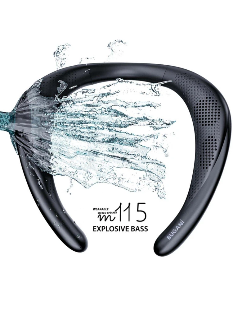 [True 3D Theater-Stereo Sound]-- Built-in 3W*2 speakers system, the wireless neck speaker produces rich sound and an enhanced bass that goes far beyond its size. Upward-facing speakers on both sides of the neck speaker produce 3D theater sound surrounding your ears to create a truly unique and immersive sound experience. [Comfortable Shoulder Speaker]-- Made of soft silicone material, this neckband speakers with ergonomic design can be adjusted to fit your neck line, and 220g weigh speaker rests on your shoulders providing a lightweight and secure fit for listening to all day. Enjoy your favorite tunes while you are cooking, resting in your yard, walking, etc. [IPX5 Waterproof & Long Battery Life]-- This waterproof wearable speaker is sweat and weather-resistant. Suitable for outdoor sports such as walking, riding bicycle, climbing mountains, etc. The neck bluetooth speaker included a premium rechargeable built-in 1000mAh battery that provides up to 24 hours of playtime at 60% volume (12 hours at 100% volume). [Hands-Free Calling & Easy to Carry]-- This wireless bluetooth speaker built-in noise-canceling microphone for a clearer sound, wearing it around your neck to reduce the burden on the ears and hands. The lightweight and bendable speaker can fit easily into your carry-on backpack, very convenient to take anywhere to listen to music, answer calls, or watch TV. [Stable Bluetooth 5.0 Technology]-- Equipped with an advanced Bluetooth 5.0 chip, the neckband speaker ensures a 33ft (10m) long-range and more stable connection. Compatible with most bluetooth devices and give you sound for listening and conversations. Package included: 1* Bugani M115 Wireless Neck Speaker, 1*Type-C charging cable, 1*Quick Users Guide.
