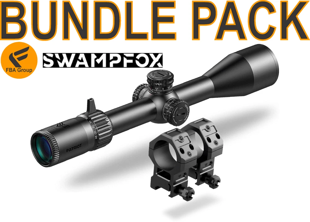 Swampfox Patriot Bundle with Swampfox Freedom Rings 1.93" Height Patriot Precision Series is a 100% battery-free optic with a reliable, simple 30mm tube. It maximizes internal design for the best eye box, sight picture, and high magnification. Zero-resettable target turrets feel crisp, with audible clicks ensuring correct adjustment. First focal plane (FFP) Sharpshooter etched reticle stays true at all magnifications. Sharpshooter Grid Reticle MOA paired with 0.25 MOA / 0.1 MRAD clicks. Outstanding eye box for ease of use even at high magnifications. Ultra-bright and flat sight picture. Fast focus adjustable ocular. Premium glass coatings. Zero-resettable turrets. Included Low- and High-profile Magnification throw fins. Included high quality flip caps. 50,000 Round Guarantee.