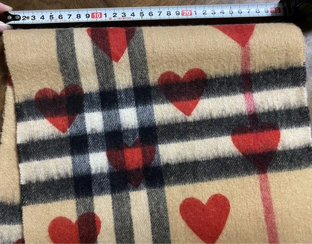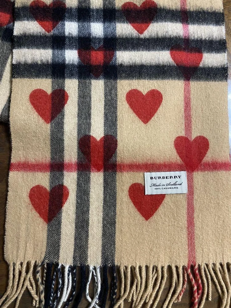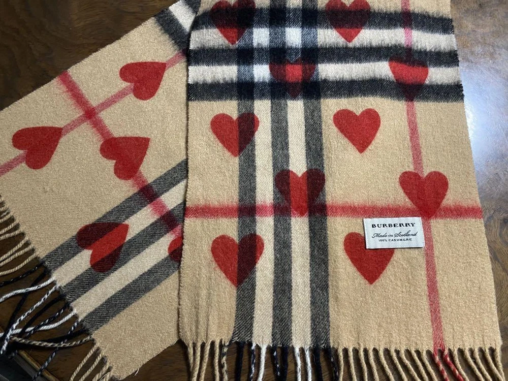 gtin13: Does not apply Type: Scarf Brand: Burberry Department: Women Seller Notes: “"Nearly unused"” Pattern: Heart pattern UPC: Does not apply Style: Scarf Color: Beige Country/Region of Manufacture: Scotland Material: 100% Cashmere Size: 168 × 30 cm