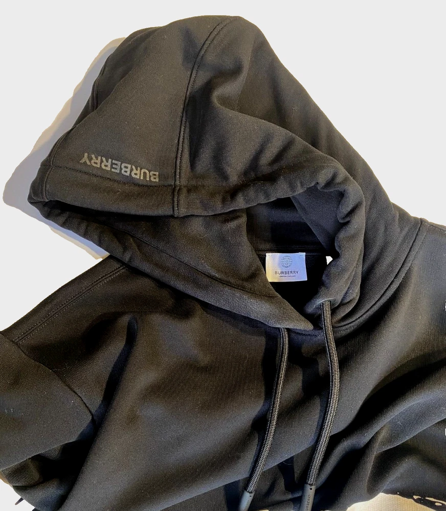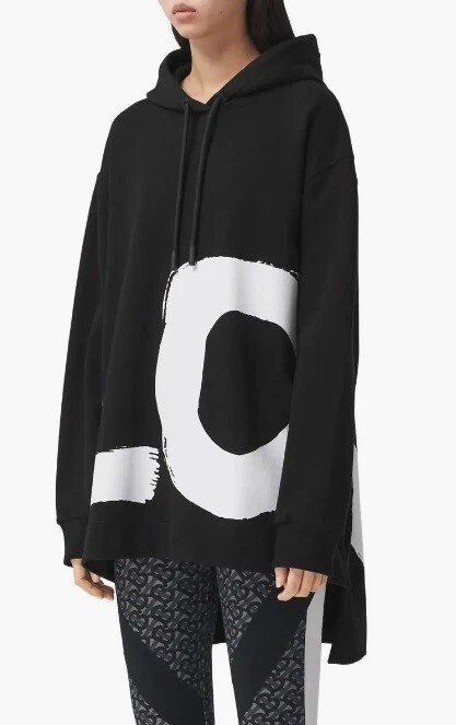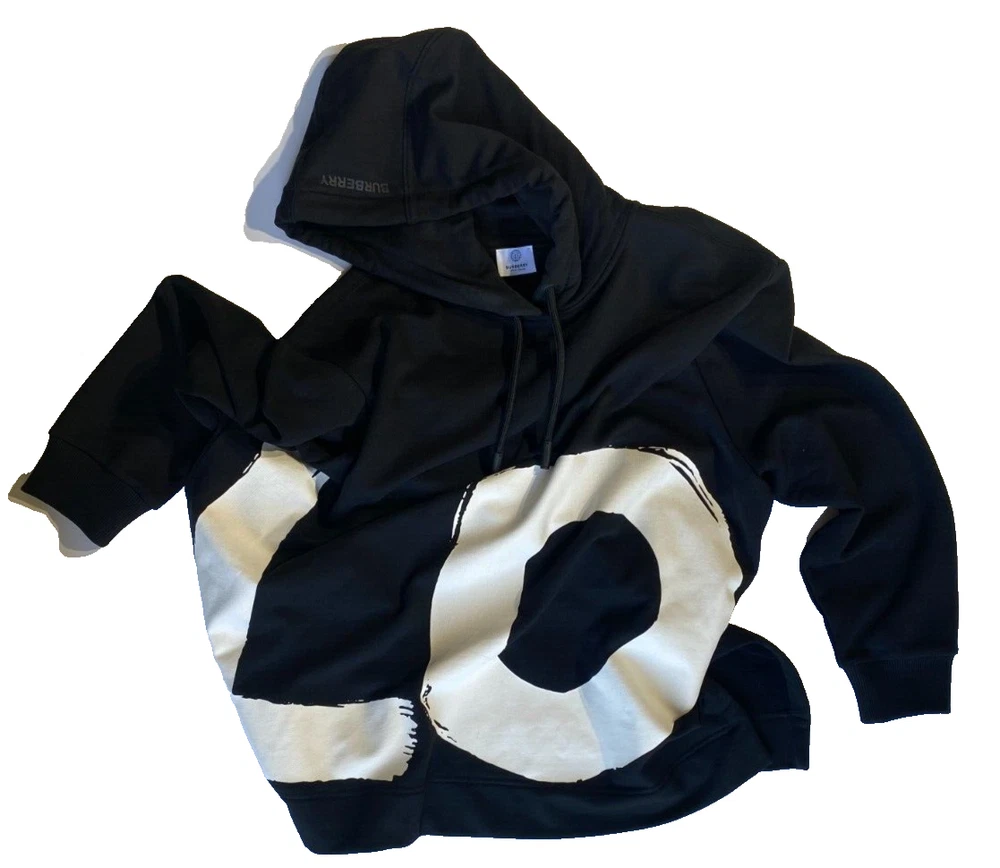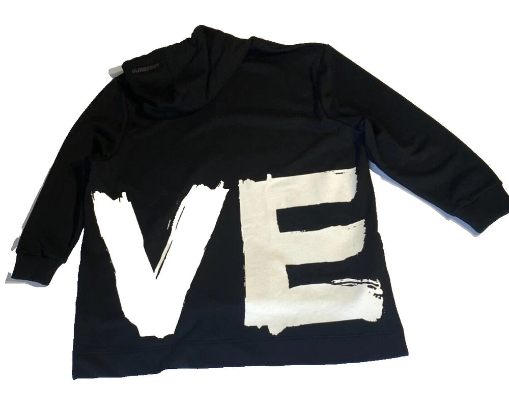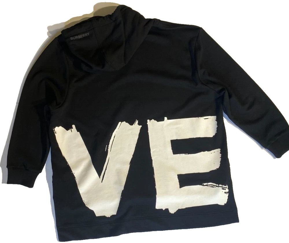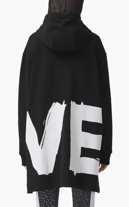 This Burberry London Aurore hoodie in black is the perfect addition to any activewear collection. The oversized fit and drawstring closure make it both comfortable and stylish. The hoodie features a plain design with the words "LOVE" accented in a bold font. Made from 98% cotton and 2% elastane, this hoodie is perfect for winter, fall, and spring seasons. It is a fashion piece that is more comfortable than a sweatshirt. The size is small petite, making it a great fit for women who prefer a regular size. This hoodie is part of the Burberry product line and is manufactured in Portugal.
