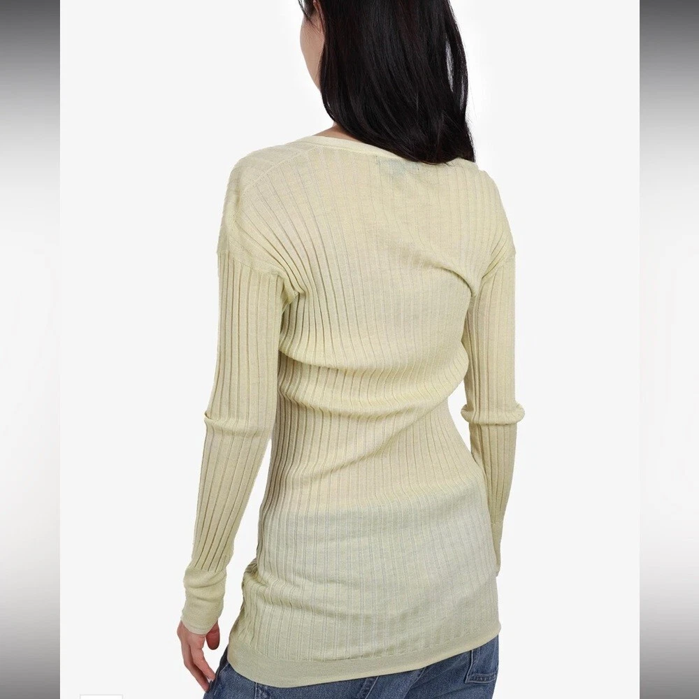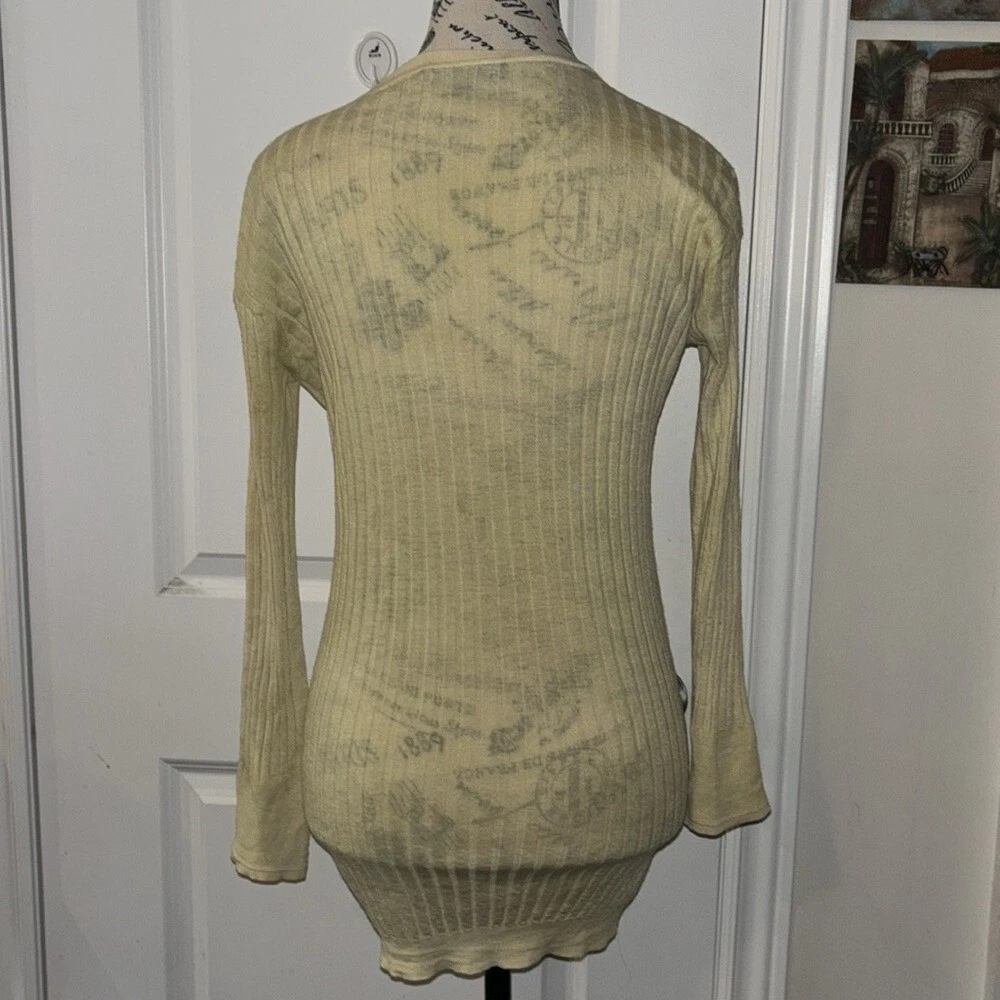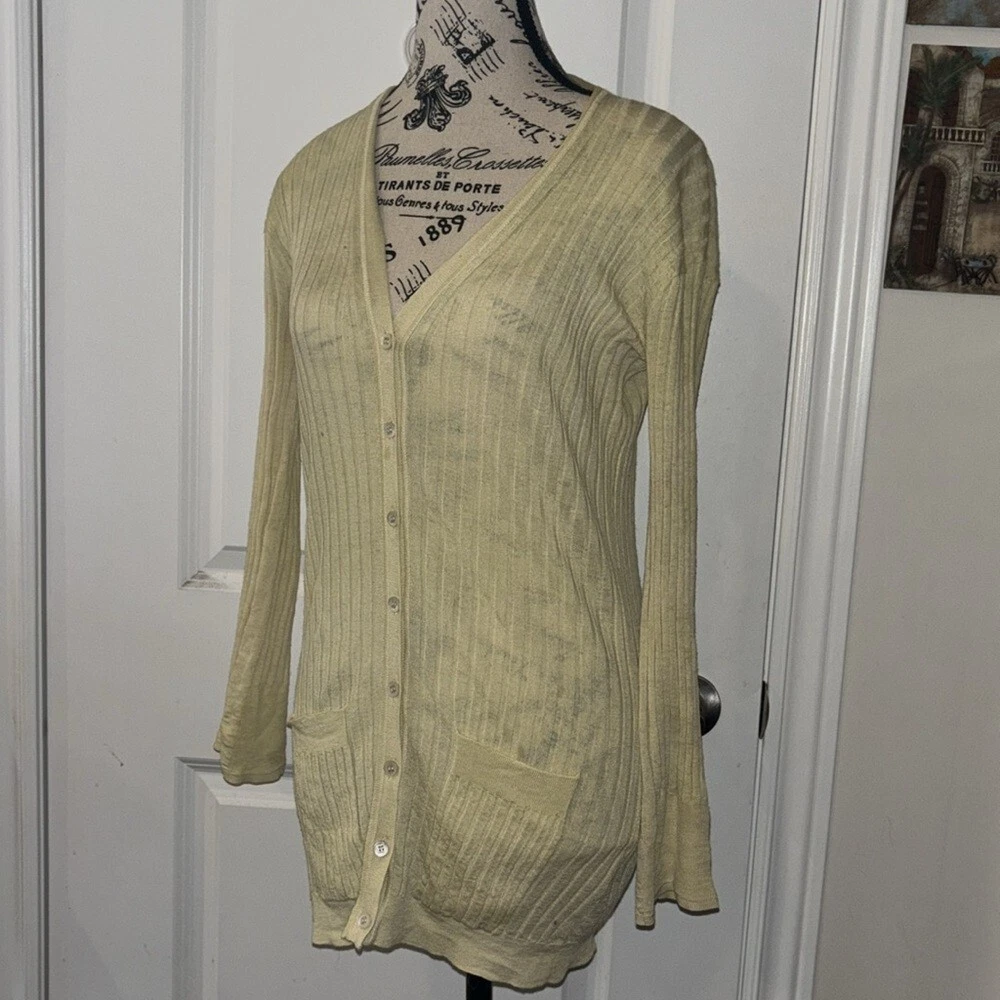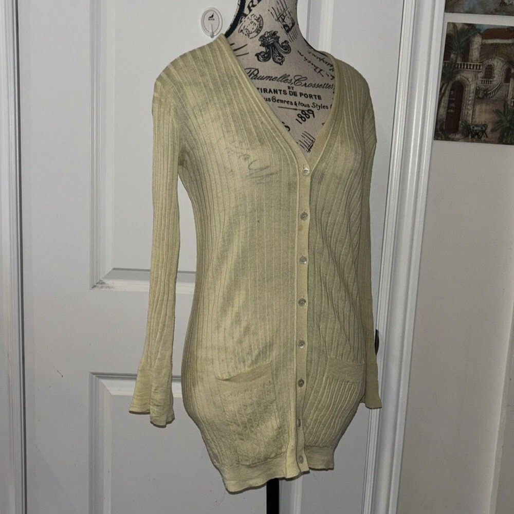 Made in Italy. Size Large but runs small, fits more like an Xs/S. Wool silk blend. Soft, lightweight and stretchy. Burberry Prorsum Yellow Virgin Wool Ribbed Cardigan. Front button closure. V-neckline. Tonal stitching. Condition: This item is in fair pre-loved condition with visible signs of wear throughout. Pilling throughout