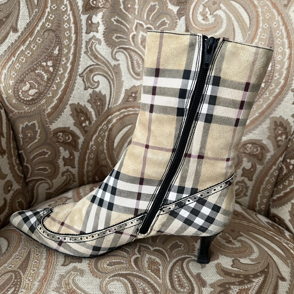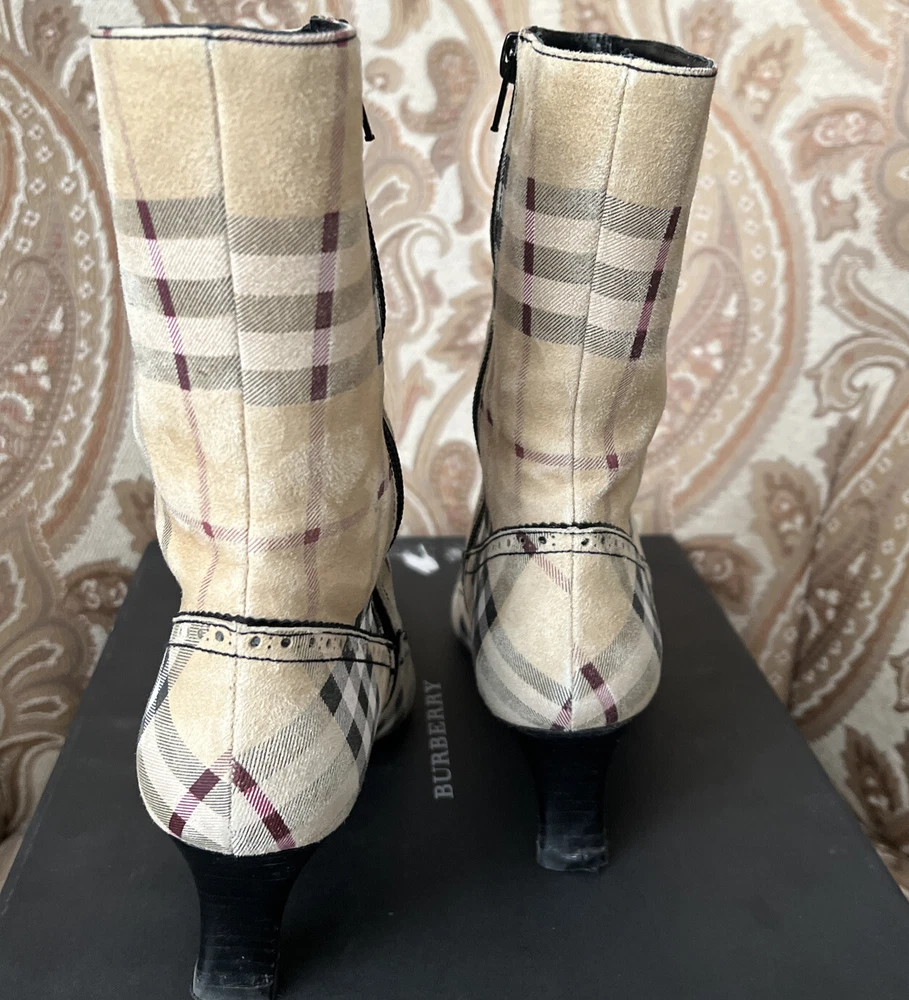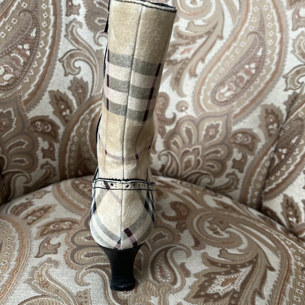 Type: Boot UK Shoe Size: 4 Theme: Designer Shoe Shaft Style: Mid-Calf Character: Boots, Nova Style: Nova Check Closure: Zip Model: BURBERRY Nova Heel Height: Mid (2-2.9 in) Department: Women US Shoe Size: 7 Lining Material: Leather Color: Multicolor Outsole Material: Leather Pattern: Check Upper Material: Suede Toe Shape: Pointed Toe Occasion: Business, Casual, Party/Cocktail, Travel, Wedding Brand: Burberry Heel Style: Kitten