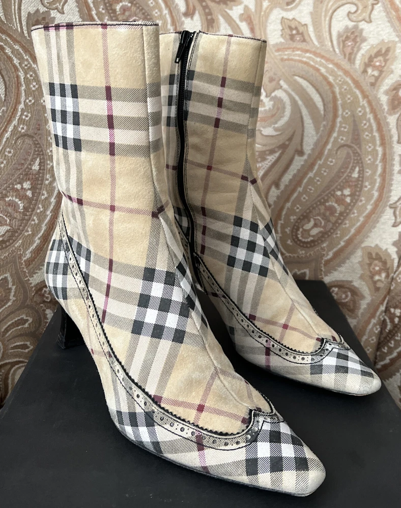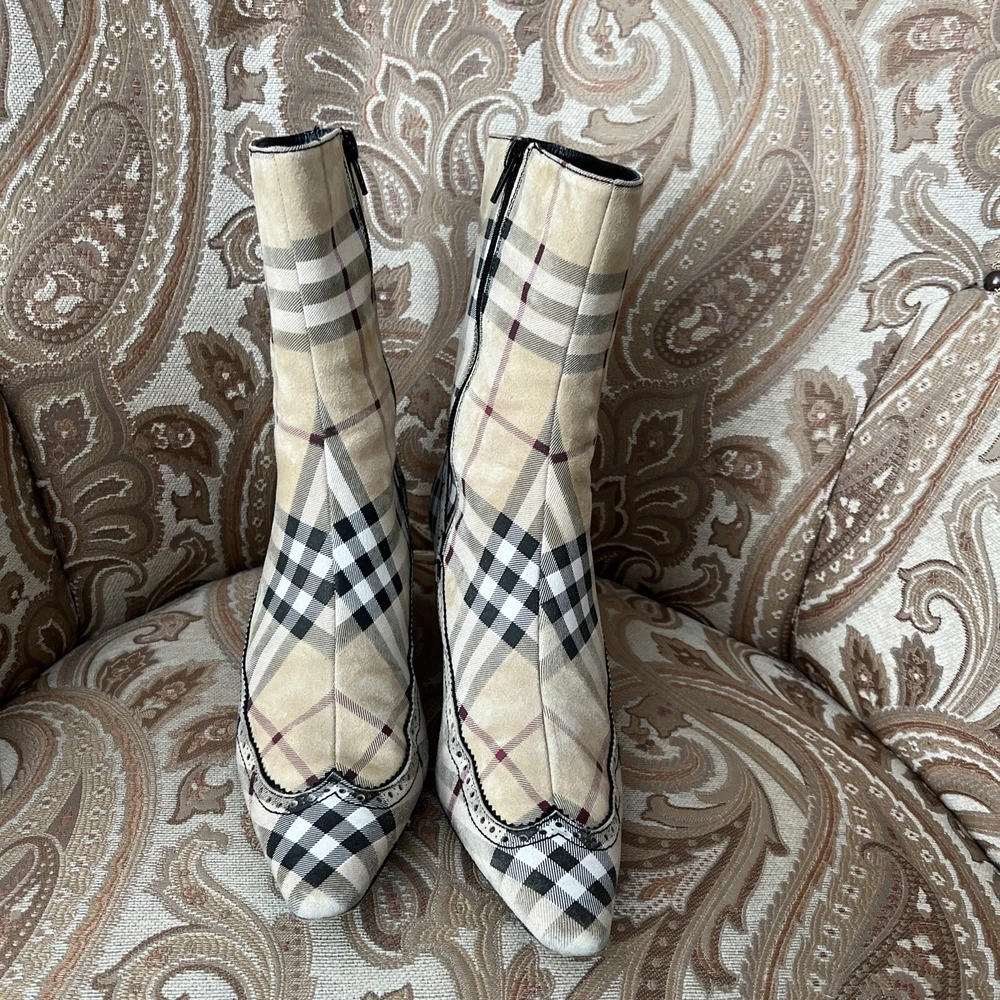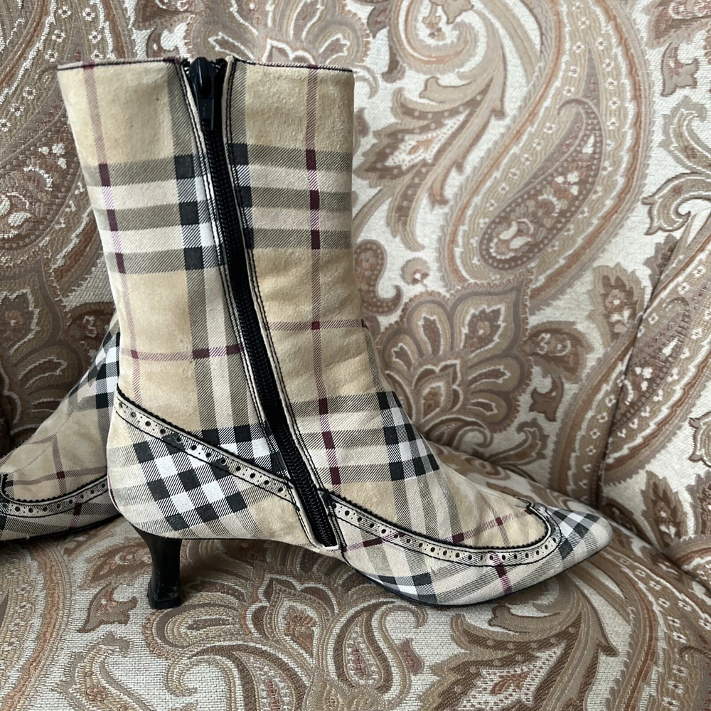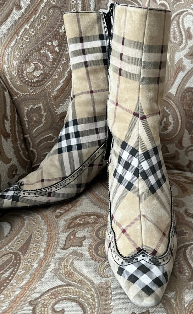 Type: Boot UK Shoe Size: 4 Theme: Designer Shoe Shaft Style: Mid-Calf Character: Boots, Nova Style: Nova Check Closure: Zip Model: BURBERRY Nova Heel Height: Mid (2-2.9 in) Department: Women US Shoe Size: 7 Lining Material: Leather Color: Multicolor Outsole Material: Leather Pattern: Check Upper Material: Suede Toe Shape: Pointed Toe Occasion: Business, Casual, Party/Cocktail, Travel, Wedding Brand: Burberry Heel Style: Kitten