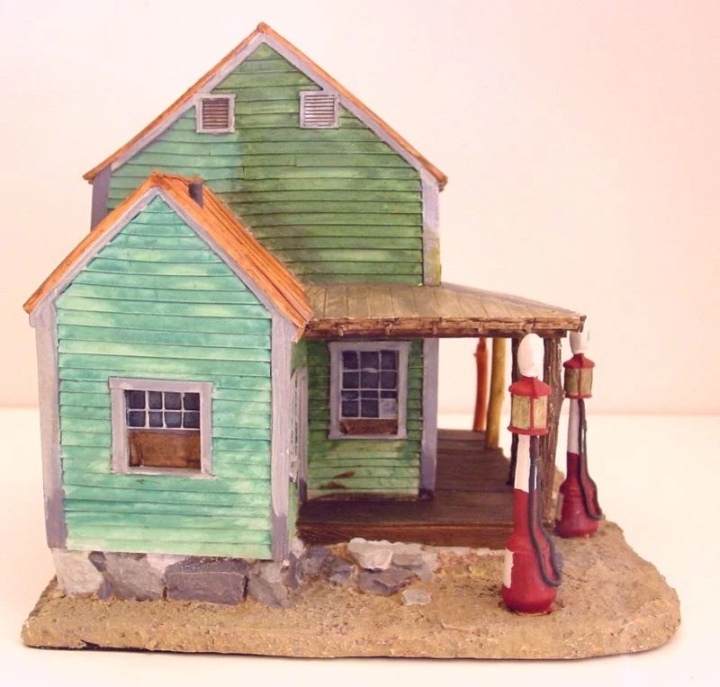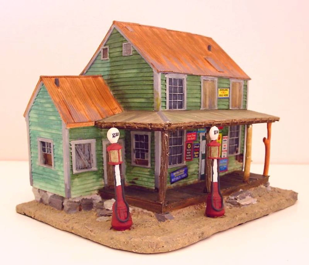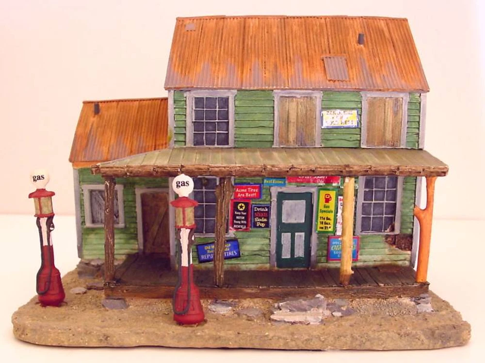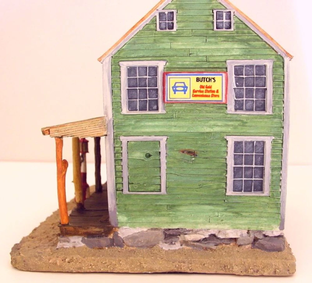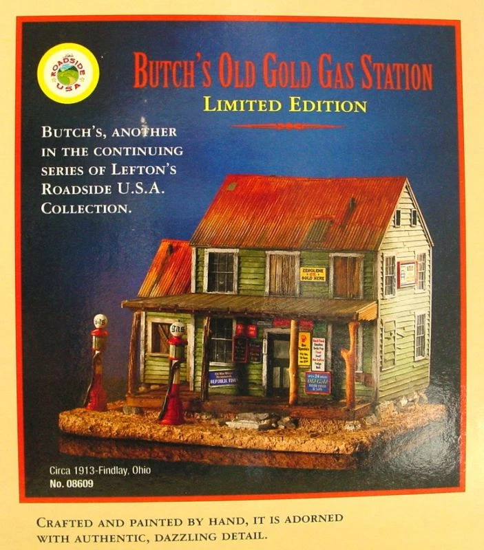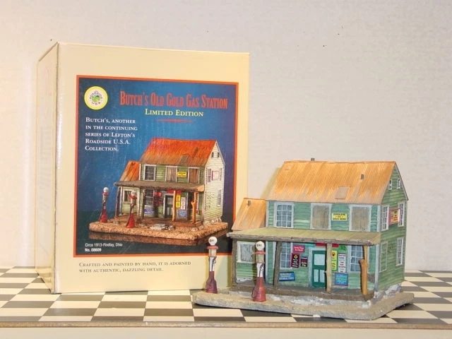 Butch's Old Gold Gas Station - Circa 1913 - Findlay, Ohio From the Limited Edition Roadside USA Collection by Lefton . Item #08609. Also part of the Lefton's Roadside USA - Service With a Smile: America's Gas Stations collection. Copyright Geo Zoltan Lefton Co. and GT Notions Resin. Made in China . Dated: 1994 on box Size: 7" tall x 8.5" wide x 6.5" deep (close to O scale?) Not a 'kit' - a 1 piece building. Condition: Resin. Never used, never displayed, no chips, no defects, no crazing. PLEASE NOTE; The gas pumps are packed separately and use a drop of glue to hold in place. I'm sure you will put them in a little straighter than I did on my display. Your valuable collectible is well packed, protected and in great shape. This item comes in original box with very minor wear from being in a retail storeroom warehouse - still great for gift-giving! From the box: "When the first model T rolled off the assembly line, American life rolled off in a whole new direction. In fact, it changed the American way of life forever. Gas stations sprung up on the newly paved highways: not the sterile, impersonal self-service station we have today. In those halcyon days (when the service station attendant not only filled the tank, but washed your windshield, checked your oil and put air in your tires), each station was an architectural marvel. In addition to filling your tank, these bygone stations were also rest stops where you could enjoy a cold drink on a hot summer's day or a good cup of coffee to wake you up. The friendly proprietor would provide, at no extra charge, directions and a road map when it seemed that you were hopelessly lost. This was a simpler time in America, but nonetheless exciting. Just four little words, "Let's take a ride," brought an enthusiastic "Let's go!" from the entire family. So come on, let's take a ride. Join the adventure of traveling along Roadside, USA!" This general store has all the charm and nostalgia of your friendly neighborhood one-stop shop. Based on an actual business in Findlay, Ohio, around 1913, this store has a beautiful rustic image, from the deep green wooden siding to the rusty tin roof. The store is two stories with a wide wooden awning over the porch. Signs to either side of the door beckon to passing motorists and pedestrians: "OPEN 24 HOURS OLD GOLD GOOD FOOD & GAS - REST ROOMS - OLD MAN MILAGE RECOMMENDS REPUBLIC TIRES - GOOD FOOD/CANDIES/SODA POP/FEED/SNUFF/HOT COFFEE/FUDGE/BAIT", just to name a few. Two red gas pumps wait outside, with brilliant white globes on top. From the rough timbers holding up the awning to the big stone foundation, from the weathered look of the wooden siding to the crooked signs, this rustic general store and gas station has incredible detail and heartwarming charm. Check out my other listings for more from this fantastic Limited Edition line, as well as Lefton's Diners, Spectacular Vernaculars, Big Boy, and Kentucky Fried Chicken restaurants. Combine shipping on several items and save money! Check out my other listings for a variety of 50’s Diner & Soda Fountain Decor and Necessities – Rock ‘n’ Roll – TV & Music Memorabilia – American Roadside Salt & Pepper Shakers – Advertising Signs – Beatles – Elvis – Pink Flamingos – Betty Boop Gnomes - Victorian and Garden Accessories - Pinball and Jukebox Parts Many items are new in the box and perfect for gift-giving! Most are out of production and very collectible!