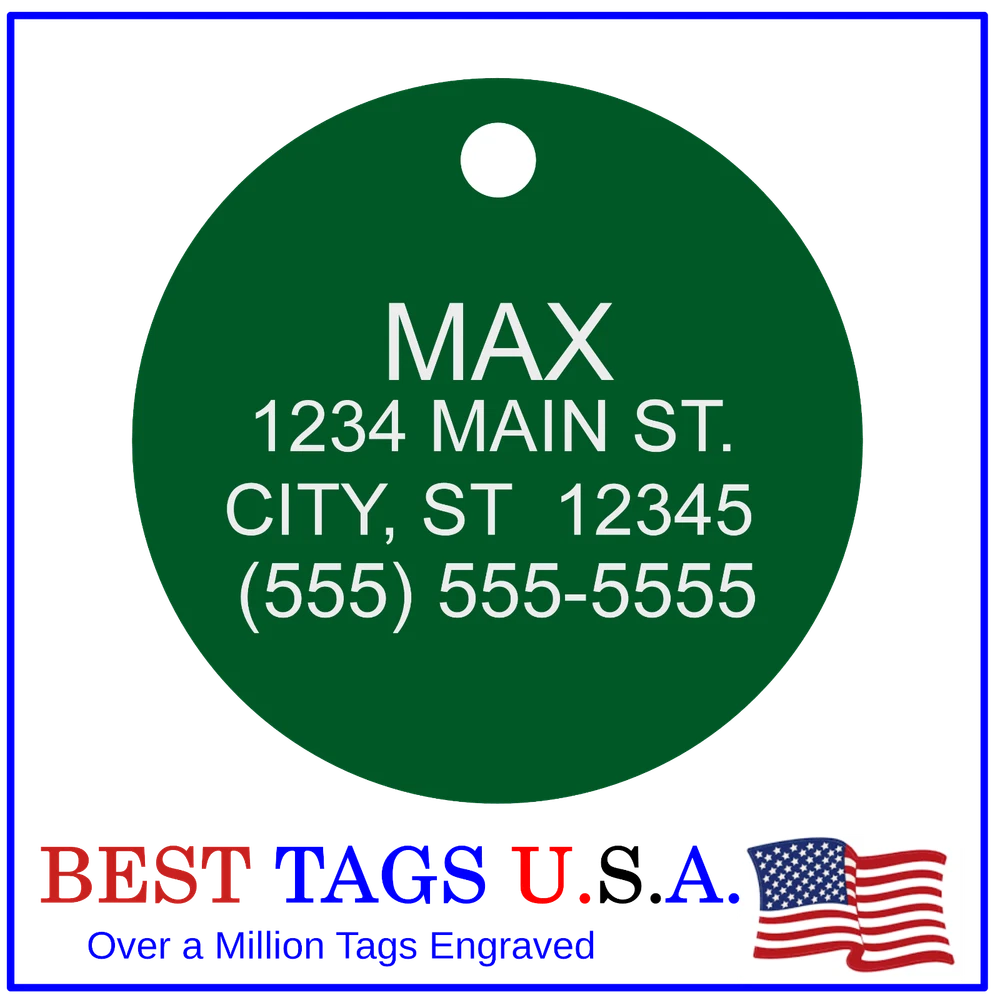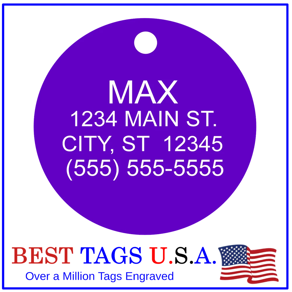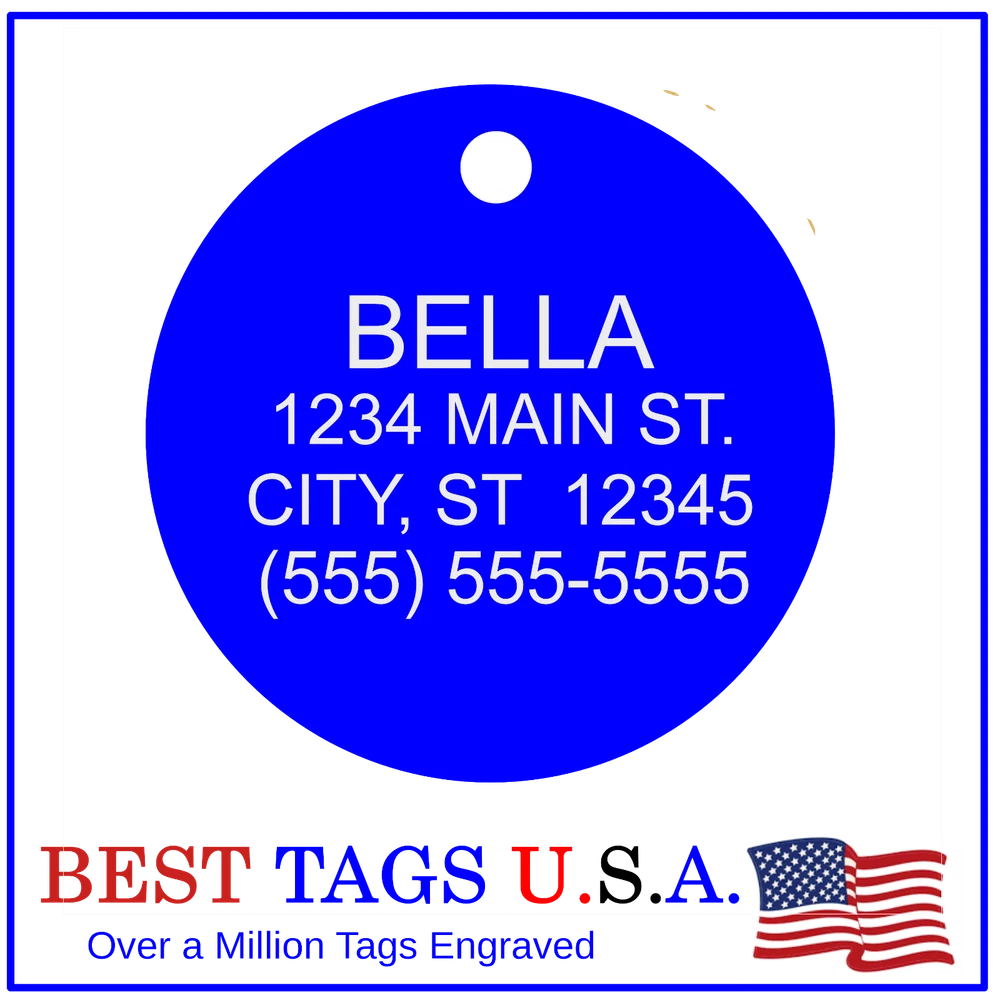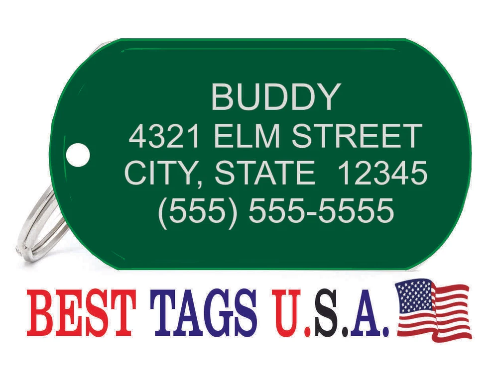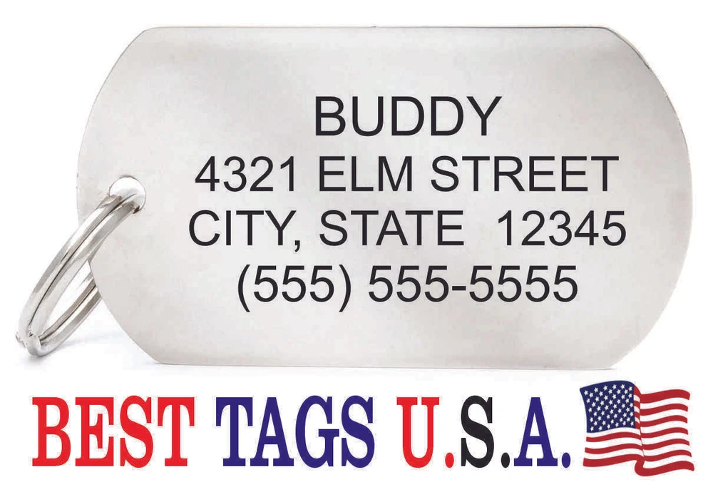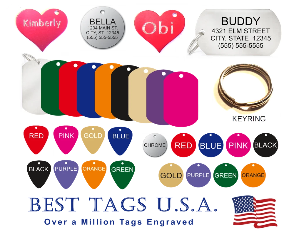 BEST TAGS PERSONALIZED- ENGRAVED WITH REFLECTIVE SAFETY TEXT M A D E I N U. S. A. >>>WE SHIP USPS WITH TRACKING<<< NOTE: Tags are engraved and shipped Friday of each week. Handling time will vary from 1 to 7 days, depending on what day you order. YOUR CHOICE OF: MILITARY DOG TAG (2" x 1.1") 1" Diameter Small CIRCLE 1.5" Diameter Large CIRCLE GUITAR PICK (Standard guitar pick size) 1" HEART ALL TAGS INCLUDE A KEY RING UP TO 5-Lines of Text Engraved per side on Military & 1.5" Circles, 4-Lines on Guitar picks & 1" Circles, 3-Lines on Hearts 2-SIDED TAGS available in drop-down menu if you want engraving on both sides. DEEP DIAMOND ENGRAVED - THE BEST! -LONG LASTING- WON'T RUB OFF LIKE CHEAP LASER ENGRAVING OR INK STAMP =YOU CAN "FEEL" OUR ENGRAVING= TAGS ARE MADE OF LIGHT-WEIGHT DURABLE Anodized Aluminum HOW TO ORDER: 1. Above please select TAG , C O L O R and QUANTITY 2. ENTER your personalization text in the grey box above -OR- You can enter your engraving info at checkout in the Message to Seller BOX. please be sure to CLICK " Message to Seller" -- Or -- Use eBay " Contact Member/Seller " and send the tag information to us ( best_tags) Please read the tag parameters below: ( spaces count as characters ) Less is more on tags. Less Text = LARGER TEXT . 2-SIDED TAGS available in drop-down Please specify your engraving for FRONT and BACK sides, otherwise we will engrave the same info on both sides. Military Style Dog Tag: up to 5 Lines, 24 characters maximum per line Large 1.5” Circle: up to 5 lines, 20 characters maximum per line Small 1” circle: up to 4 lines, 16 characters maximum per line Guitar Pick: up to 4 lines, 14 characters maximum on LINES 1 & 2, (12) on LINES 3 & 4. Heart: up to 3 lines, 14 characters maximum per line Please check for accuracy *We engrave exactly how you enter your text. *Sometimes we need to make layout adjustments to make your tag look its BEST and will contact you if it's a big change. If you don't want engraving enter "blank" 3. Click "Buy It Now" and proceed to check out. 4. At the CHECK OUT Screen *Review items and engraving info If you have a problem at checkout DO NOT CANCEL YOUR ORDER . Please message us directly. We are always on the lookout and i f we don't receive your engraving information, we will contact you. If you have ANY problem during your transaction, Please don't open a case until you message us directly and give us a chance to resolve it. We will take care of it. Your satisfaction is VERY important to us. ***We offer DISCOUNTS on Larger QUANTITY orders. Contact us for the BEST PRICE Tags are deep engraved which means that our engraving machine cuts into metal for a tag that will last. The color of the engraving is reflective silver or metal. Engraving on chrome and gold tags tends to be inconspicuous (blends into the tag more) The text on engraved tags can appear black, white, grey or silver in different lighting. We do not engrave emoji's or special characters. Thank You For Supporting American Manufacturing We really appreciate your business! C ustom Pet Tags, Military Dog Tag, Personalized Dog ID Tags Aluminum Dog Tags & Charms, Dog ID Tags, Engraved ID Tags, Pet Tags with Engraving, Pet Tags Dog Tags, Cat Tags, Cat ID Tag, Dog Tags and Charms, Pet Tags Dog Supplies, Cat supplies, Pet supplies, Blank Dog Tag, Blank Pet Tag, Blank Cat Tag, cat tags personalized, name tag, name tags, name bade, custom engraved, custom engraving