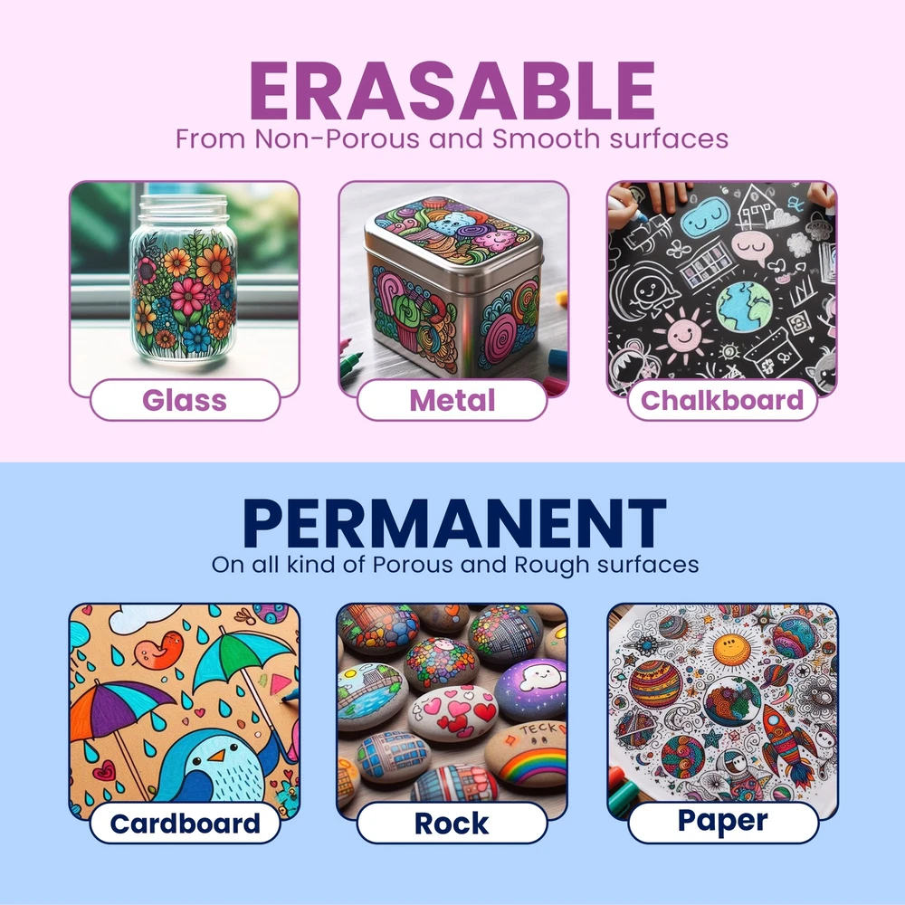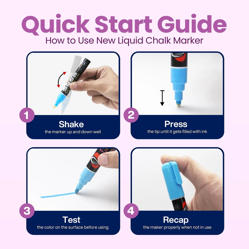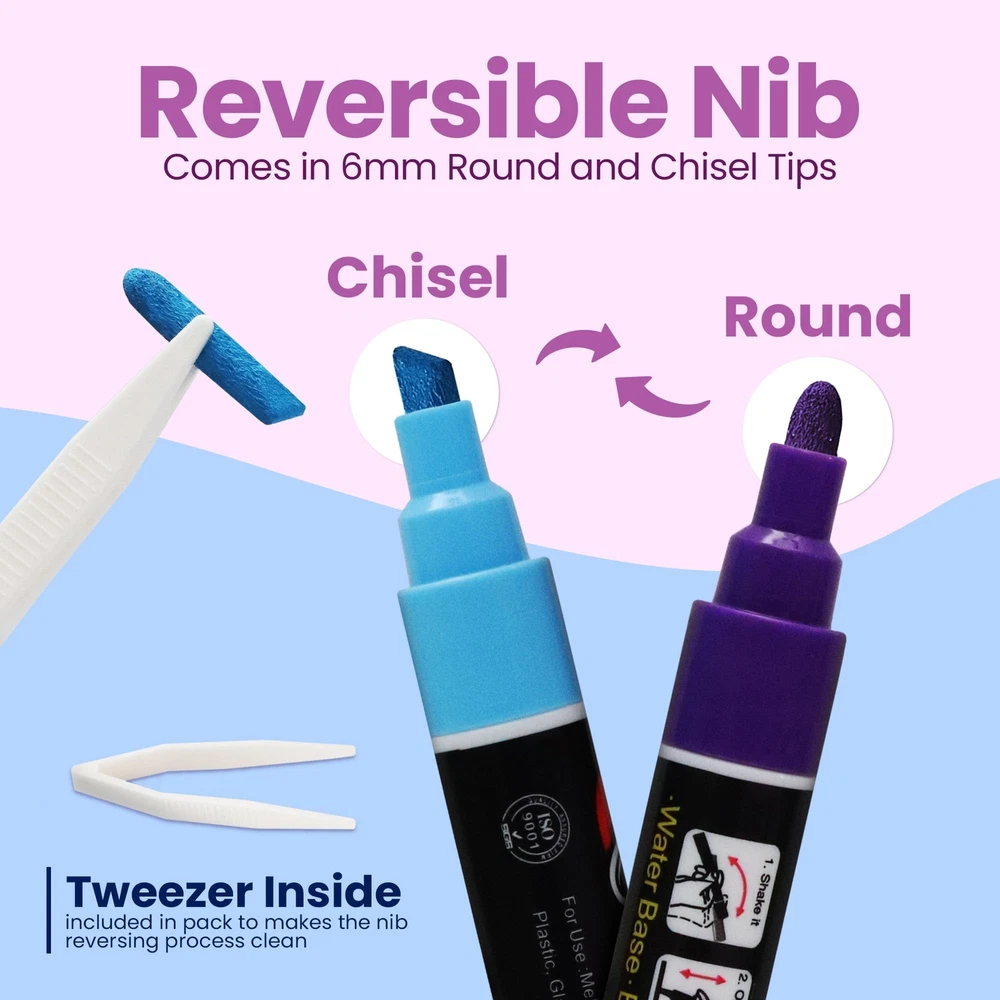 Say goodbye to the dusty chalks! These 8 pack chalk markers are bold & bright due to the highly concentrated, non-toxic, odorless, pigment in the ink With regular chalk, you are limited to the confines of your chalkboard. With these wipeable pens, you can turn any non-porous surface – including mirrors, storefront windows, black dry erase board, metal, & more – into your very own canvas Your lines will be smoother and sharper due to our two-sided 6mm reversible tip feature - a round tip on the one side for fine writing and a chisel tip on the other for bold writing To erase them, a damp cloth is usually all it takes. However, on porous surfaces (non-erasable), some of the pigment can get absorbed We value every one of our customers, and here to answer your concerns. Not satisfied? Get a 100% refund - Customer satisfaction is above ALL