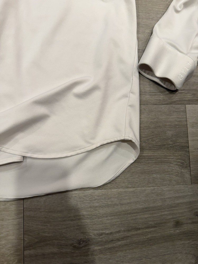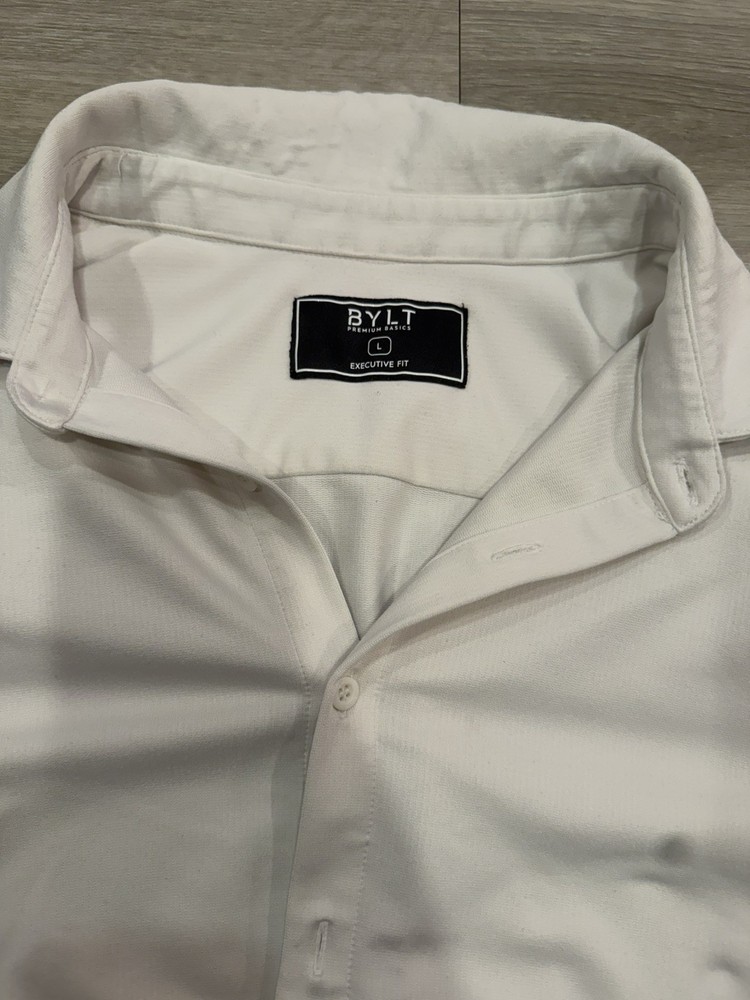 BYLT Basics Premium Executive Stretch Long Sleeve Button Down Shirt in a clean white colorway. Designed for modern professionals, this shirt delivers a polished, tailored look with performance stretch fabric that keeps you comfortable all day. The Executive Stretch fabric offers lightweight breathability, moisture-wicking properties, and a smooth, wrinkle-resistant finish. Ideal for office wear, business casual, formal settings, or date nights. Designed to look sharp whether worn tucked or untucked. Features: • Premium Executive Stretch fabric • 4-way stretch for comfort and mobility • Moisture & sweat-wicking • Stay-cool breathable technology • Wrinkle-resistant / easy care • Executive Fit (tailored, modern silhouette) • Can be worn tucked or untucked • Button-down long sleeve design ⸻ Condition: Pre-owned in very good condition. No holes or stains observed. Light natural wear with minor marks consistent with normal use. Please review all photos for exact condition and color tone. ⸻ Item Specifics: • Brand: BYLT Basics • Style: Executive Stretch Long Sleeve Button Down • Size: Men’s Large • Fit: Executive Fit / True to Size • Color: White • Sleeve Length: Long Sleeve • Fabric Type: Stretch Performance Fabric • Material: 91% Polyester, 9% Spandex • Occasion: Work, Business, Formal, Office, Date Night • Pattern: Solid • Closure: Button • Care: Machine Wash Cold, Tumble Dry Low ⸻ BYLT Basics shirt, executive fit shirt, mens white button down, stretch dress shirt men, wrinkle free dress shirt, business casual mens shirt, office wear men, formal shirt men, premium basics shirt, modern fit button down