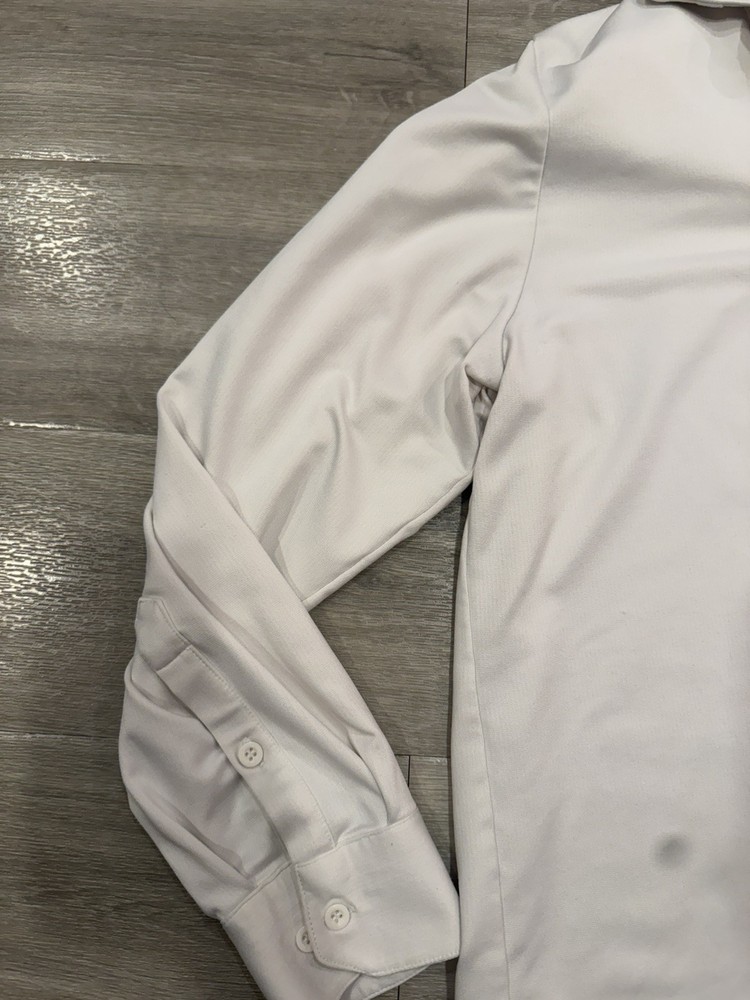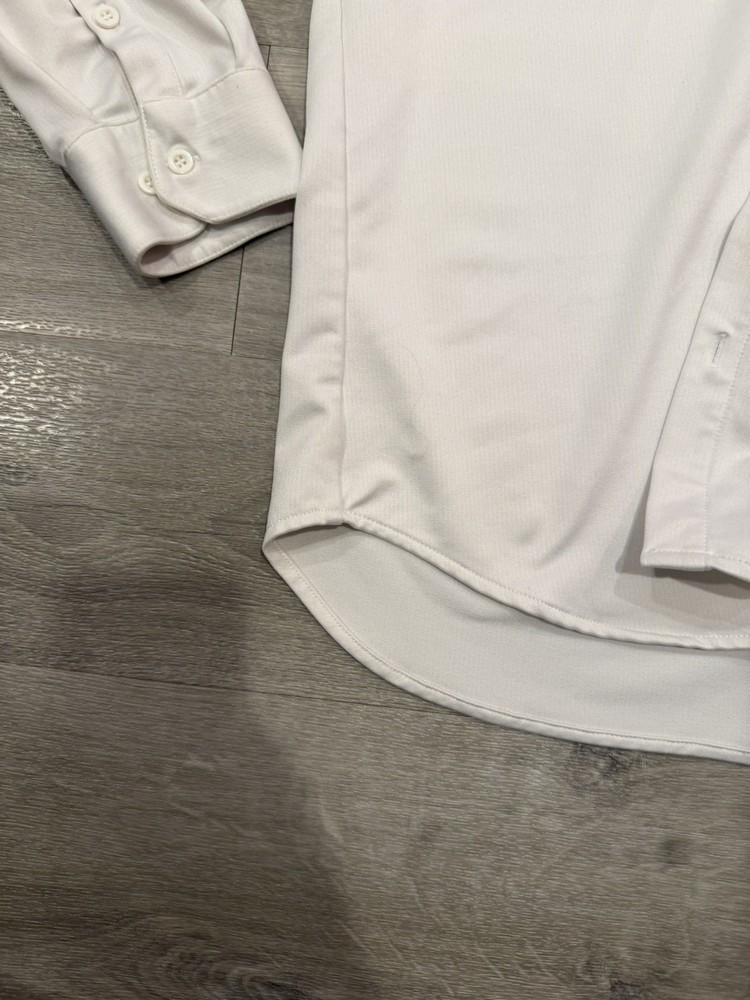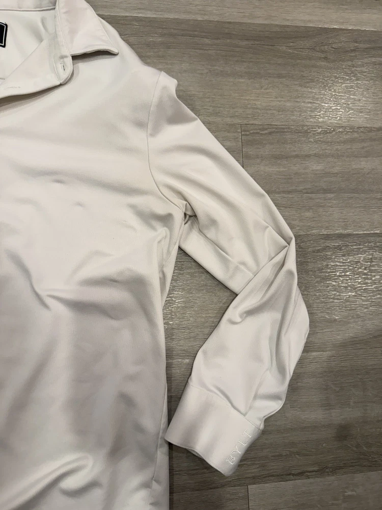 Accents: Button, Logo Closure: Button Sleeve Length: Long Sleeve Vintage: No Neckline: Collared Top Cuff Style: Barrel Cuff Fit: Executive Fit Pattern: Solid Brand: BYLT Type: Dress Shirt Material: Polyester, Spandex Shirt Length: 31 in Occasion: Business, Casual, Workwear Features: Stretch, Wrinkle Resistant, Easy Care, Moisture Wicking Size: L Garment Care: Machine Washable Chest Size: 22 in Color: White Fabric Type: Blended Fabric Collar Style: Point Personalize: No Department: Men Size Type: Regular Handmade: No