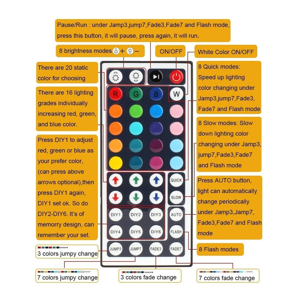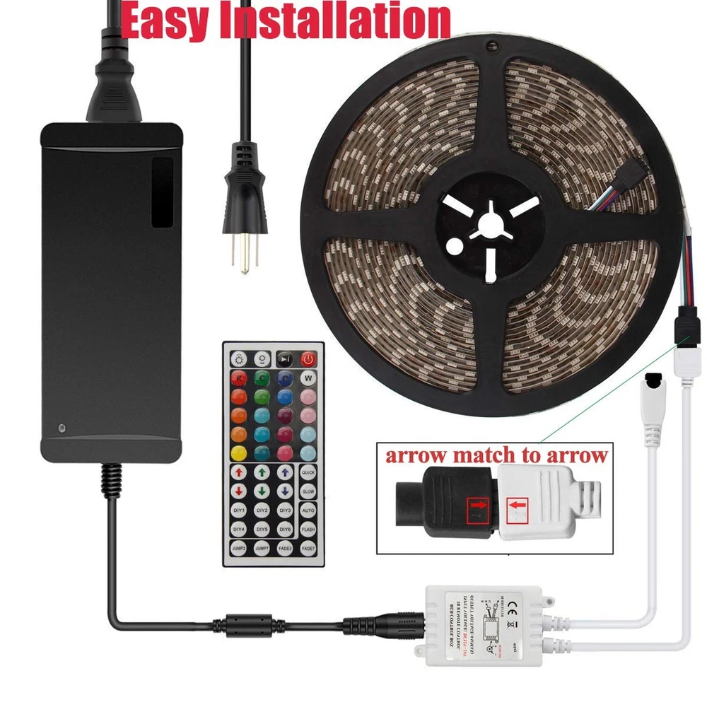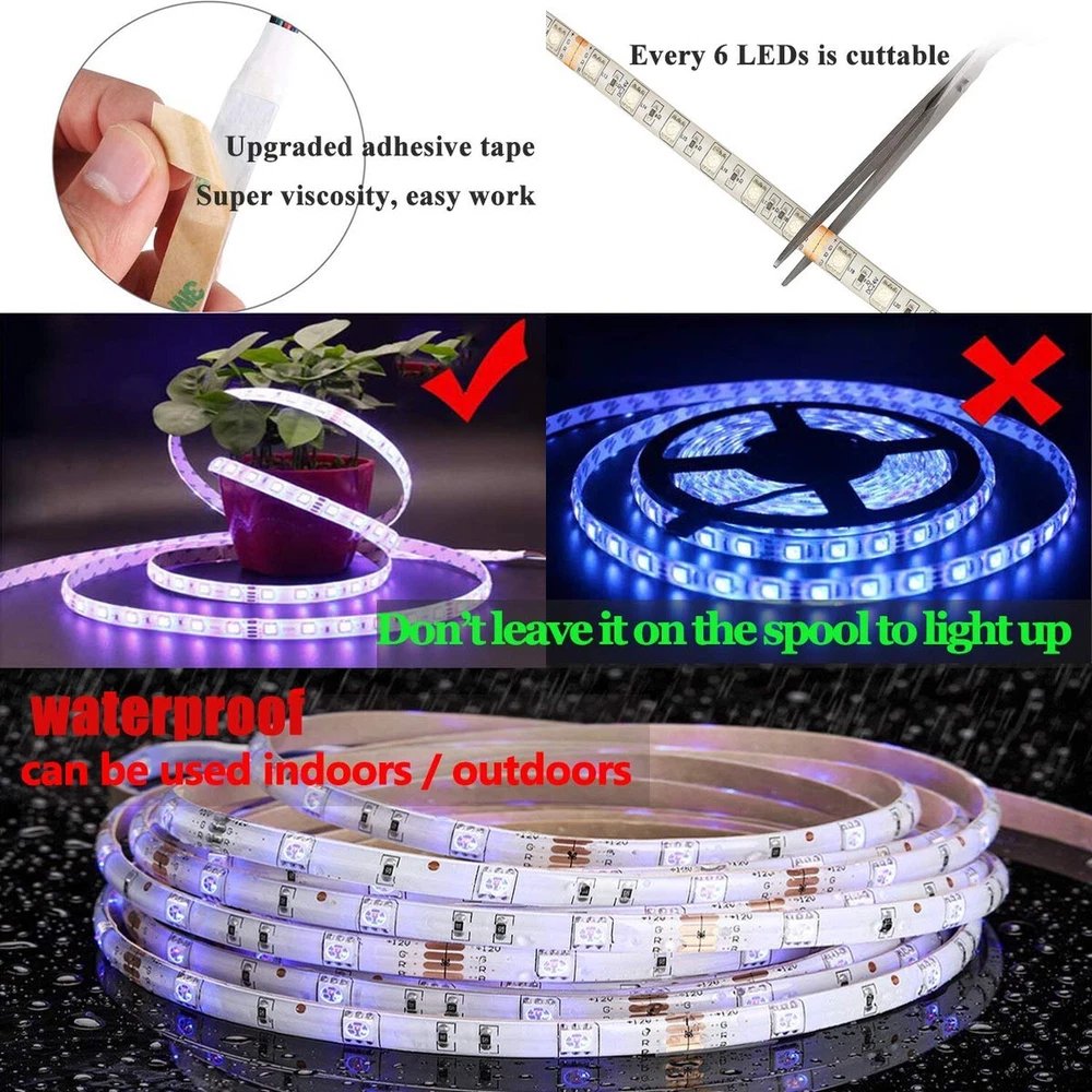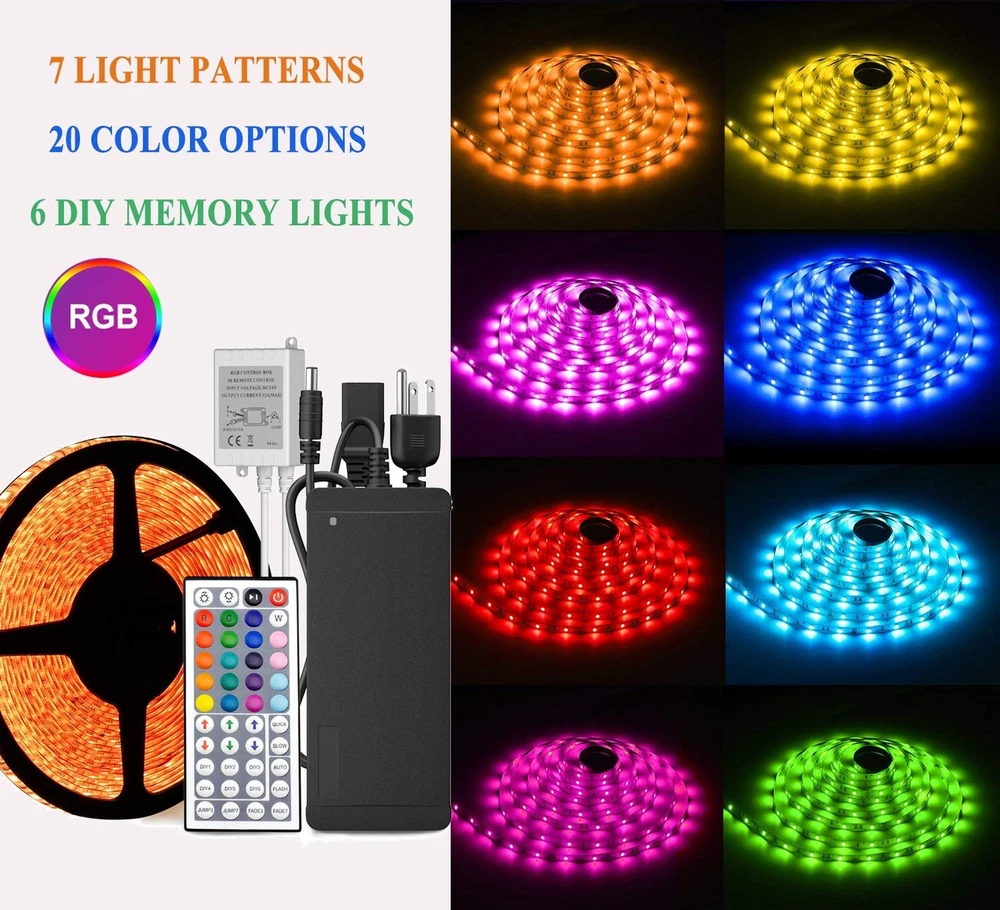 ♛LED Lights---Flexible continuous 32.8ft waterproof 600leds SMD 5050 RGB led strip lights, super bright color changing led lighting, extremely low heat, safe to touch ♛Multi-Color---LED tape lights set will change colors and speed automatically and periodically. 20 colors option and 8 light patterns. In addition to RGB (Red,Green,Blue), you also can use these 3 colors DIY to create a variety of romantic lighting effects ♛Easy Work & Quality---Self-adhesive back tape for easy application to any clean, dry and flat surface. 600Leds and built-in DC 24V Power Supply can solve the problem of the obscure luminous. Double layer copper PCB board can keep the mixed colors more even ♛Wide Use---Decorate any place and have fun with this light strips kit, suitable for indoor and outdoor lighting decoration, such as Kitchen, Room, Hotel, Car, Bar and DIY Design, ect ♛Package & Warranty---Include 1x 32.8ft led light strip, 1x 24V 5a power supply, 1x 44 keys IR remote. We are confident in the quality of our product and give you 100% money back within 30 days and 180 days replacement assurance